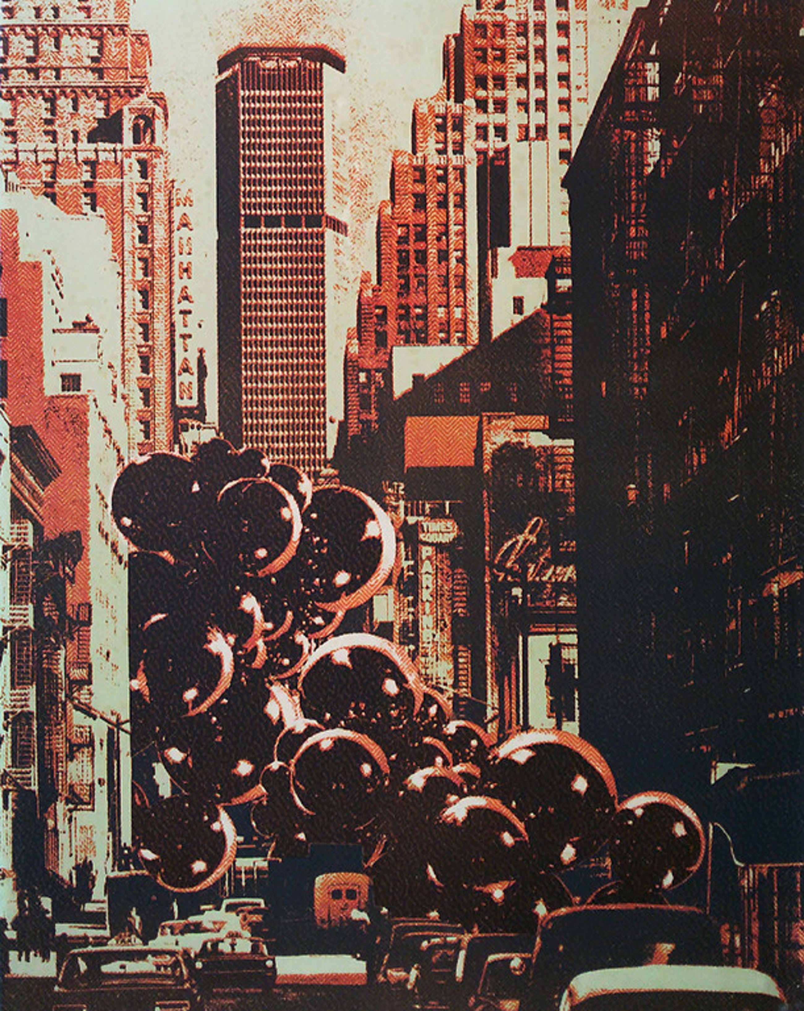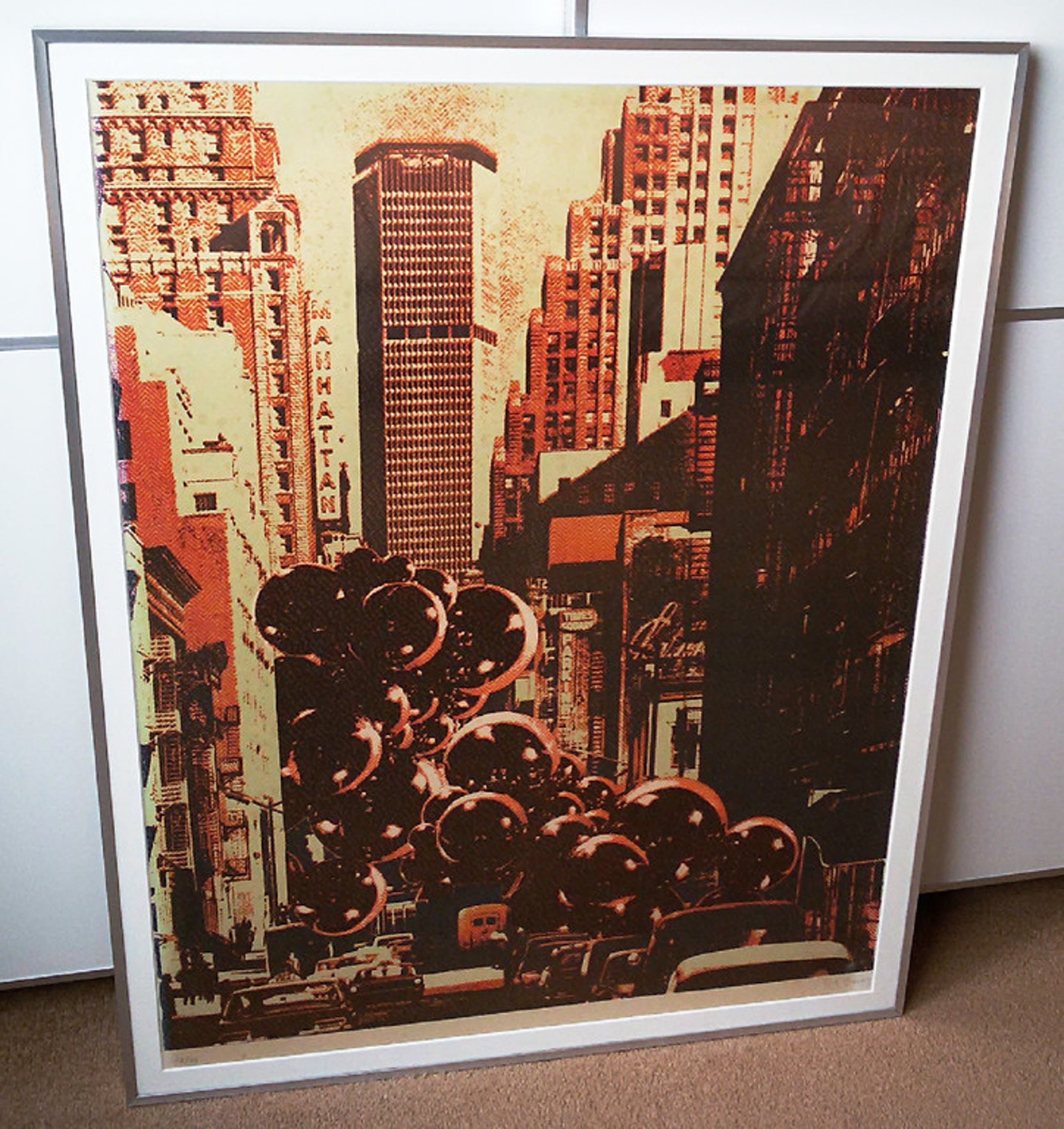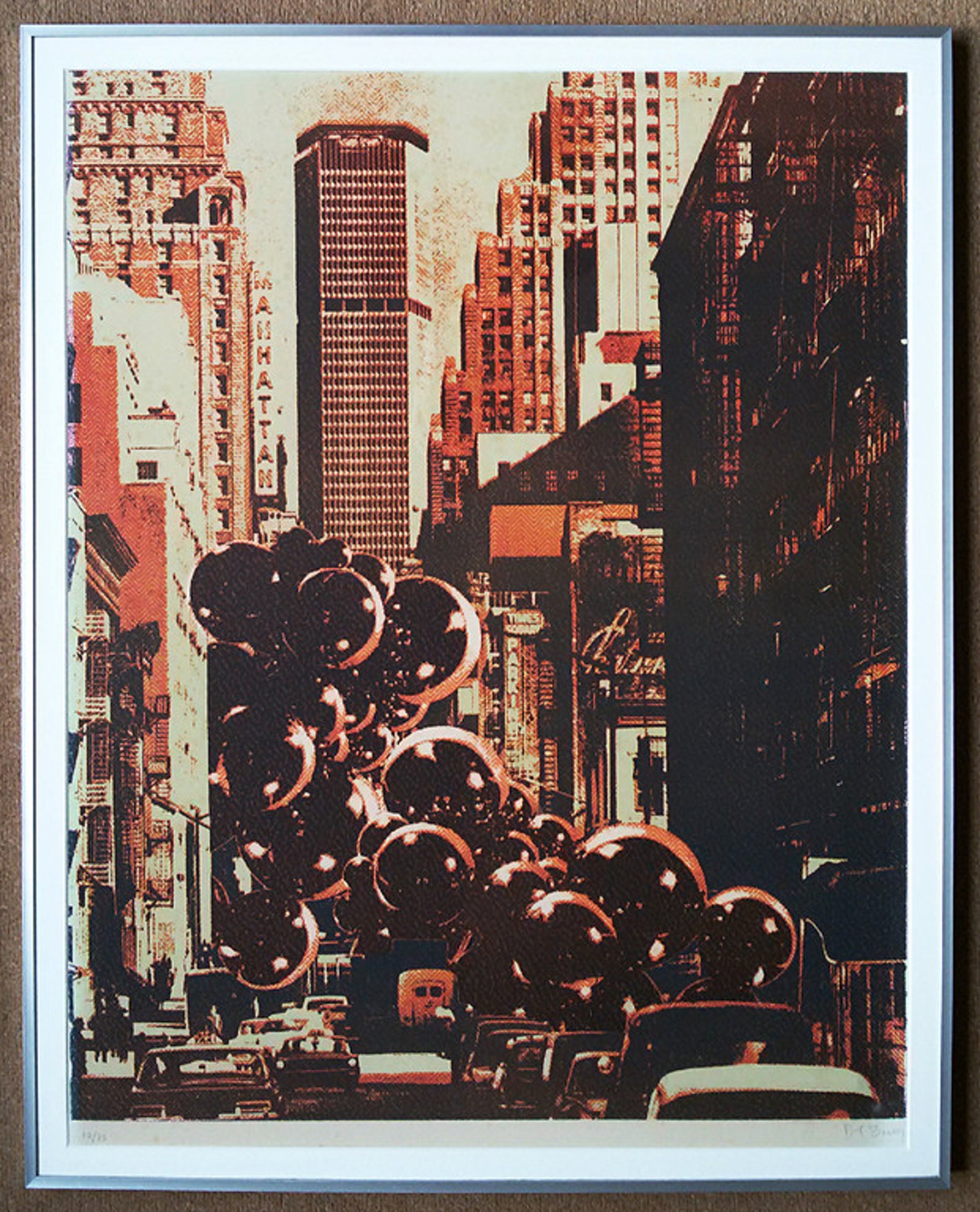 Iconisch werk uit 1971 van deze wereldberoemde Belgische kunstenaar. Bury gebruikte deze gigantische “bellen” in meerdere composities (o.a. Washington Bridge en in een overzicht vanuit de lucht van Manhattan). Deze litho laat het voormalige Pan Am gebouw zien vanuit East 44th Street.