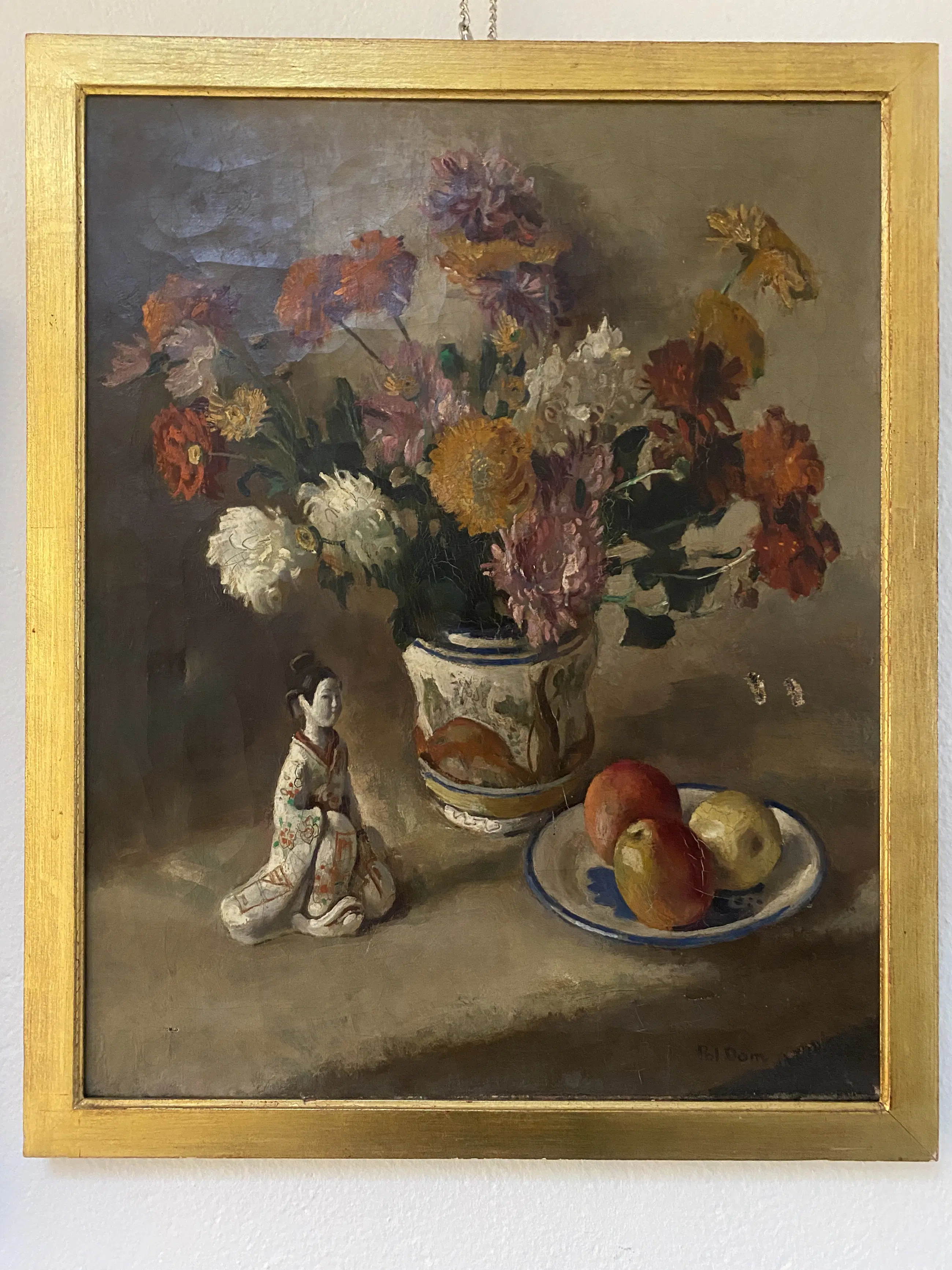 Pol Dom - Stilleven met bloemen, fruit en Chinees figuur
