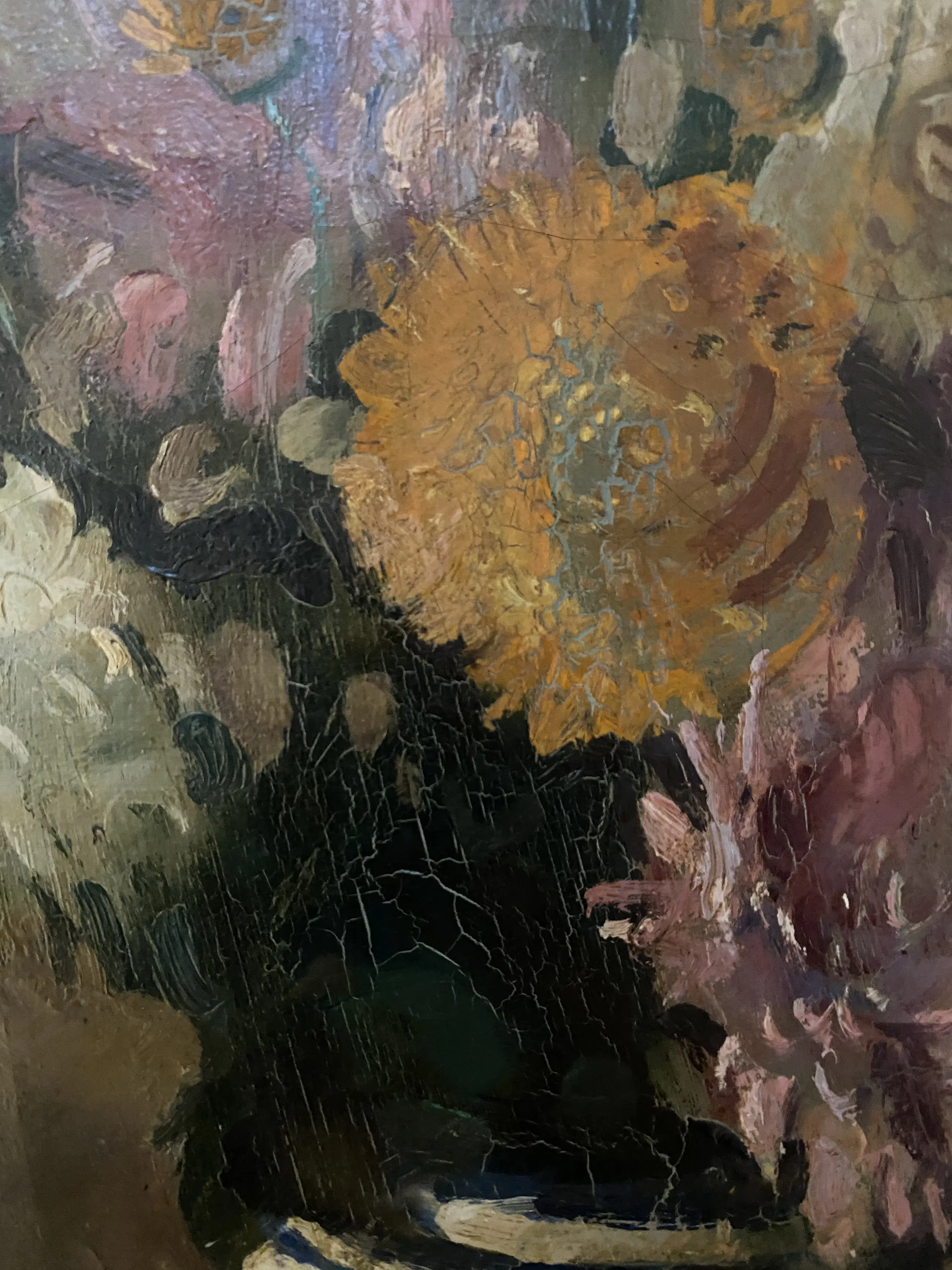 Ondanks kleine beschadiging in het doek (zie foto’s) verder in mooie staat.