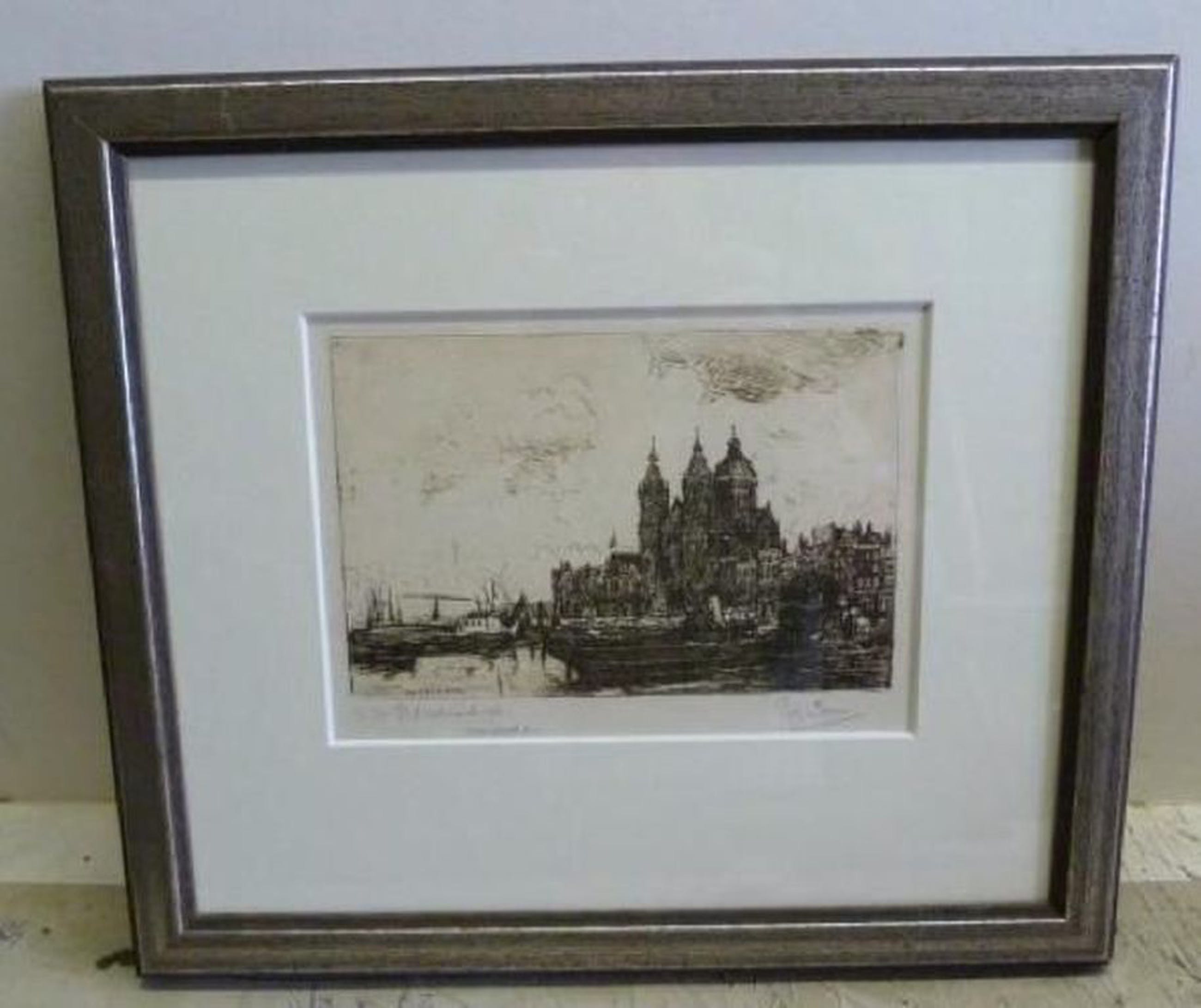 Zeldzame ets van Pol Dom met een voorstelling van de St. Nicolaaskerk in Amsterdam. Deze ets zien we niet zo vaak.