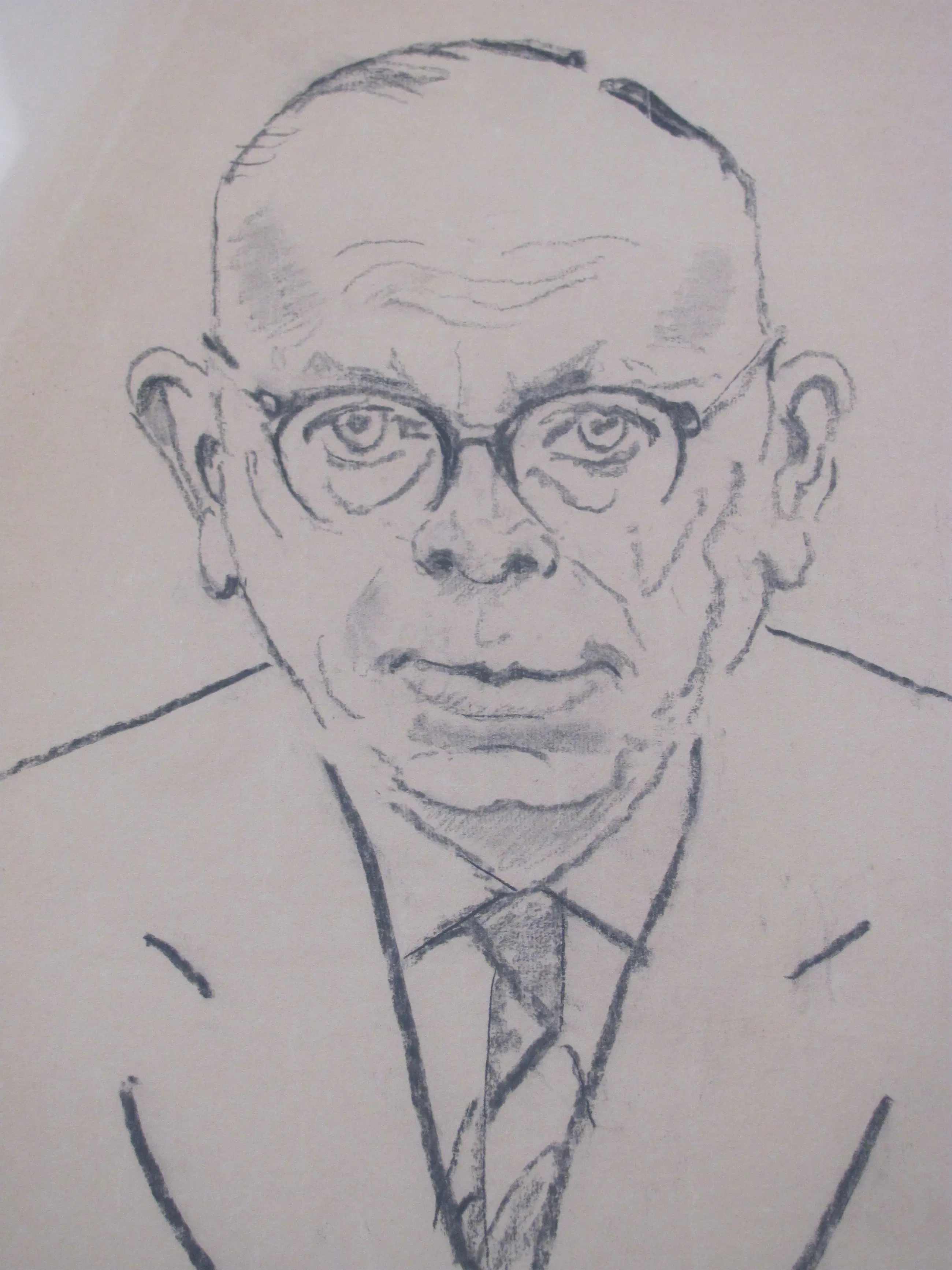 Portret in houtskool van een man, getekend en gesigneerd door Pol Dom. Mij is niet bekend of dit een zelfportret is, of een portret van iemand anders. Rechtsonder gesigneerd. Wanneer het werk is gemaakt, staat niet vermeld.
