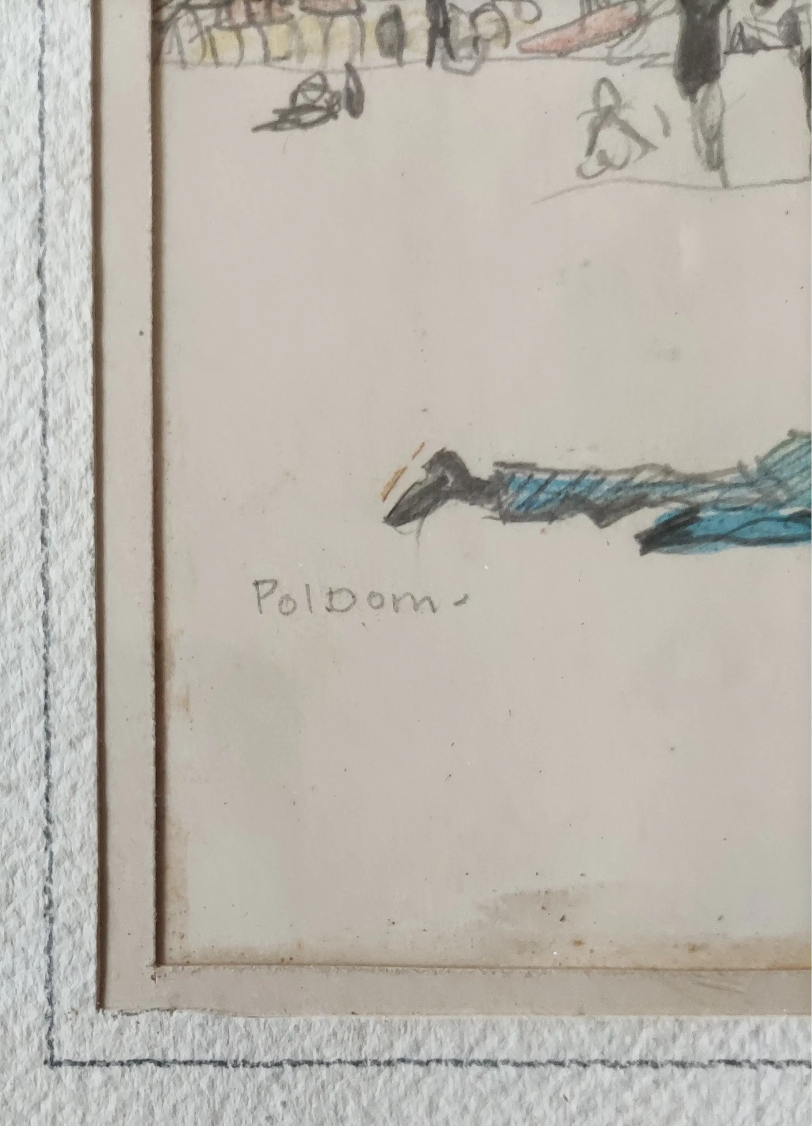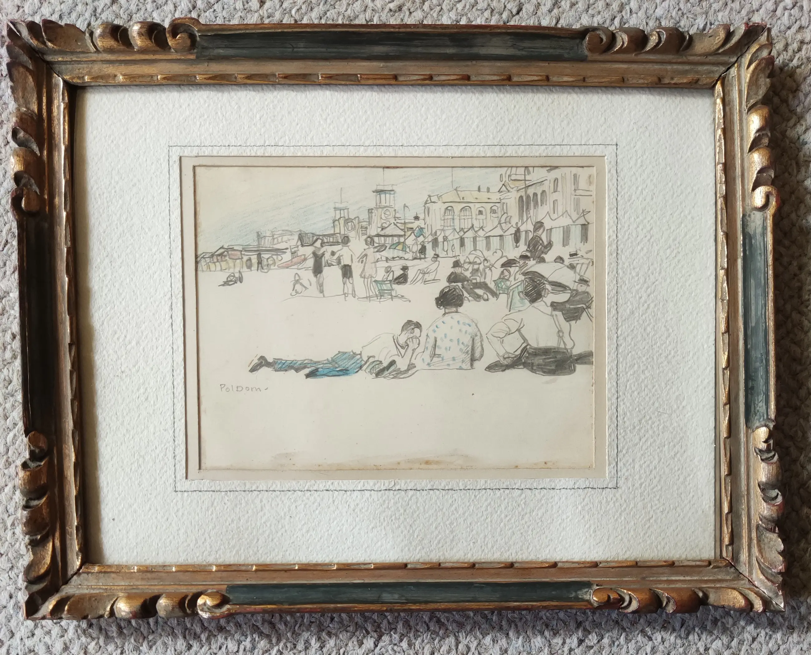 Fraaie potloodtekening in kleuren, voorstellende mensen op het strand bij Scheveningen.