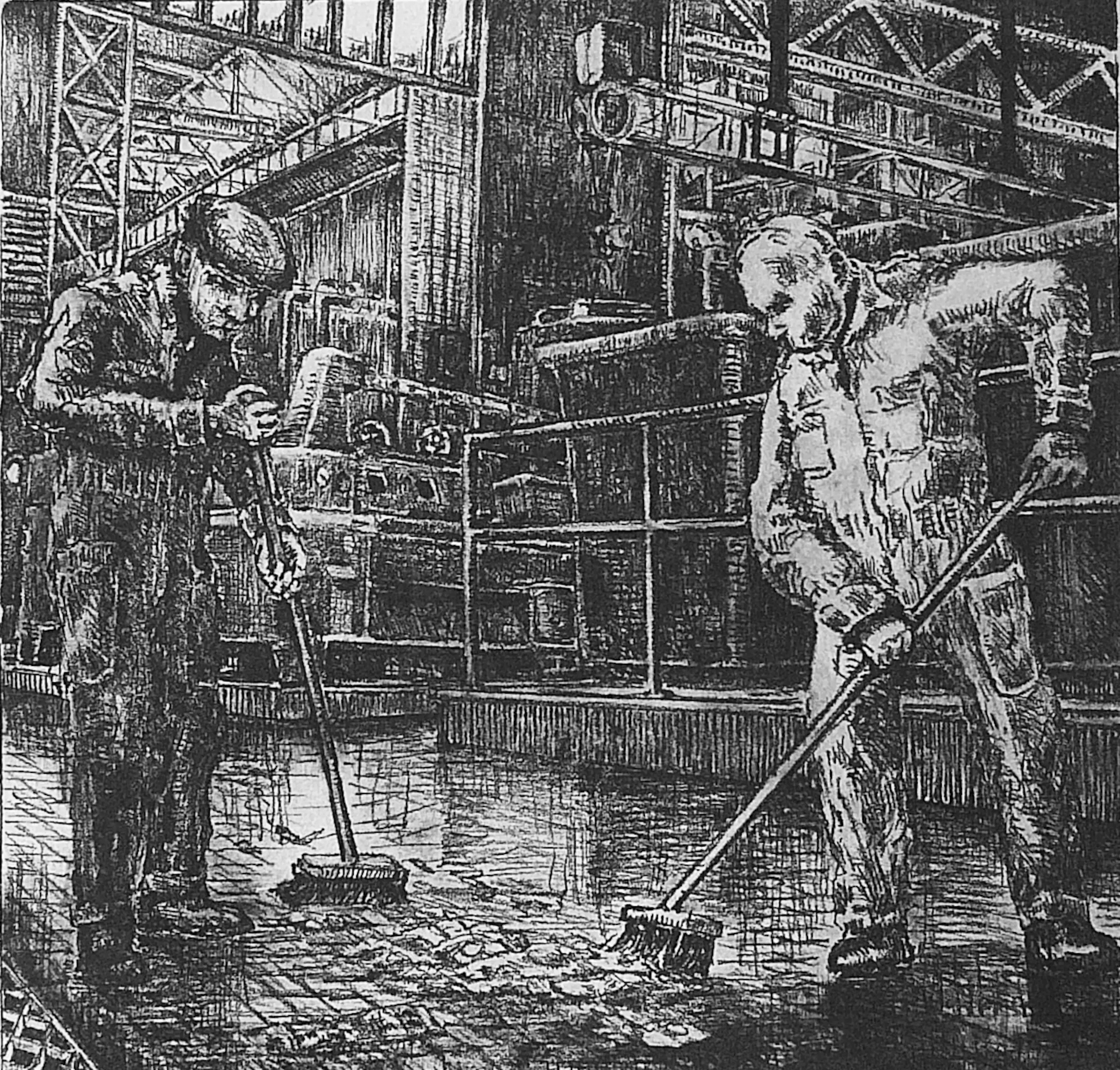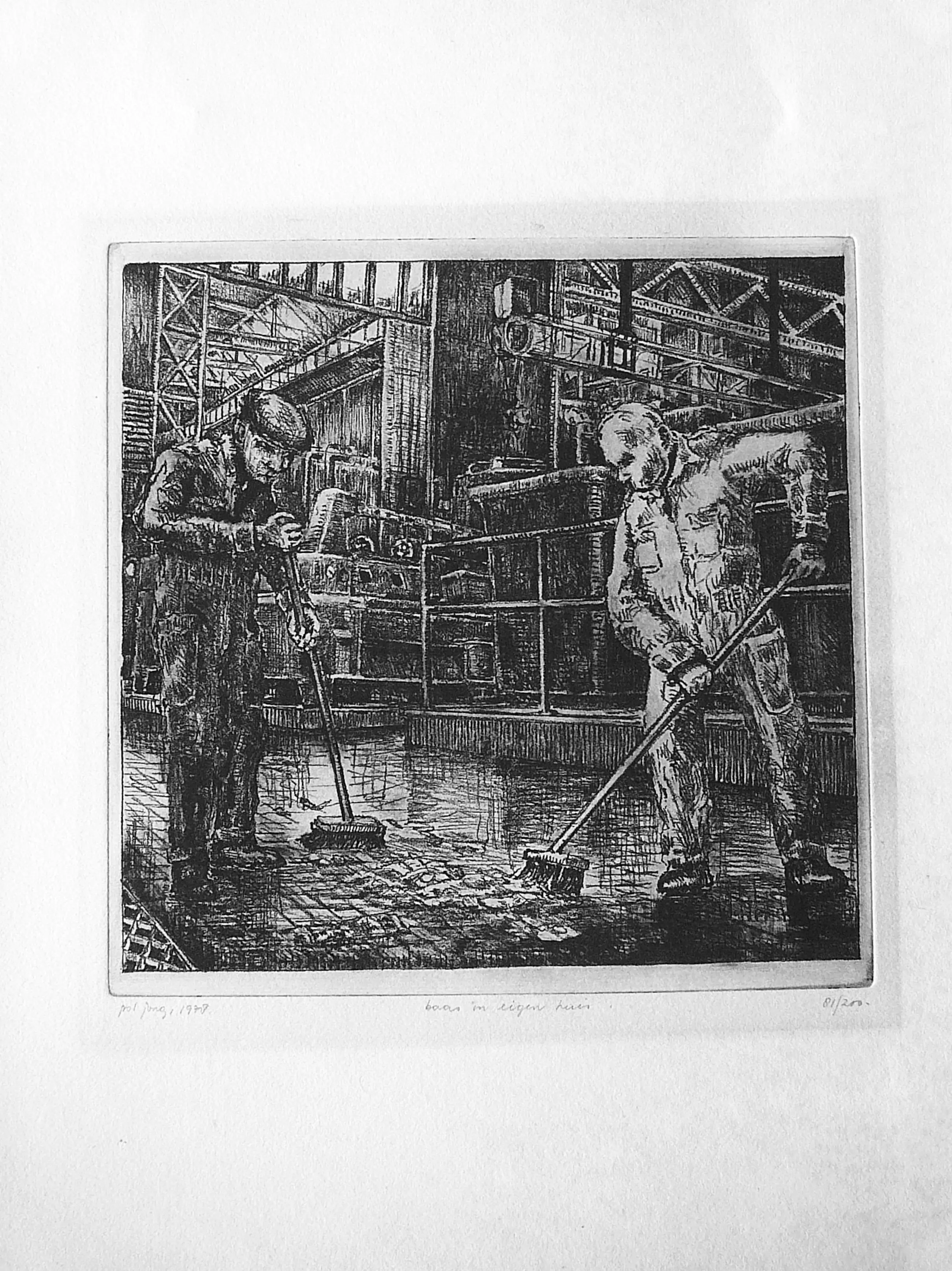 Karakteristieke ets van de hand van Pol Jong met een voorstelling van twee arbeiders in een fabriekshal. Lichte verkleuring rondom de randen van een voormalig passe-partout. Met potlood gesigneerd, betiteld, genummerd en gedateerd. Bladmaat 32x25 cm. Afbeelding 19x19 cm.