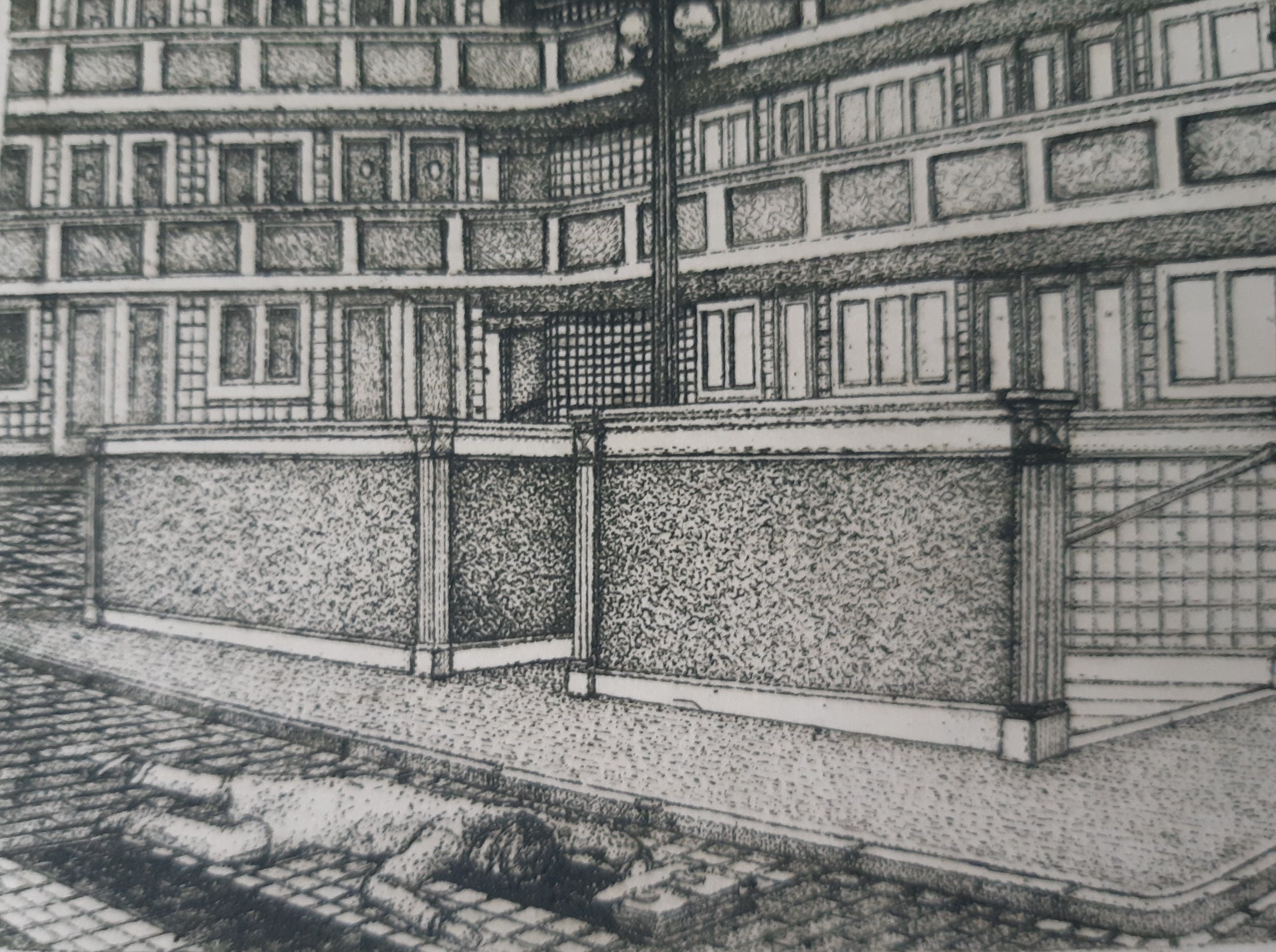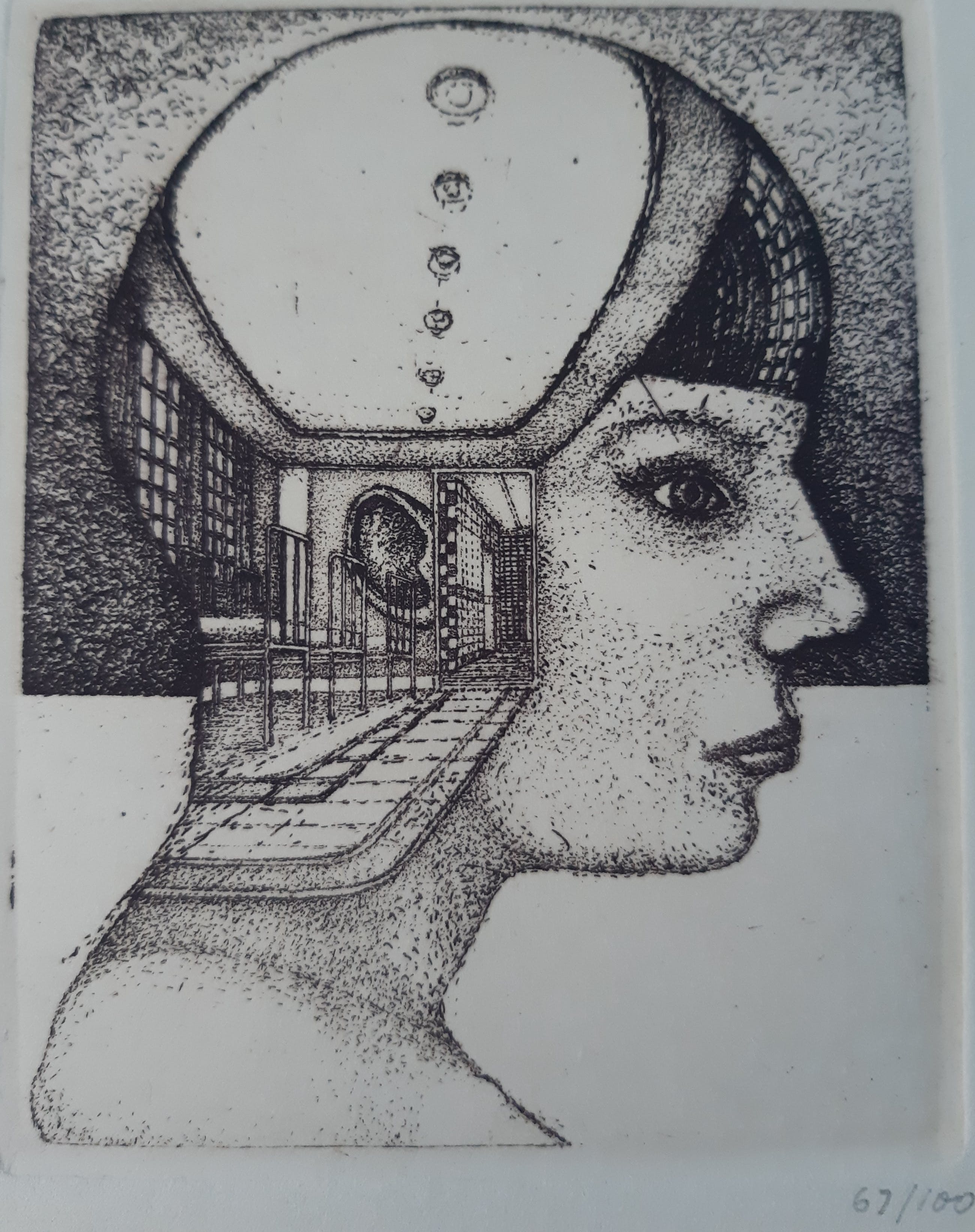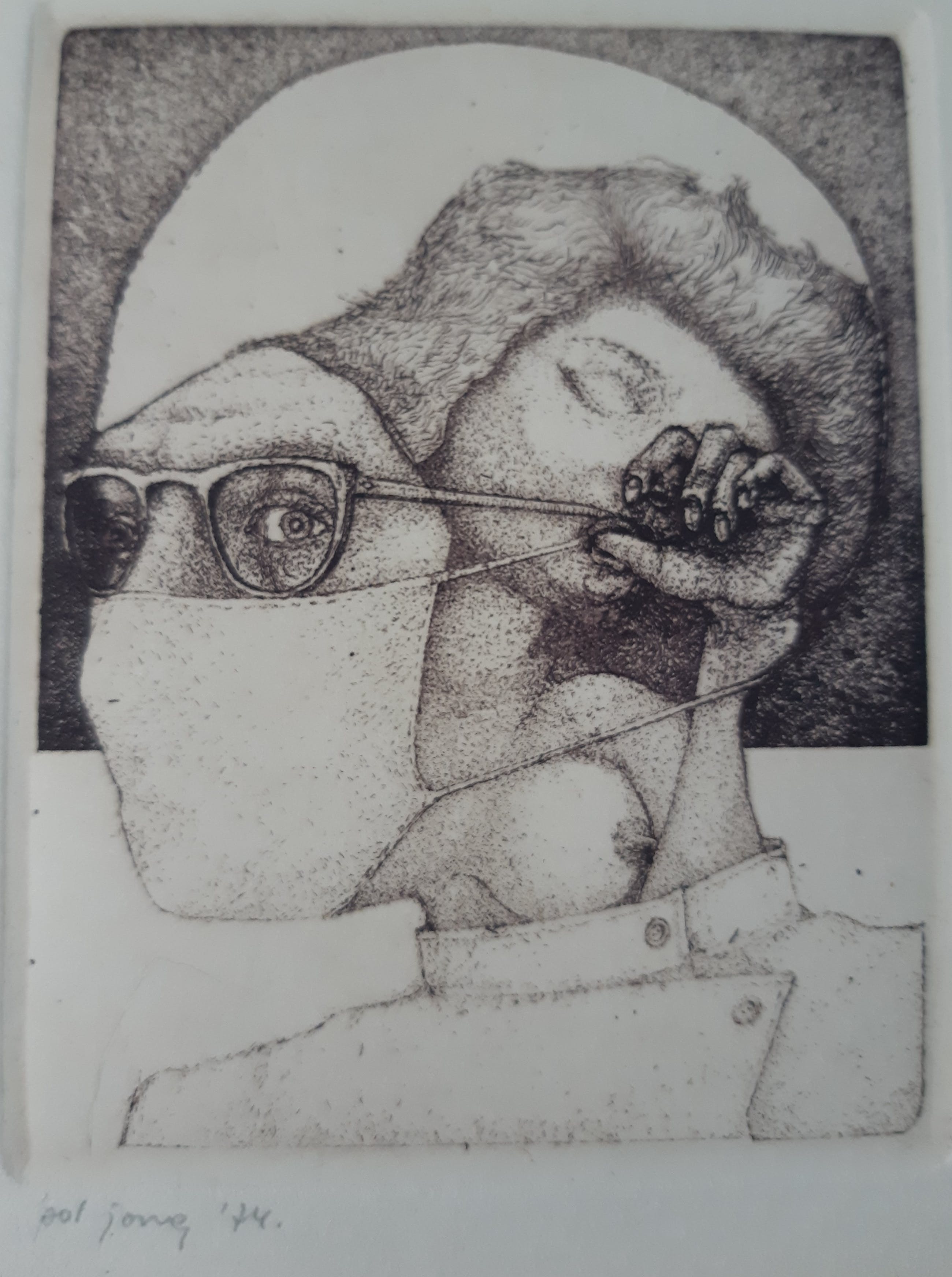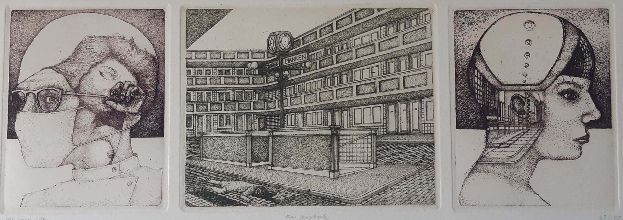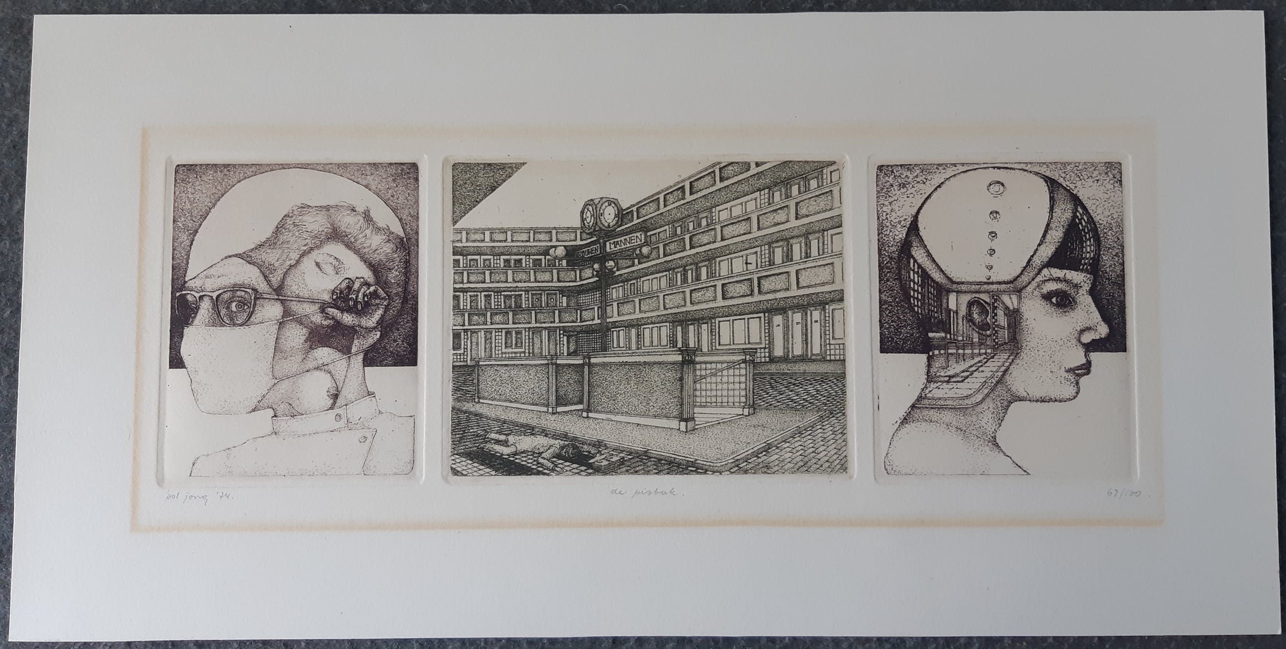 Intrigerende etsen van Pol Jong. Drie etsen op een blad. Met de hand gesigneerd, gedateerd, genummerd en van titel voorzien. De etsen meten respectievelijk 9 x 7,5 (2x) en 9 x 12 cm. De conditie is goed. Er is vergeling rond het beeld door eerdere inlijsting (zie foto's)