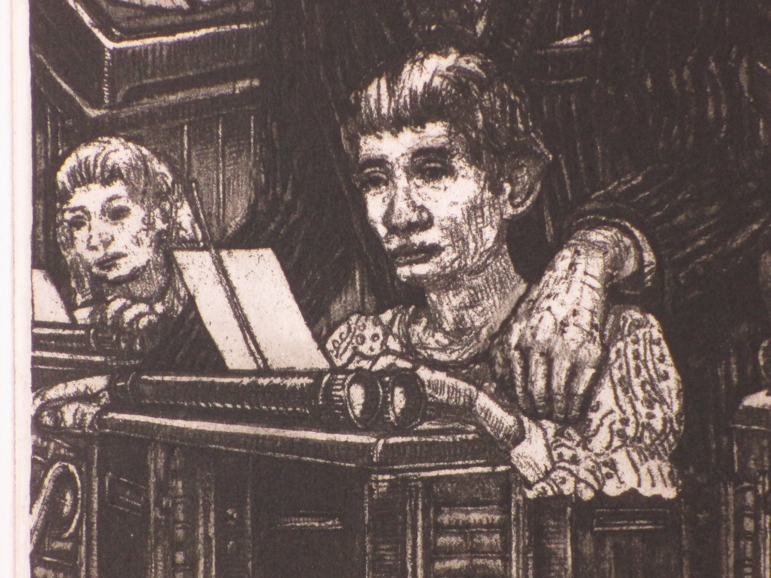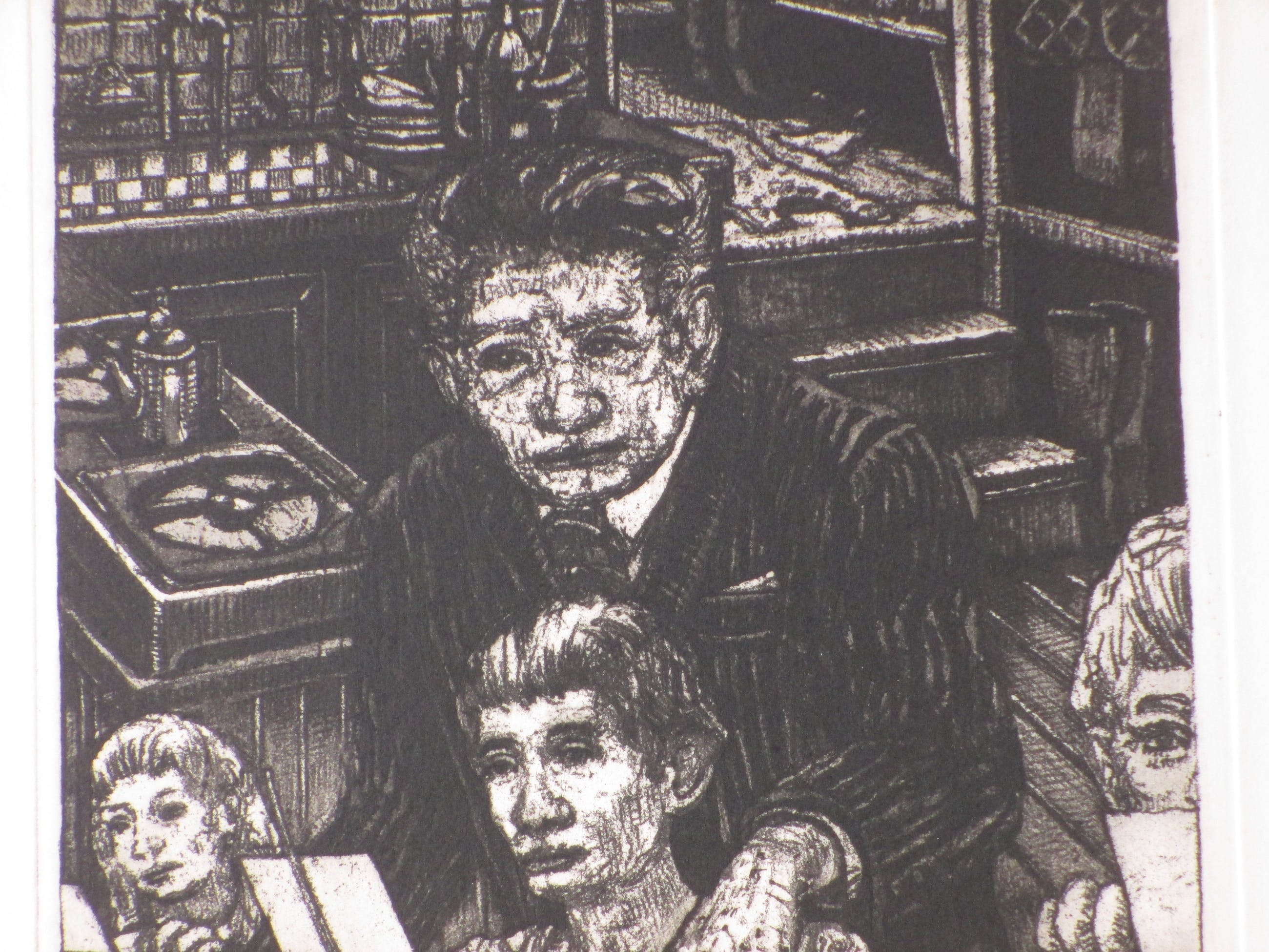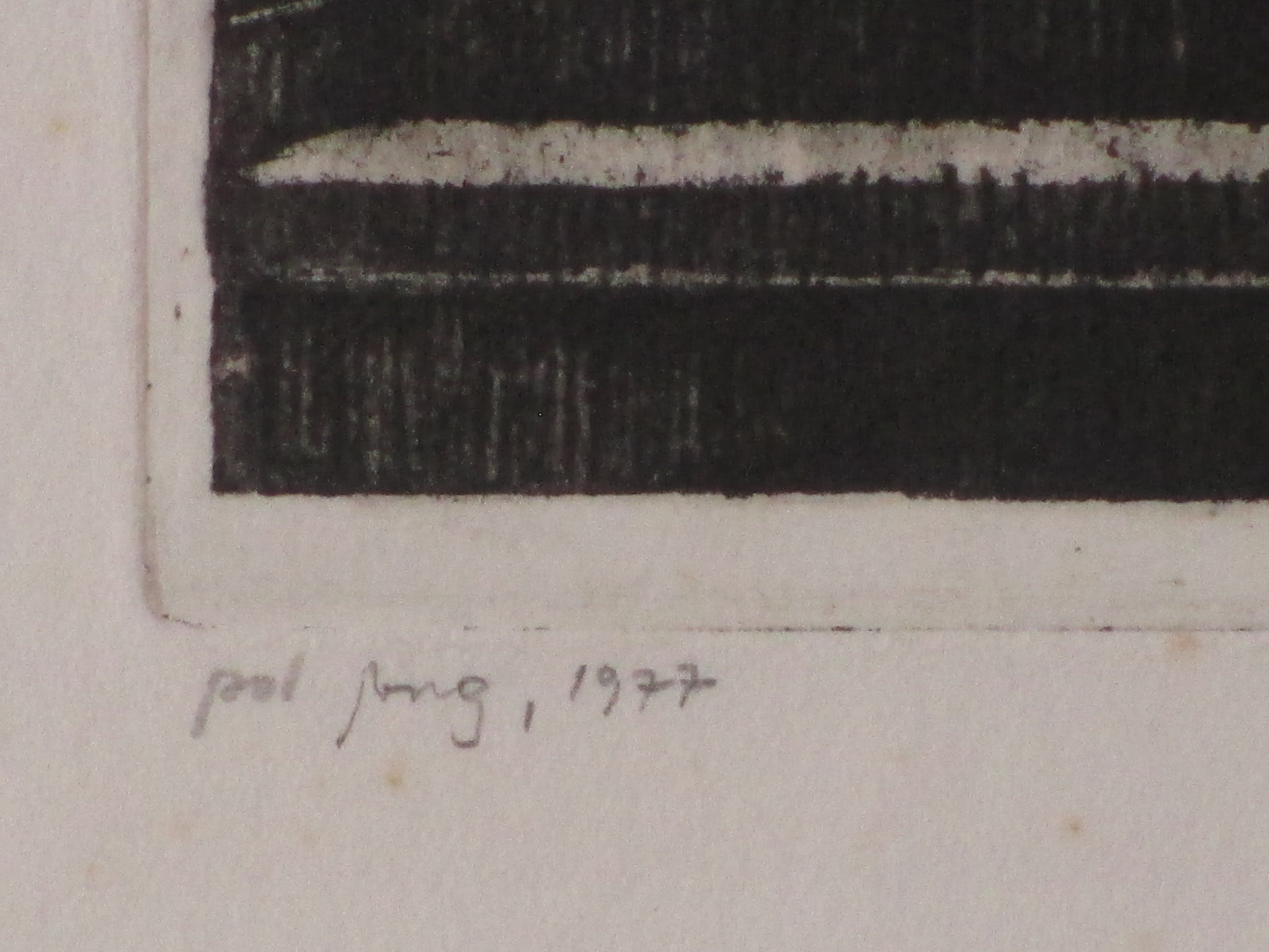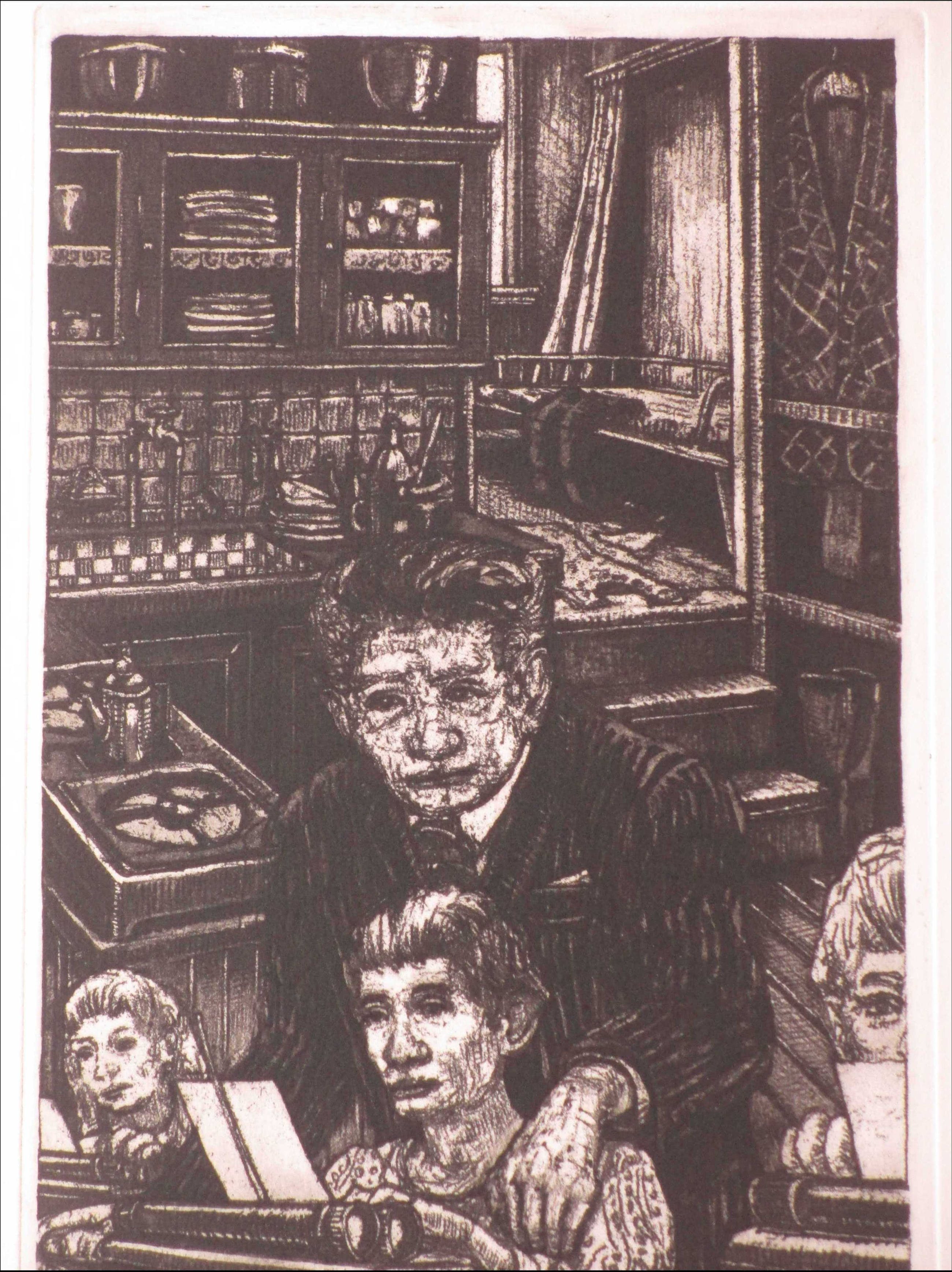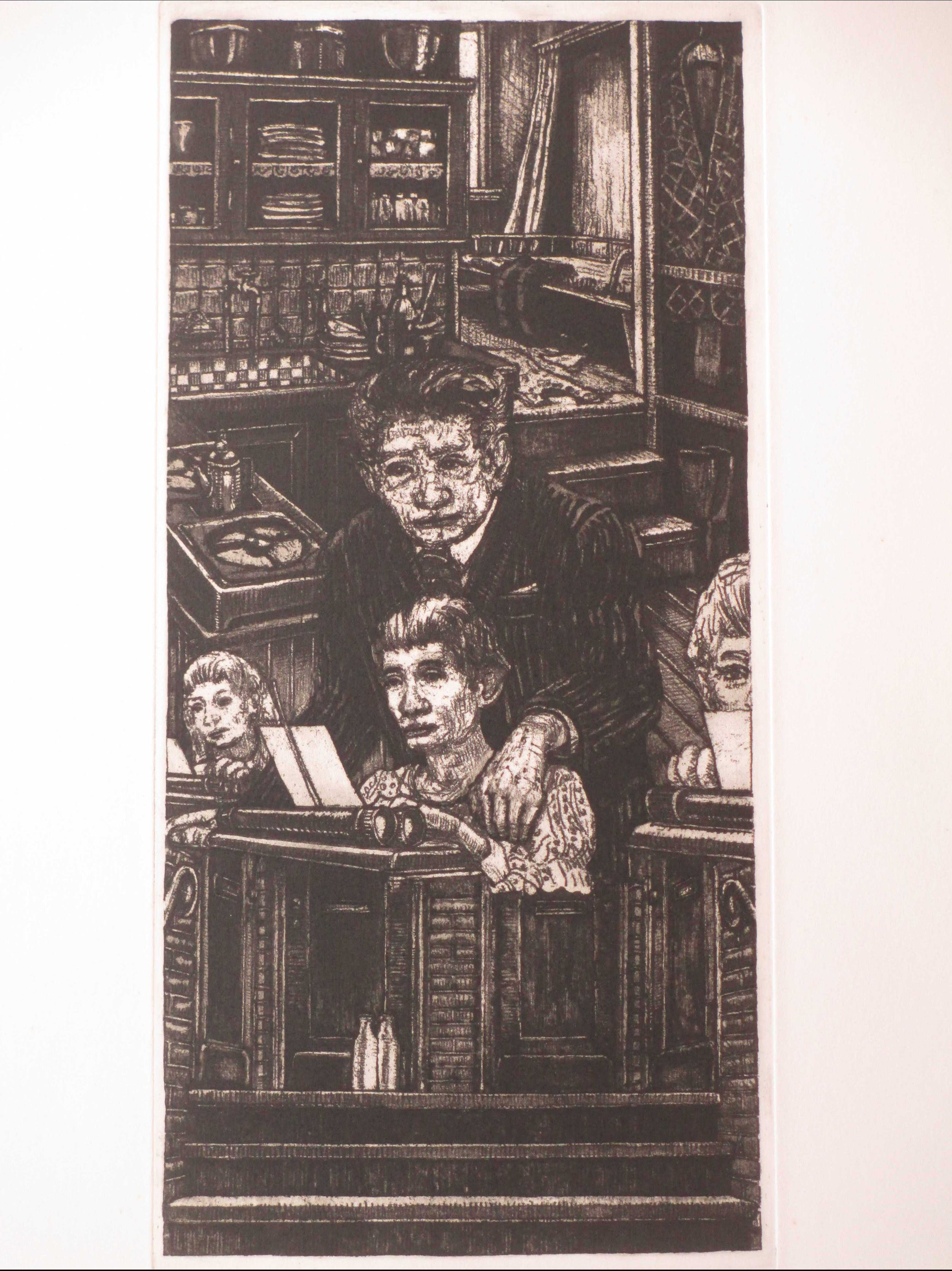 Ets door Pol Jong. Voorstelling getiteld: "tijd van de baas" Losbladig, beeldmaat 39x19, bladmaat 50x40 Gesigneerd en gedateerd in potlood l.o.: 'Pol Jong, 1977' Getiteld in potlood m.o.: "tijd van de baas" Genummerd in Romeinse cijfers r.o.: 'IX/XX' Authenticiteit volledig gegarandeerd