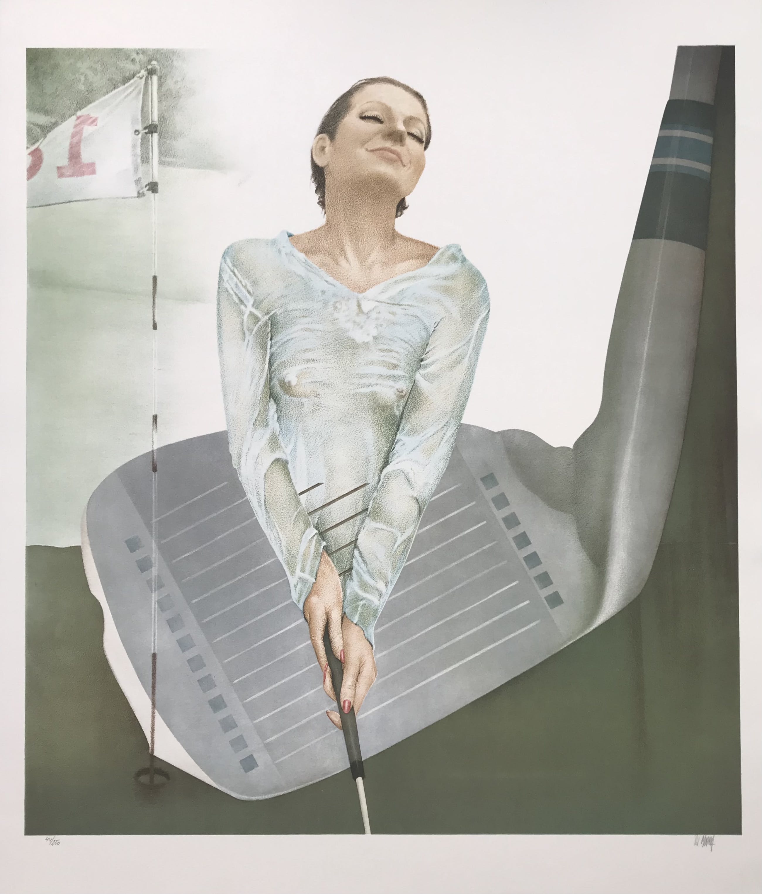 Mooie sensuele litho van een golfspeelster. Gesigneerd en genummerd met potlood 44/250 door de kunstenaar. Afmeting: 75 x 63 cm. Dit werk is niet ingelijst.