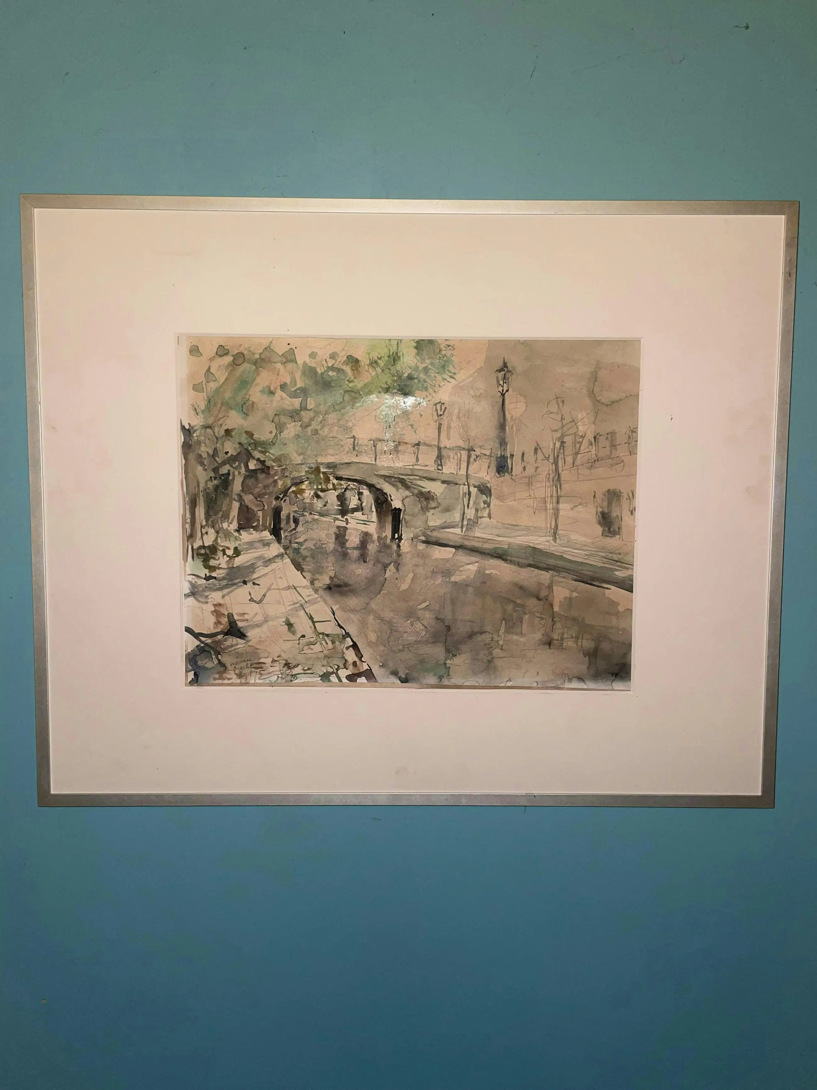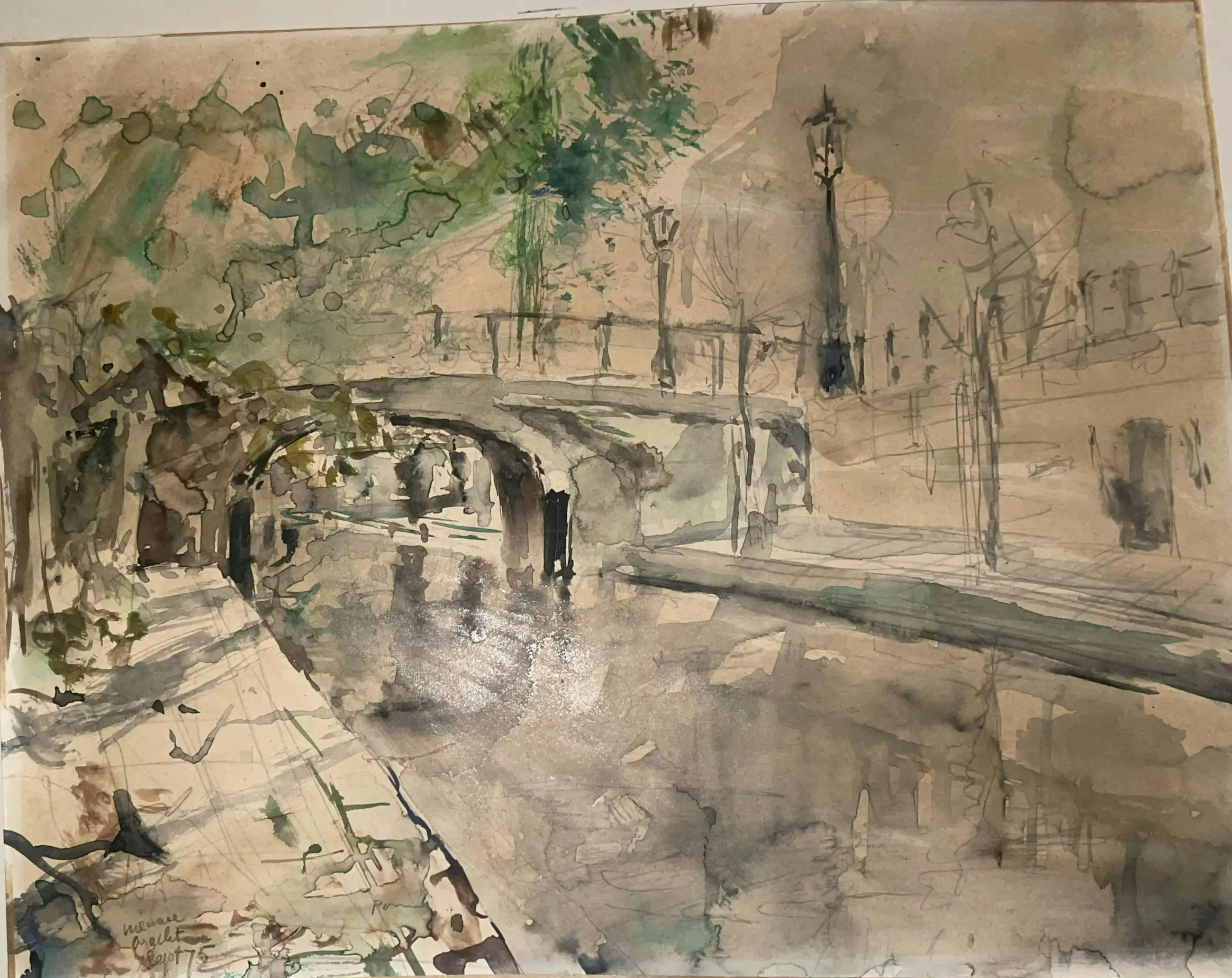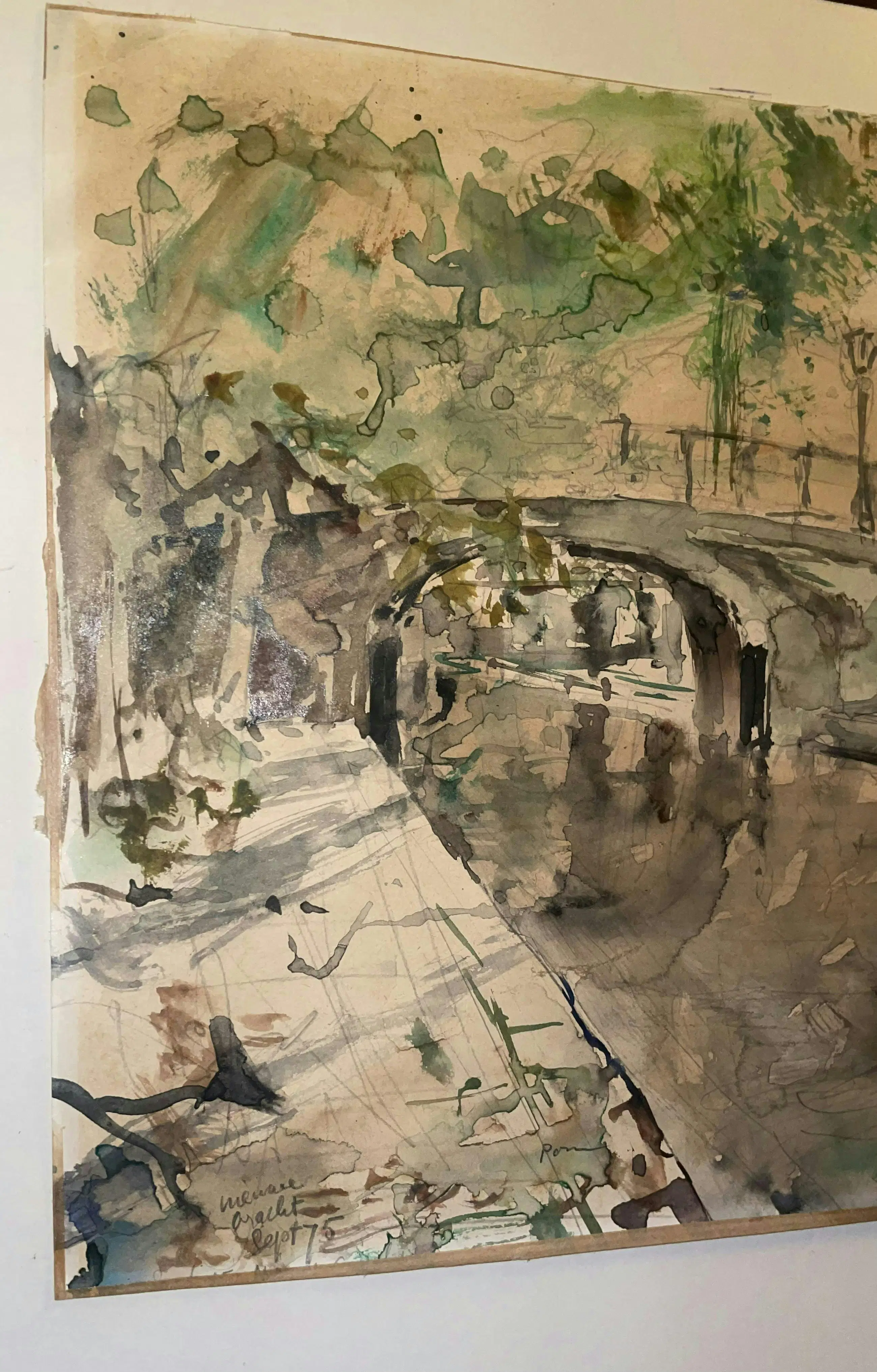 Aquarel ‘Nieuwegracht Sept ‘75’ van de Utrechtse kunstenaar Pom Hoogstadt. Waarschijnlijk thv Nieuwegracht 135 in noordelijke richting gemaakt vanaf de werf. (Zie foto)