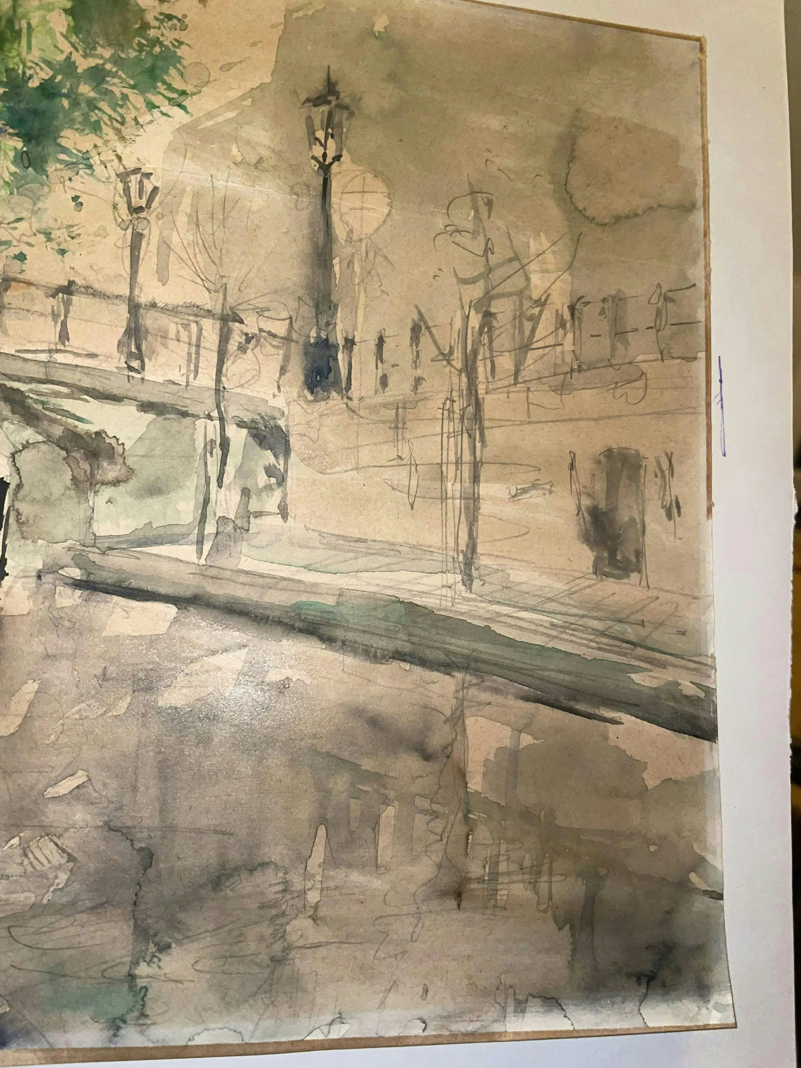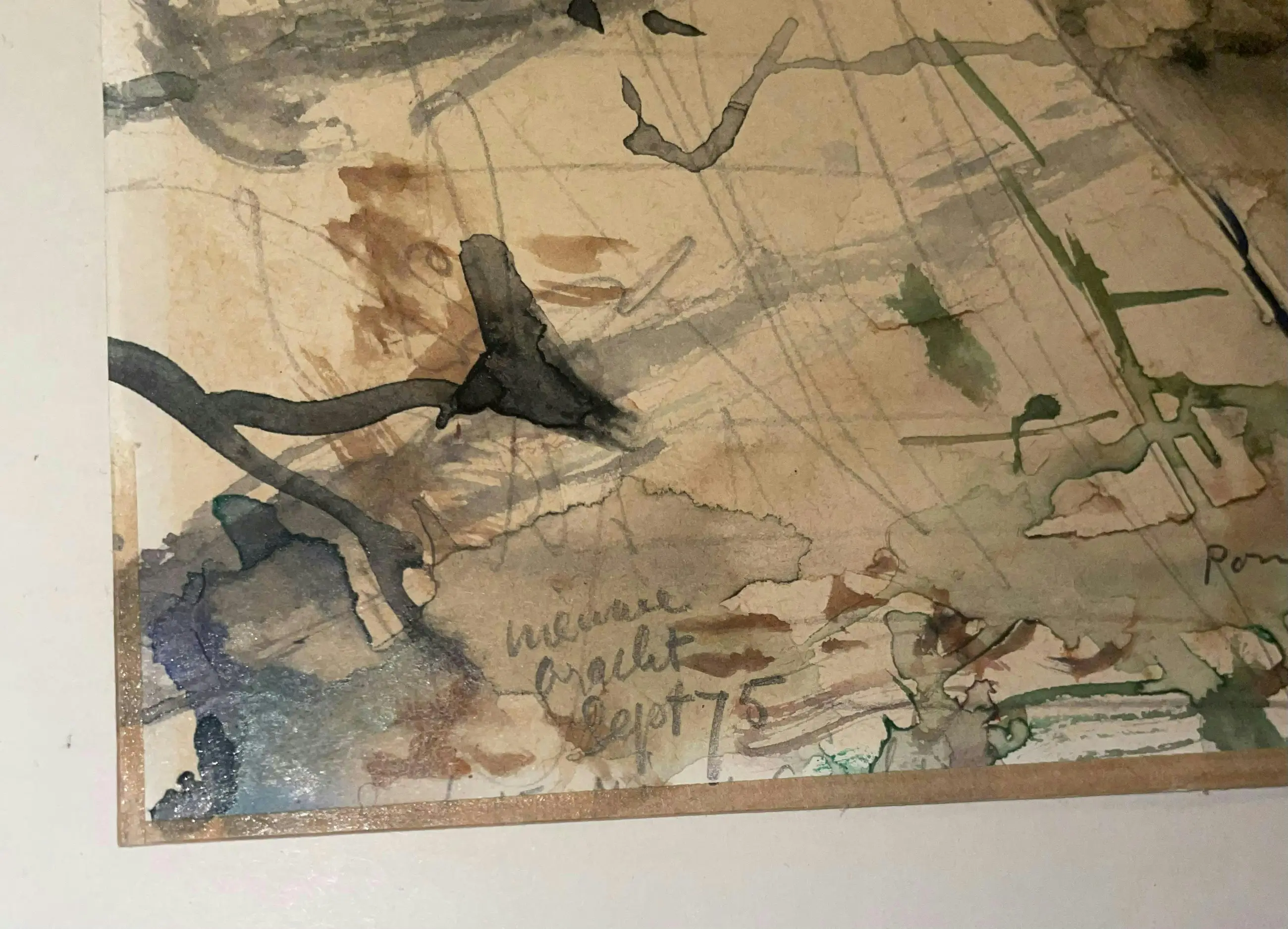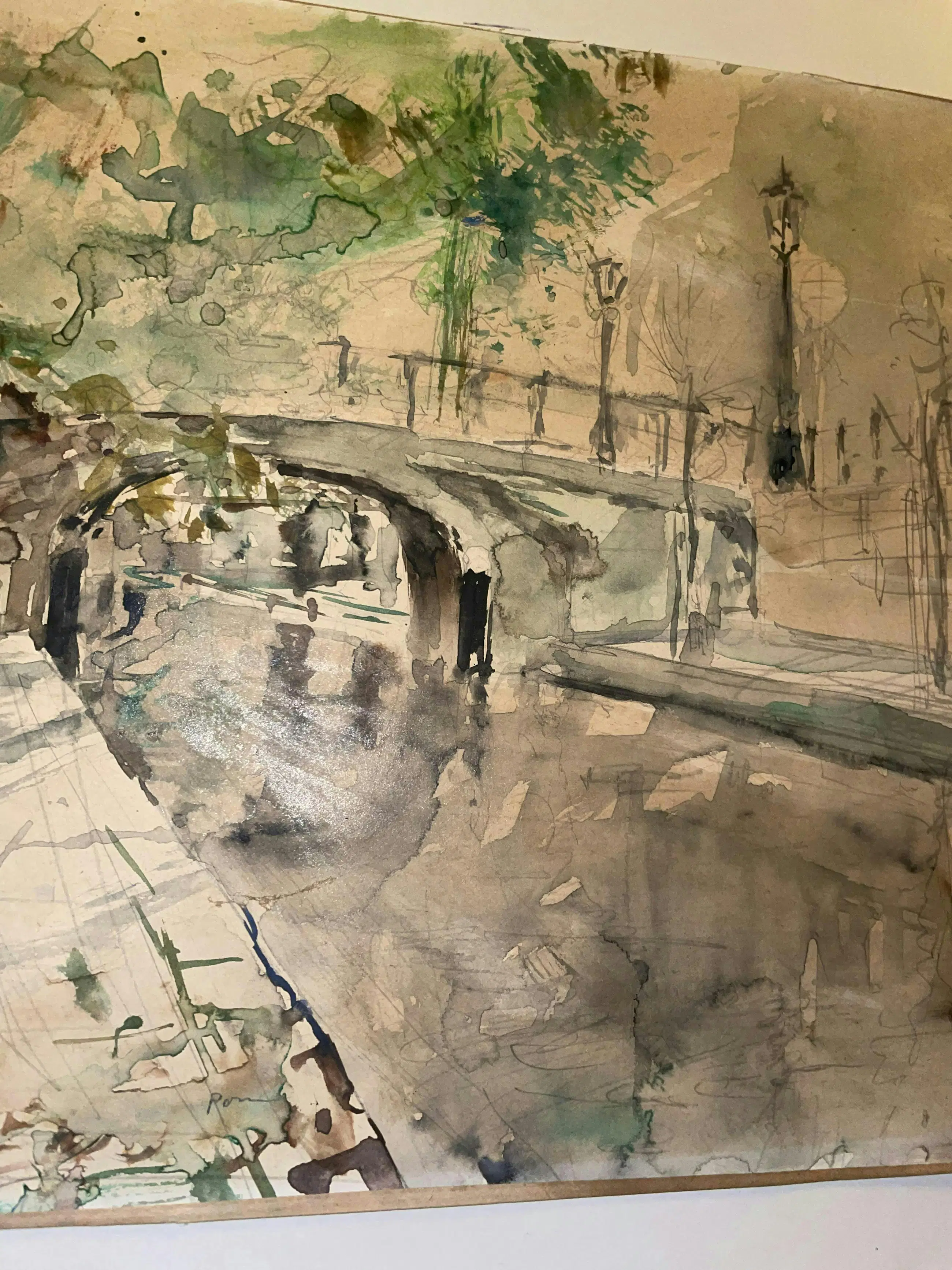 Aquarel ‘Nieuwegracht Sept ‘75’ van de Utrechtse kunstenaar Pom Hoogstadt. Waarschijnlijk thv Nieuwegracht 135 in noordelijke richting gemaakt vanaf de werf. (Zie foto)