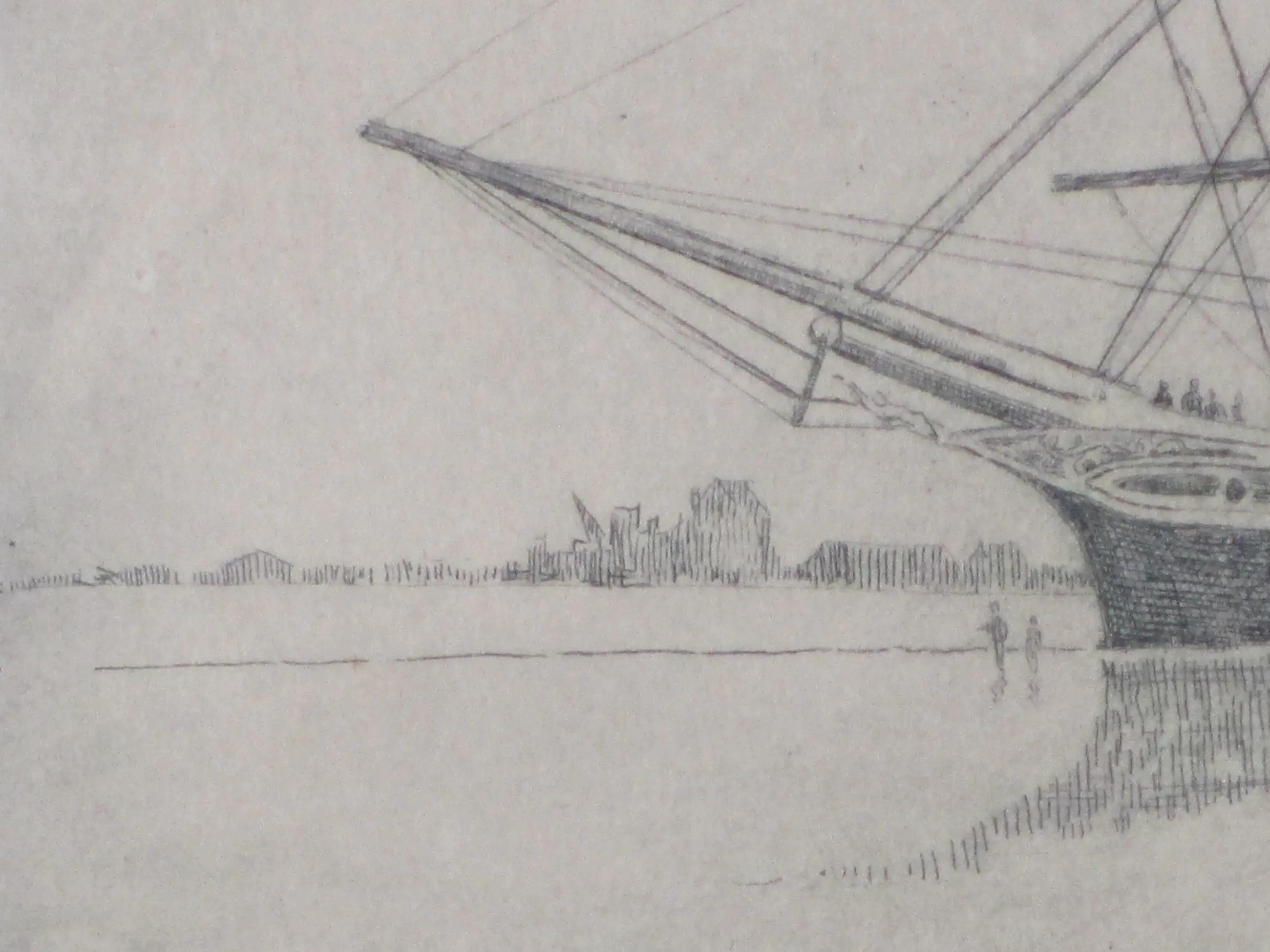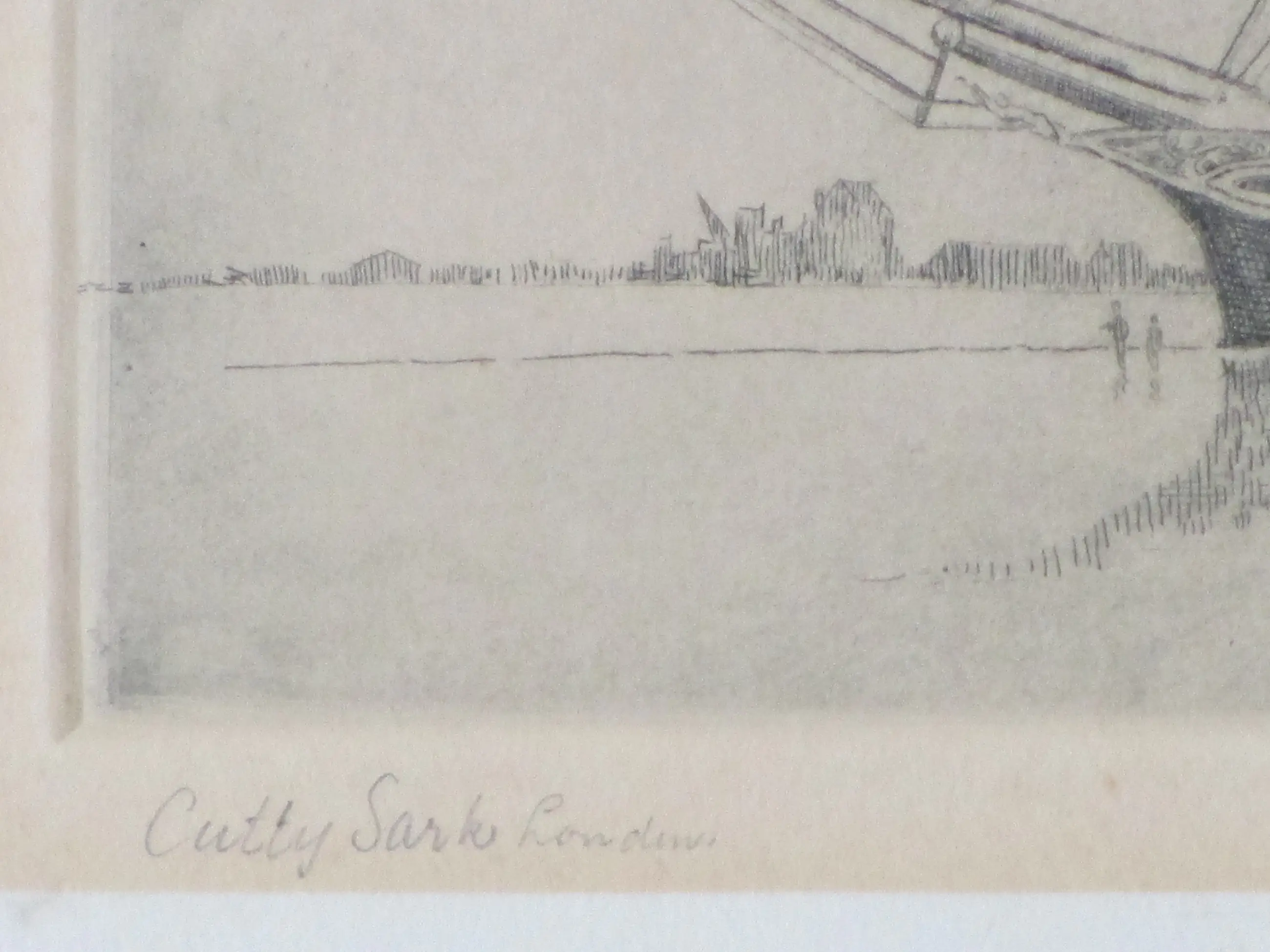 Ets door Poppe Damave Voorstelling van de bekende driemaster Cutty Sark, bij Greenwich in Londen Losbladig, beeldmaat 13x17, bladmaat 16x21 Gesigneerd in potlood r.o.: 'Poppe Damave' Getiteld in potlood l.o.: 'Cutty Sark Londen' Authenticiteit volledig gegarandeerd