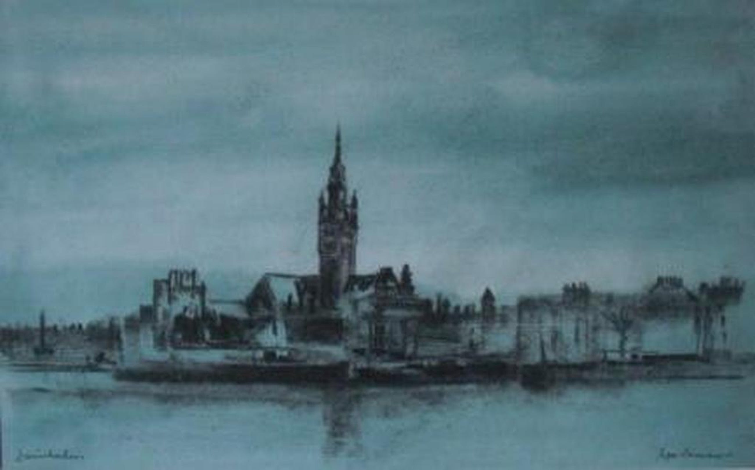 Duinkerken, Zicht Op Toren is een mooi werk van Poppe Damave vervaardigd met houtskool op een Aquarel. Het heeft een prachtige turquoise achtergrond en de afmetingen zijn 45cm x 28cm.