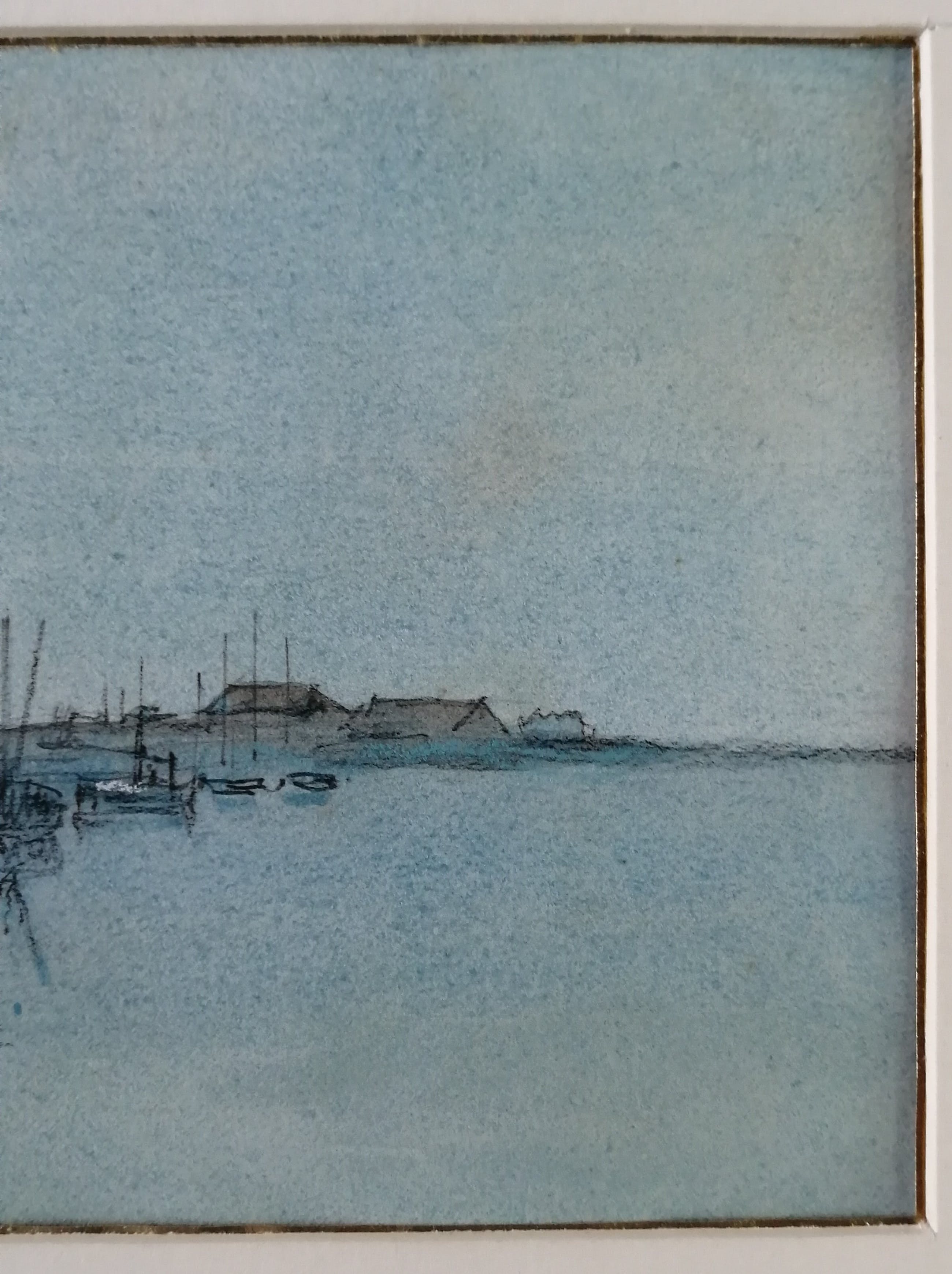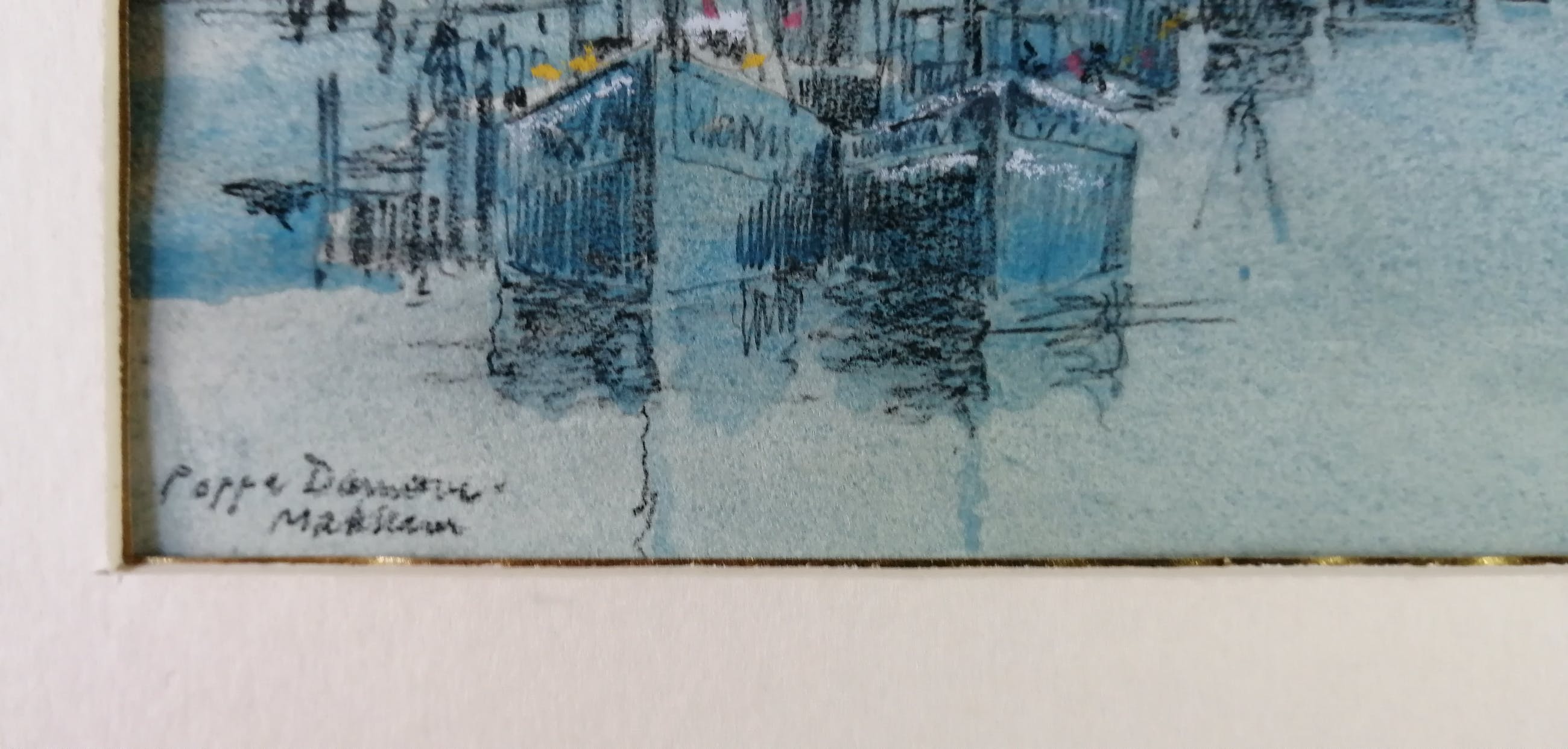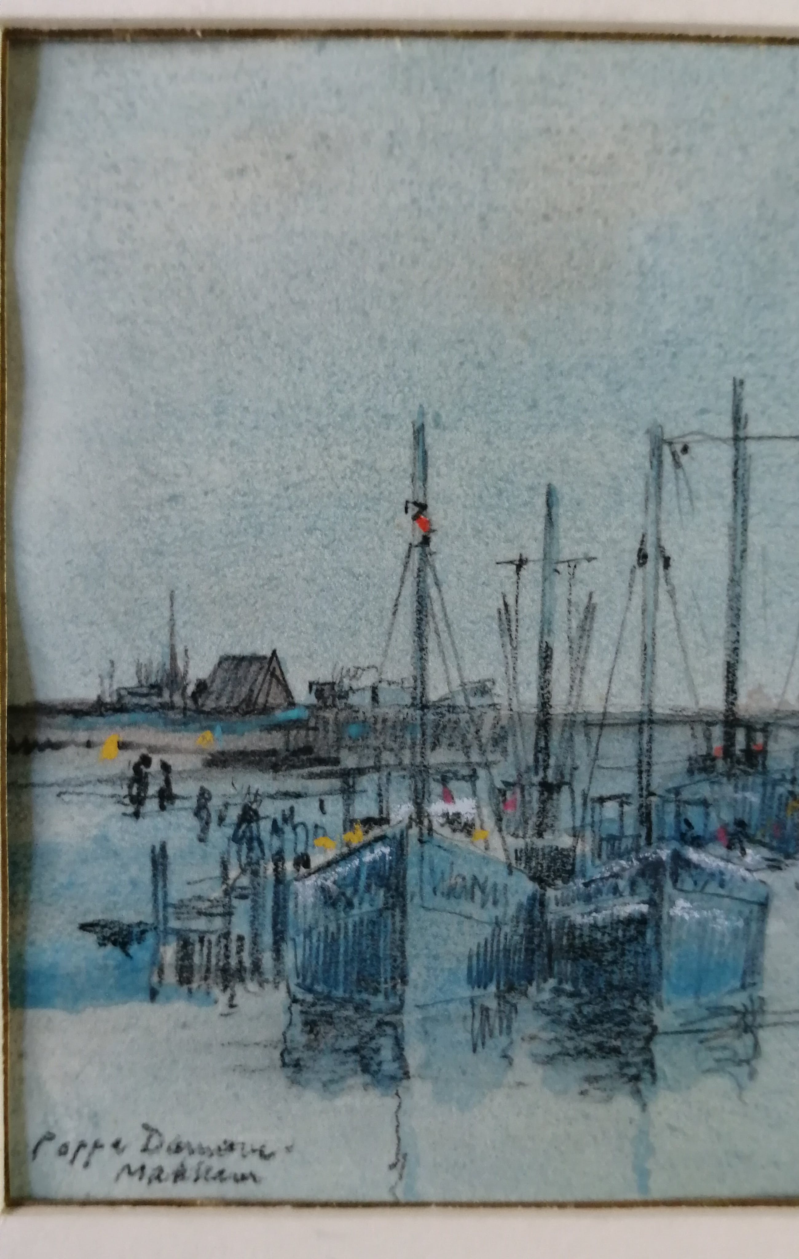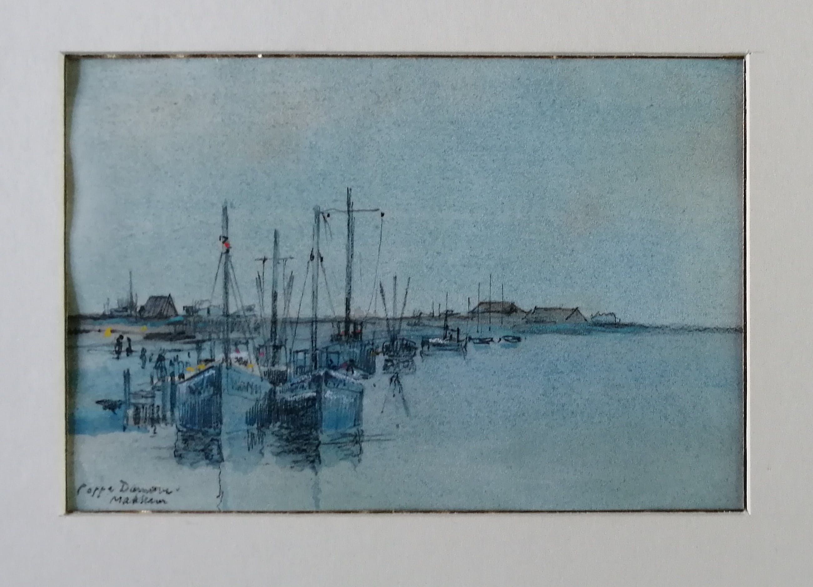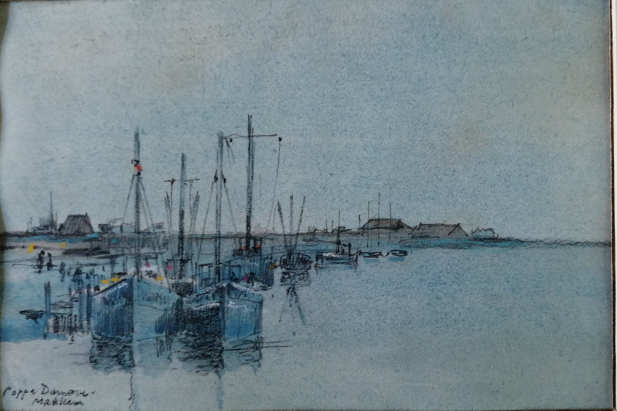 Aquarel voorstellende schepen in de haven van Makkum.Gesigneerd en getiteld linksonder.Onder passe-partout.Poppe Damave werd geboren te Groningen op 21 januari 1921 en overleed te Bonn op 18 augustus 1988.Opgeleid aan de School voor Kunstnijverheid te Haarlem.Was een leerling van H.F. Boot en A.J. Grootens. Verzend- en verpakkingskosten binnen Nederland 12,50 euro.Buitenland op aanvraag.