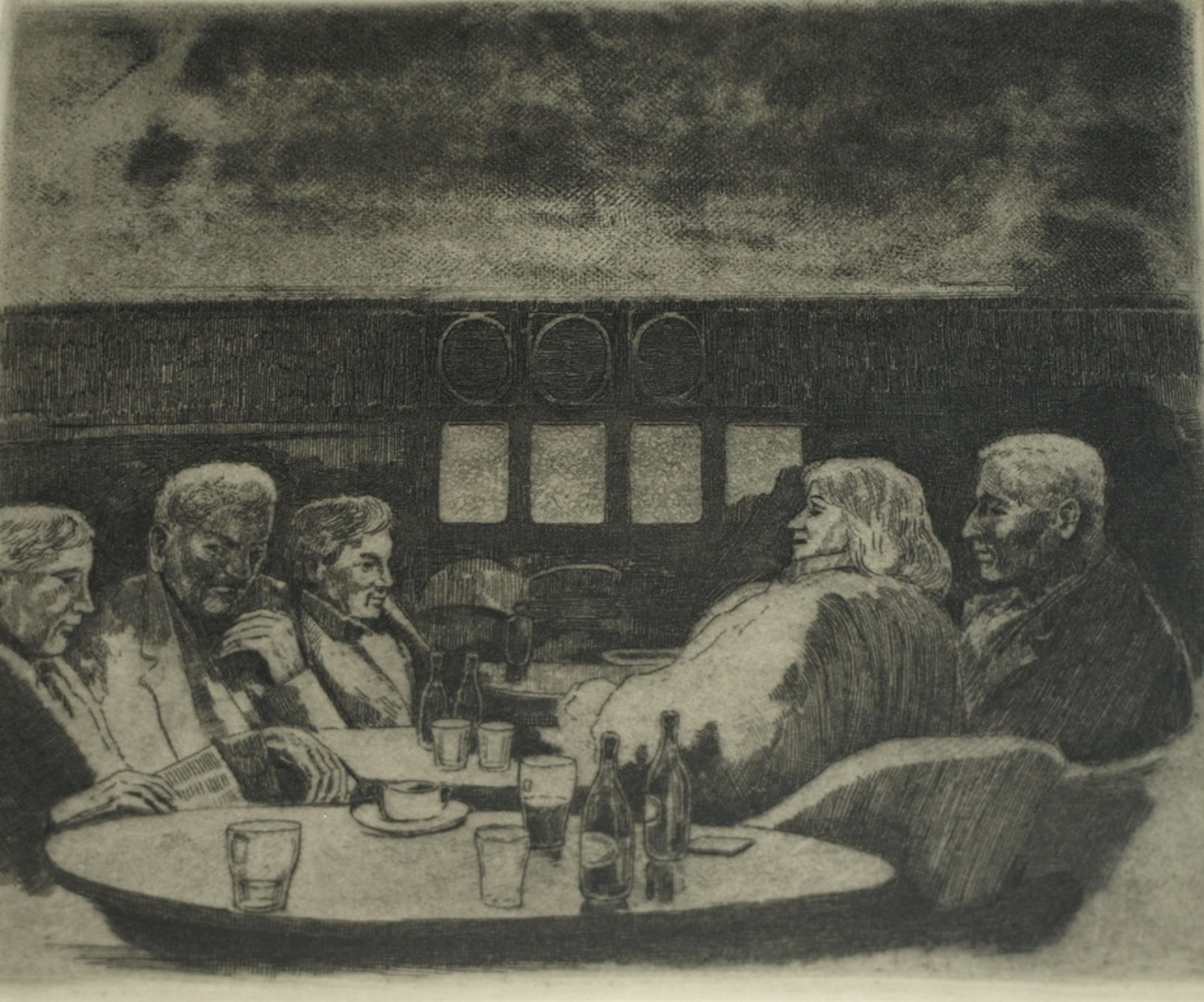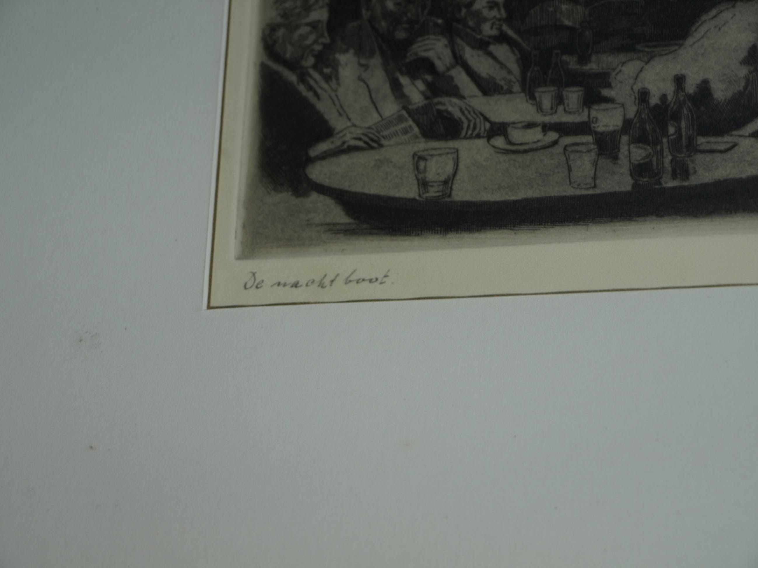Een ets van de Nederlandse kunstenaar Poppe Damave met een voorstelling van een gezelschap tijdens een vaart met een veerboot (“De nachtboot”).