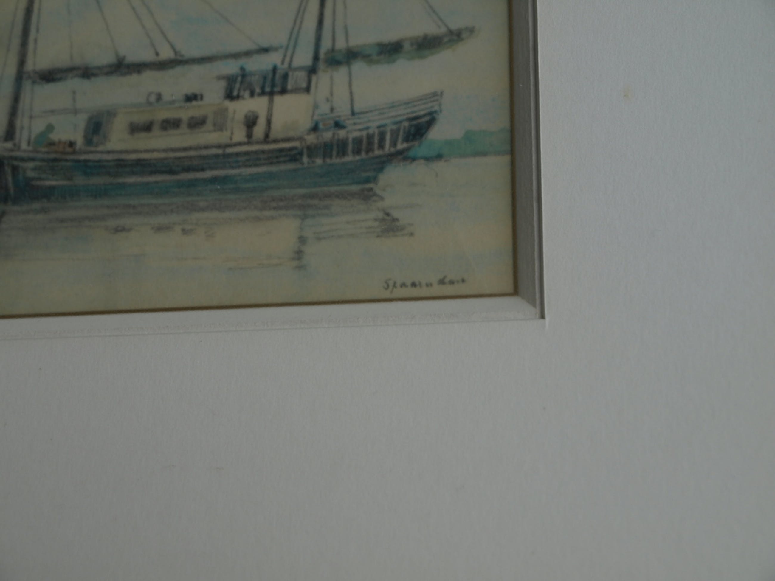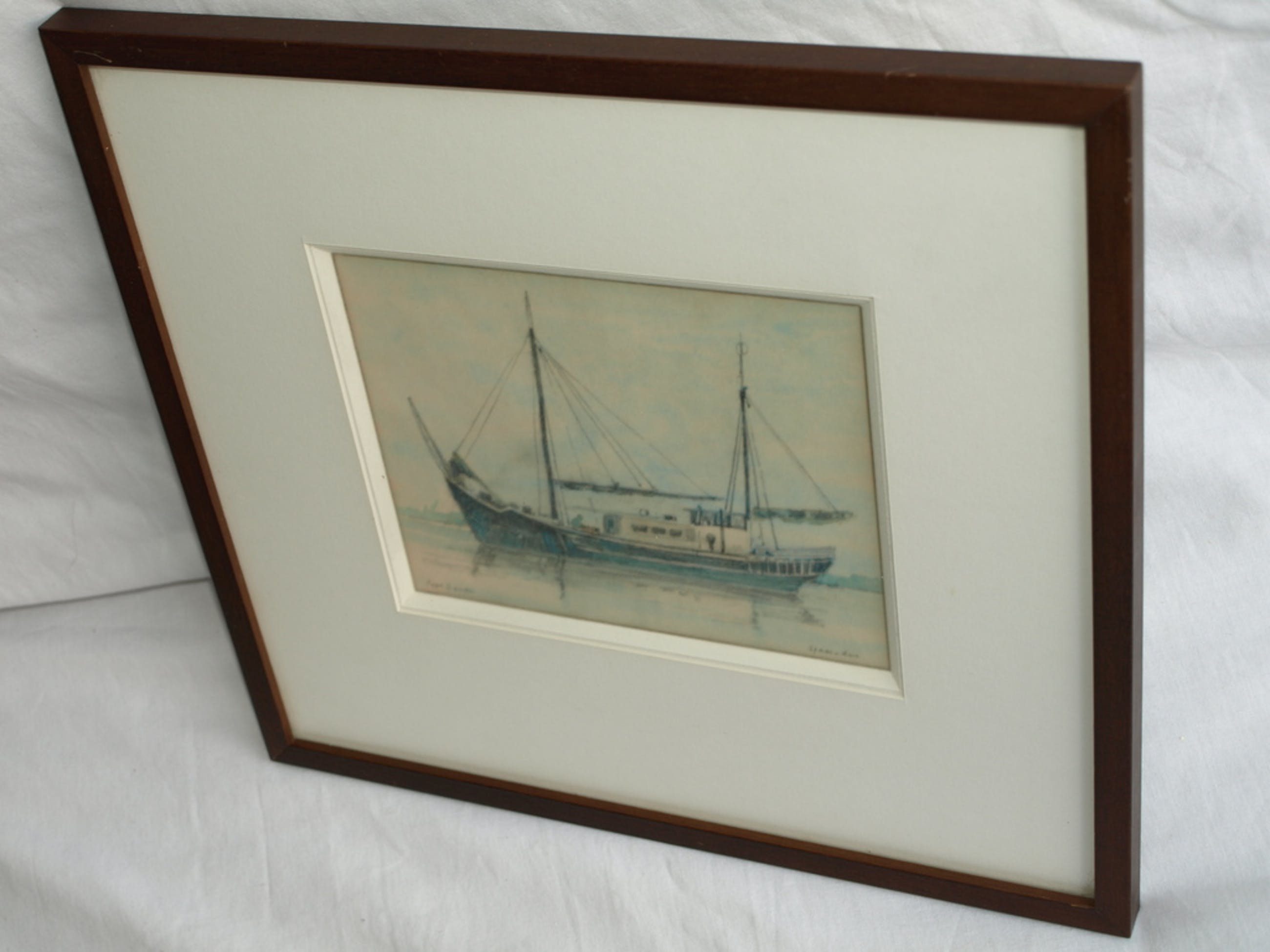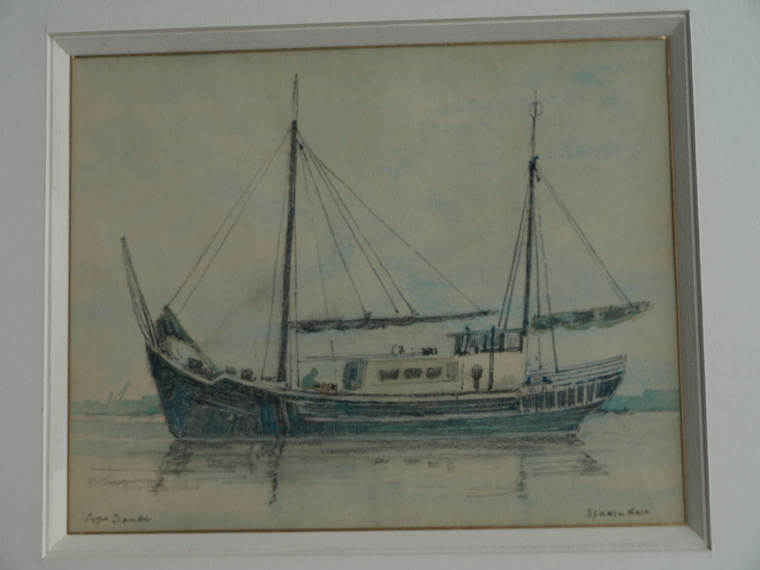 Een tekening van de Nederlandse kunstenaar Poppe Damave met een voorstelling van een schip op een water (De Spaarne?) bij Spaarndam (Noord-Holland).