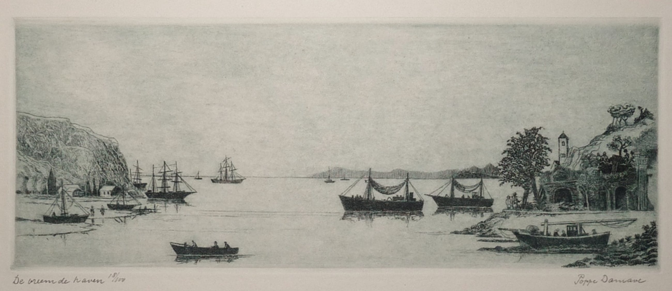 * Leuke klassiek ogende voorstelling van Poppe Damave. Kleurets met als titel: De vreemde haven