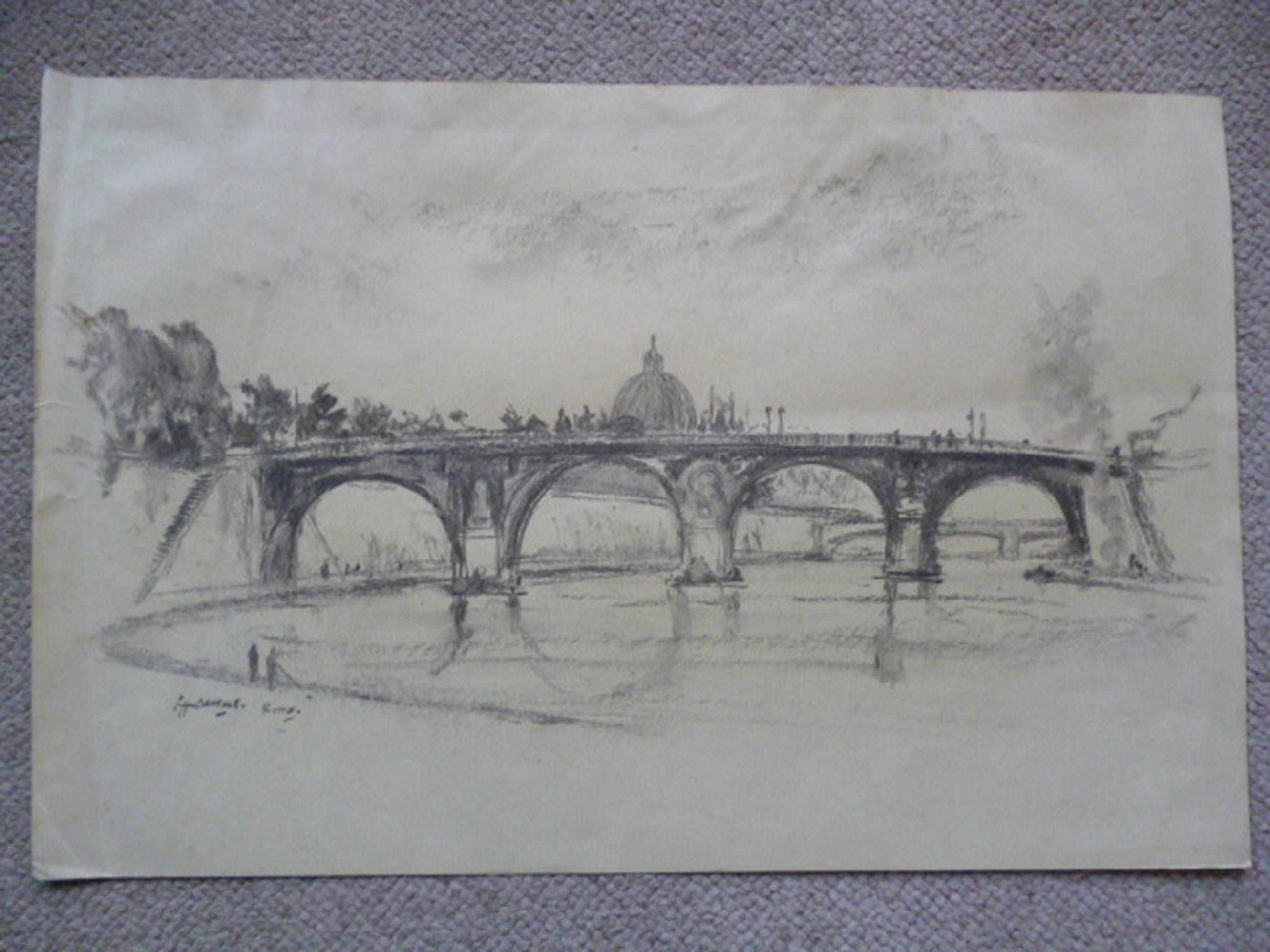 Zwart krijt tekening met stadsgezicht van Rome, gesigneerd en getiteld linksonder.