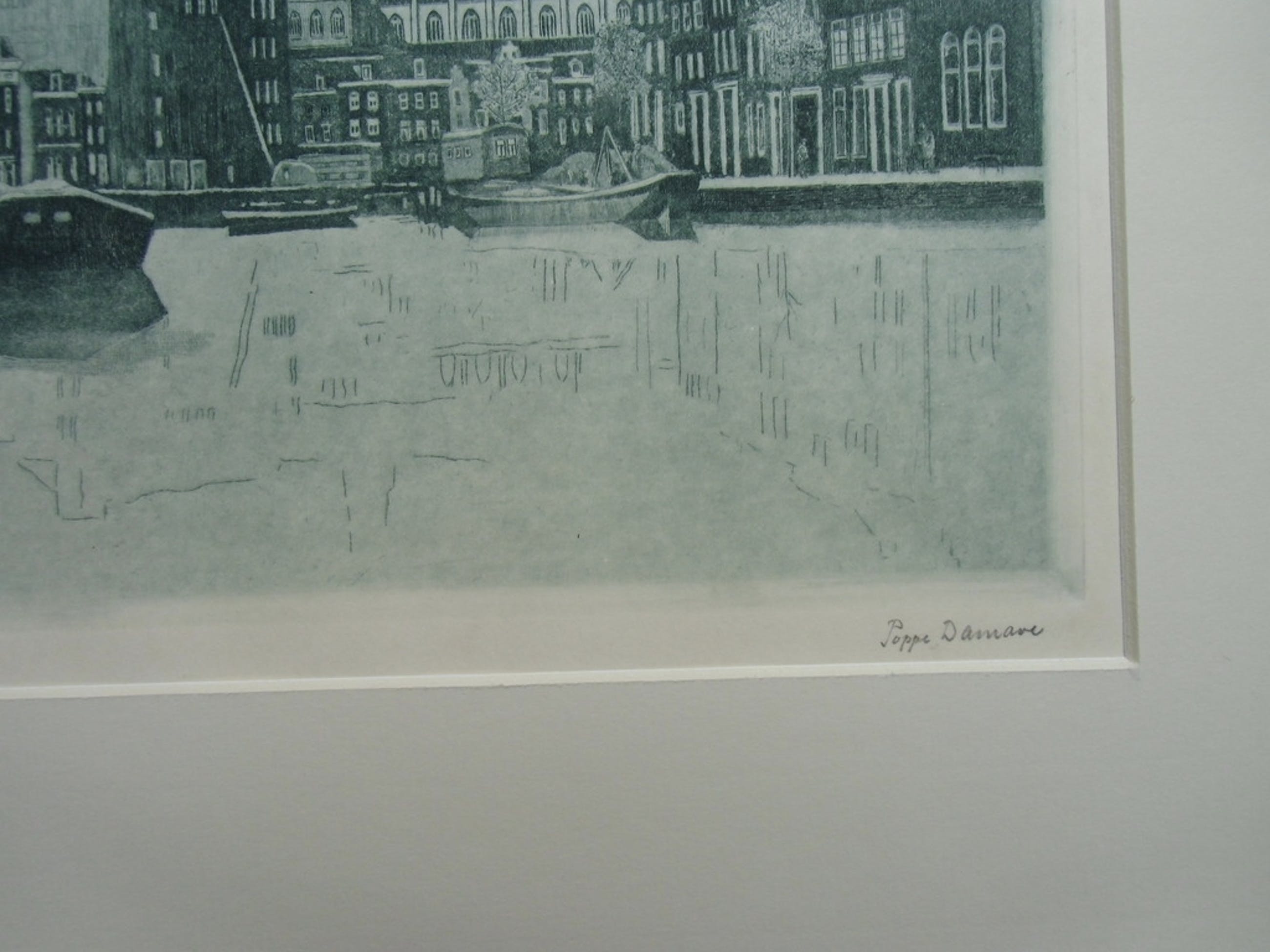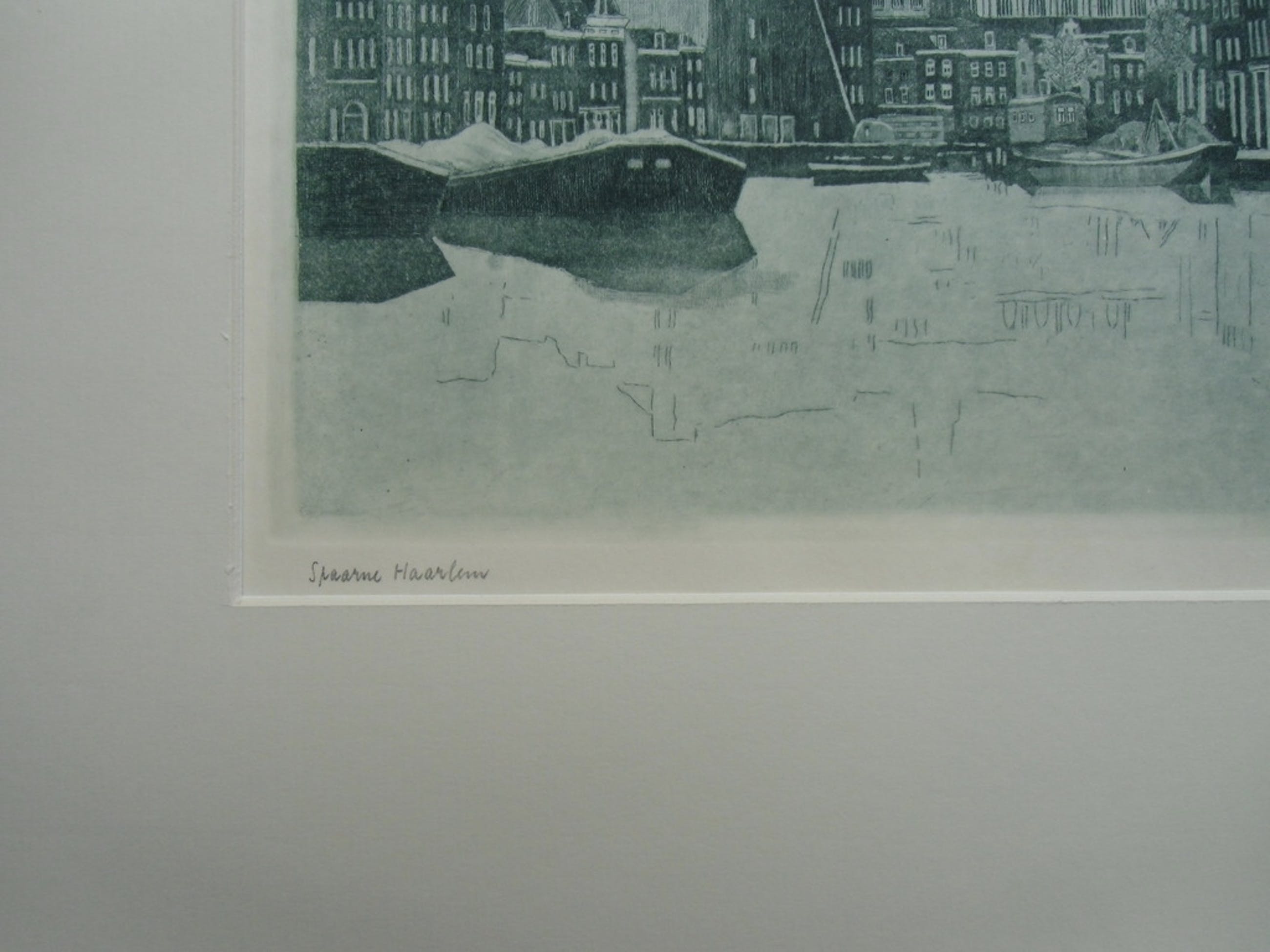 Ets in groentinten afgedrukt op stevig papier. Betiteld en gesigneerd met potlood.
