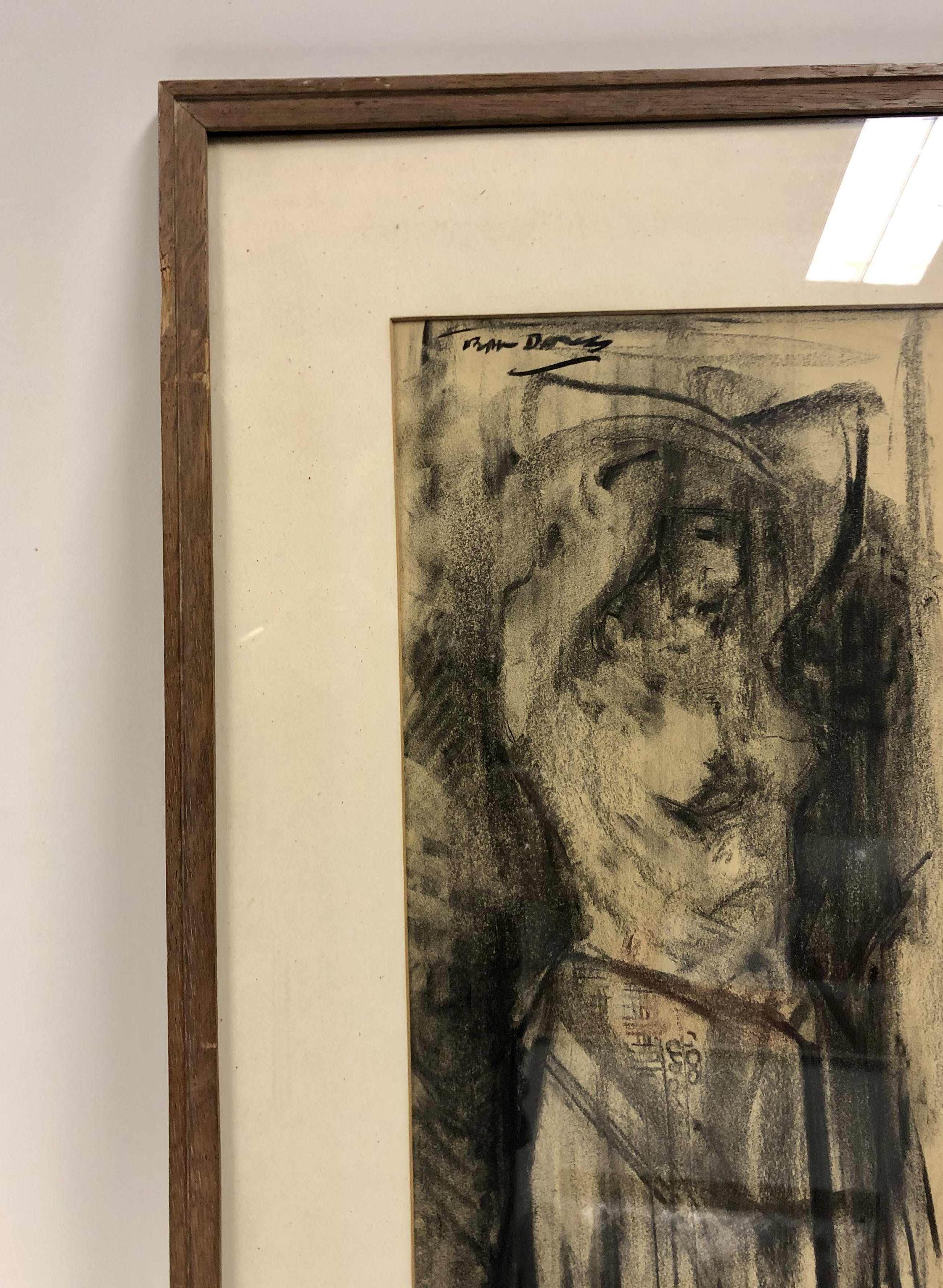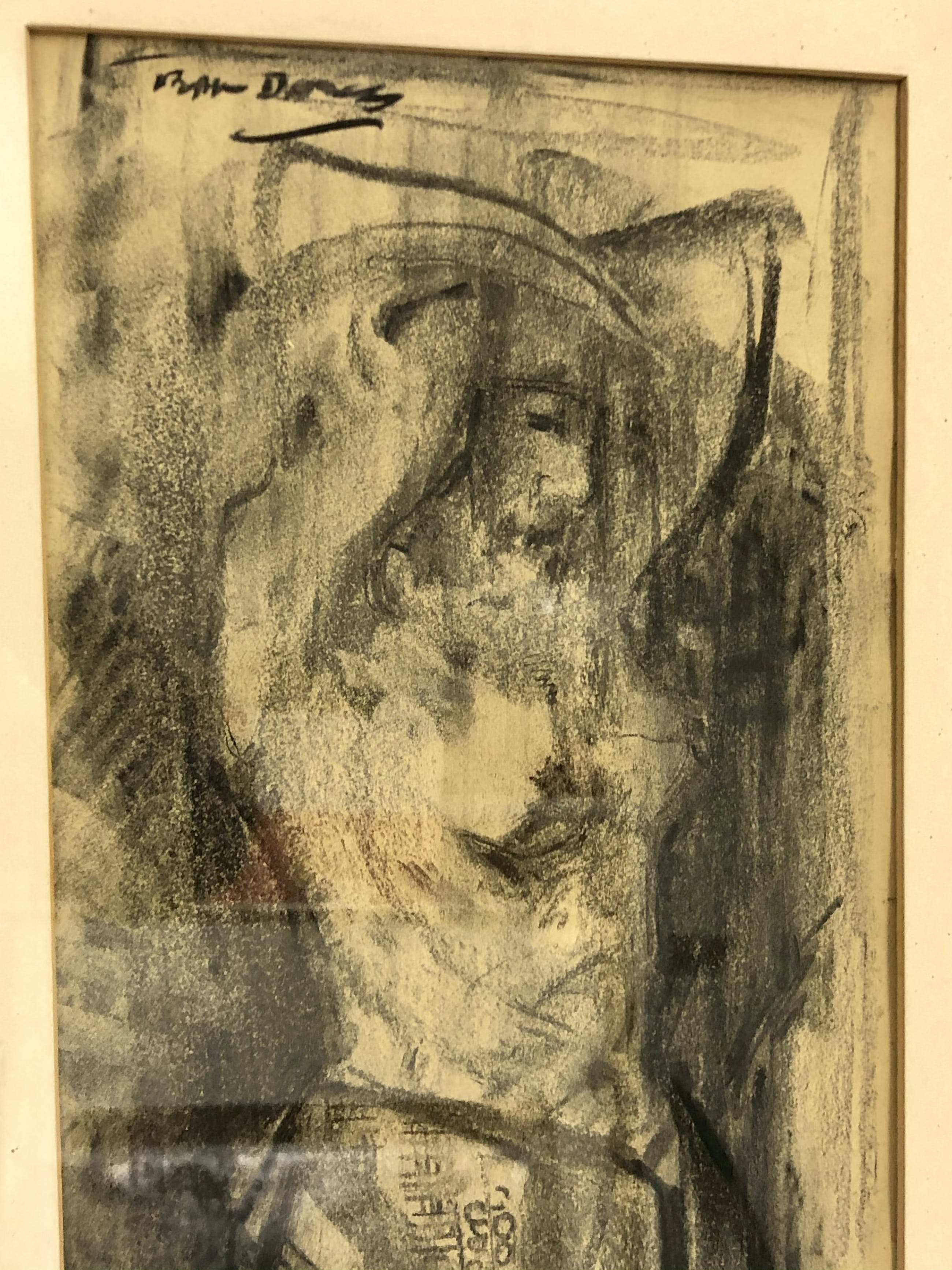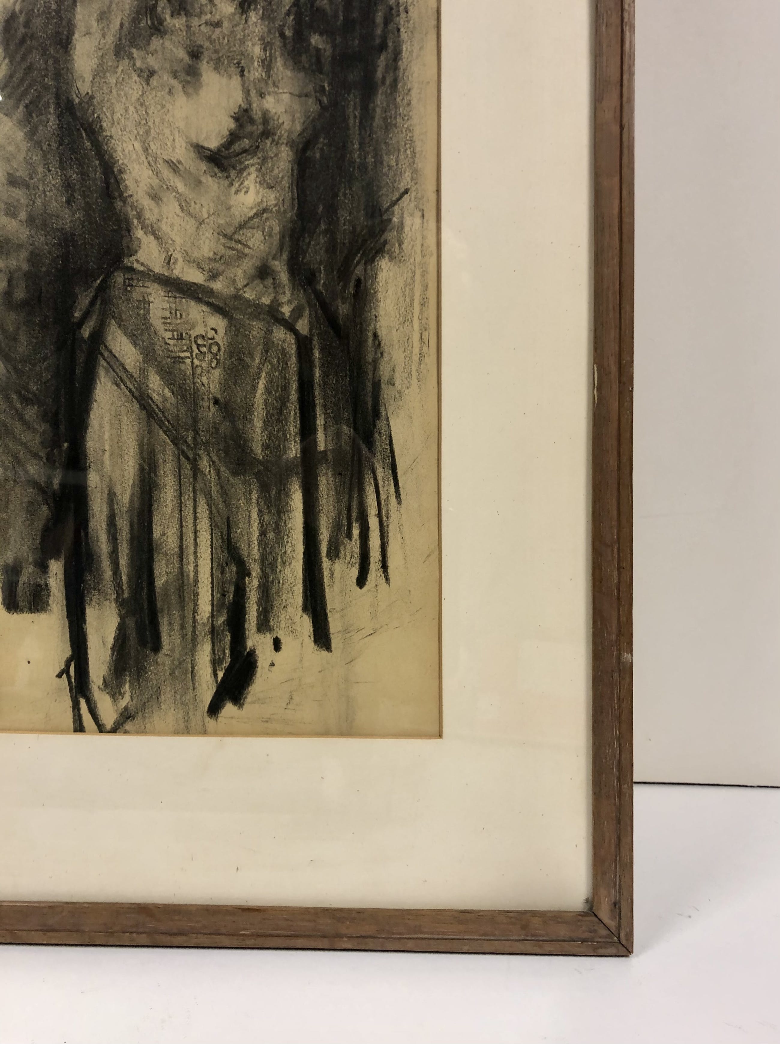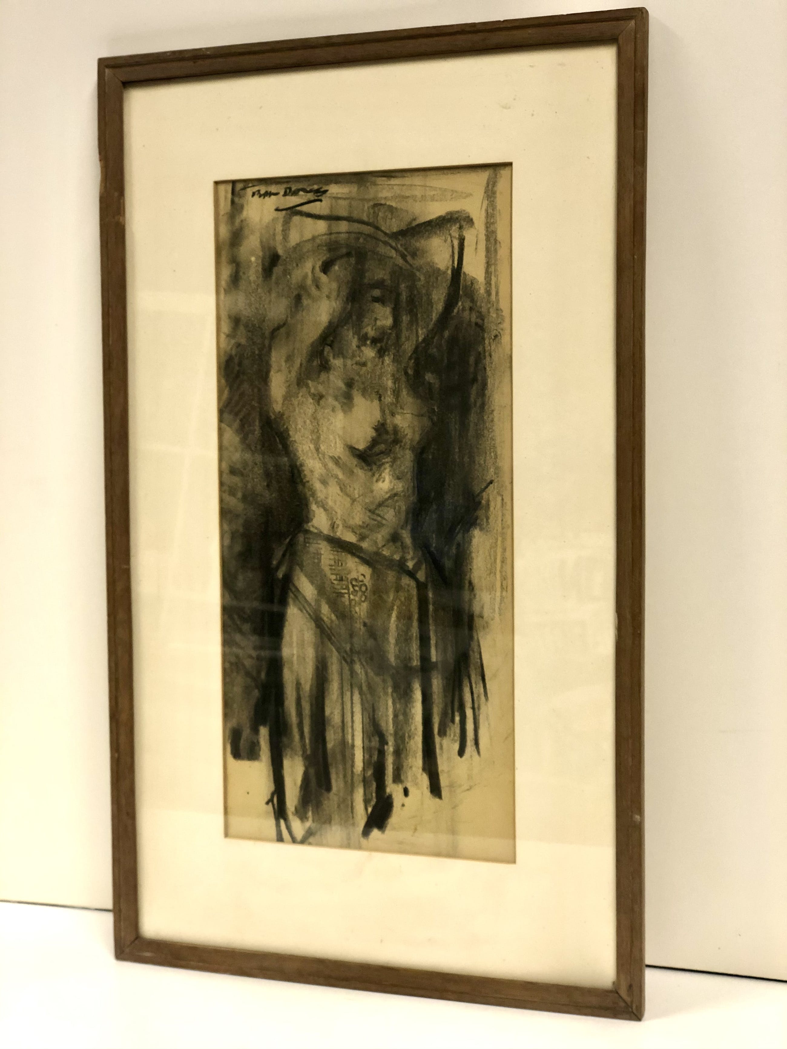 Fraai werk in houtskool van de Haarlemse kunstenaar Damave. Het betreft een tekening van een halfnaakte vrouw.