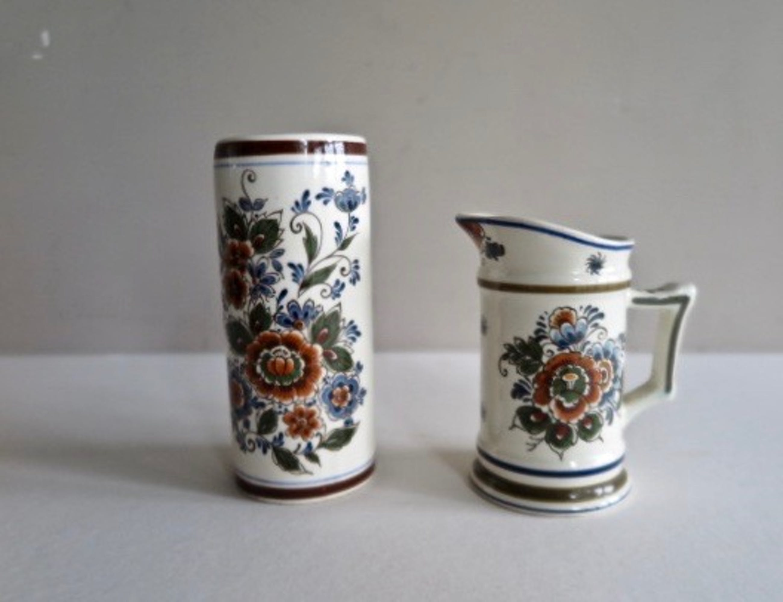 2) Kannetje met oor - polychroom met florale motieven - 12 x 11 x 7 cm - gemerkt/ nr. 560 - in mooie conditie met minimaal chipje aan onderzijde onderrand