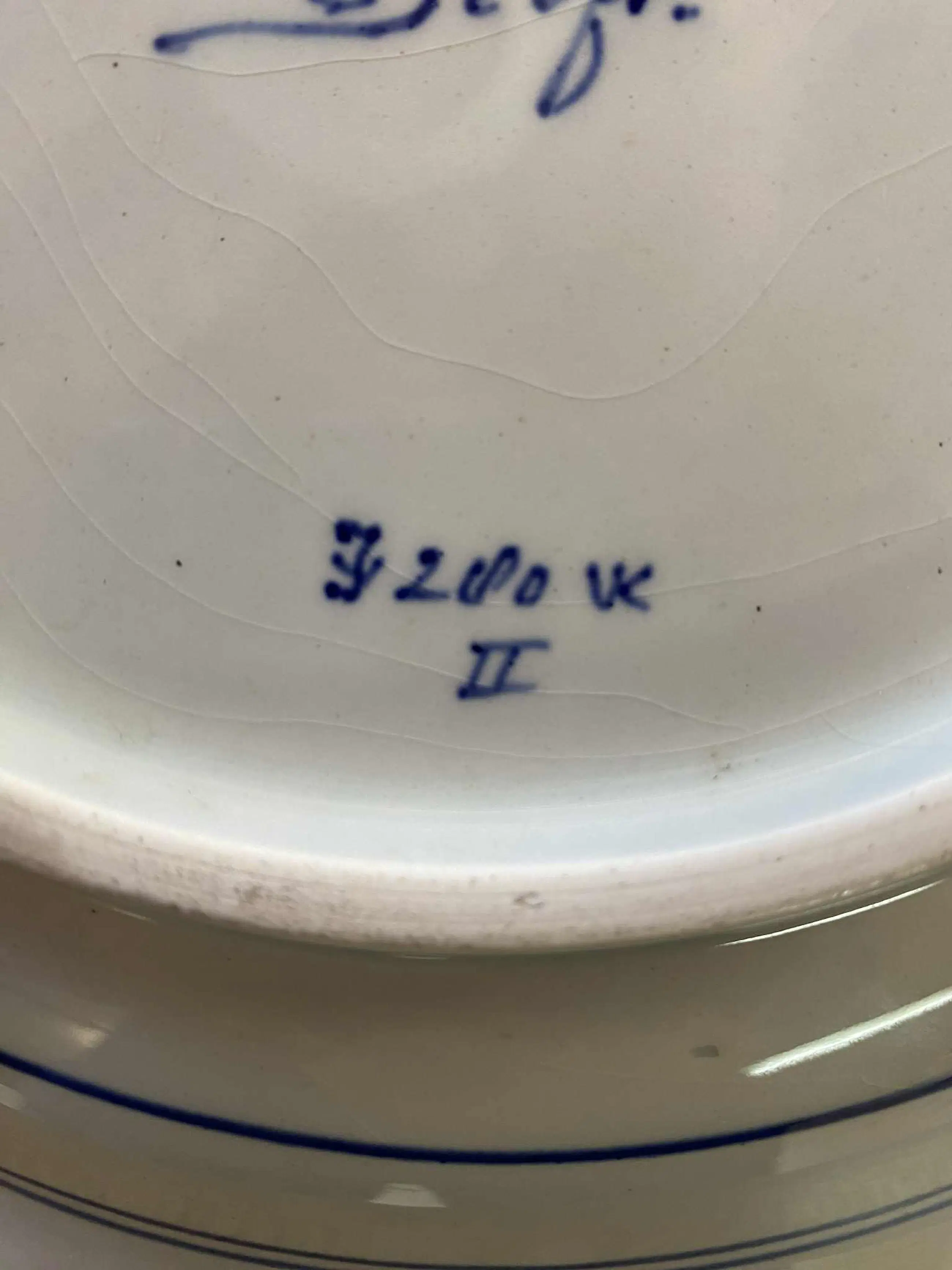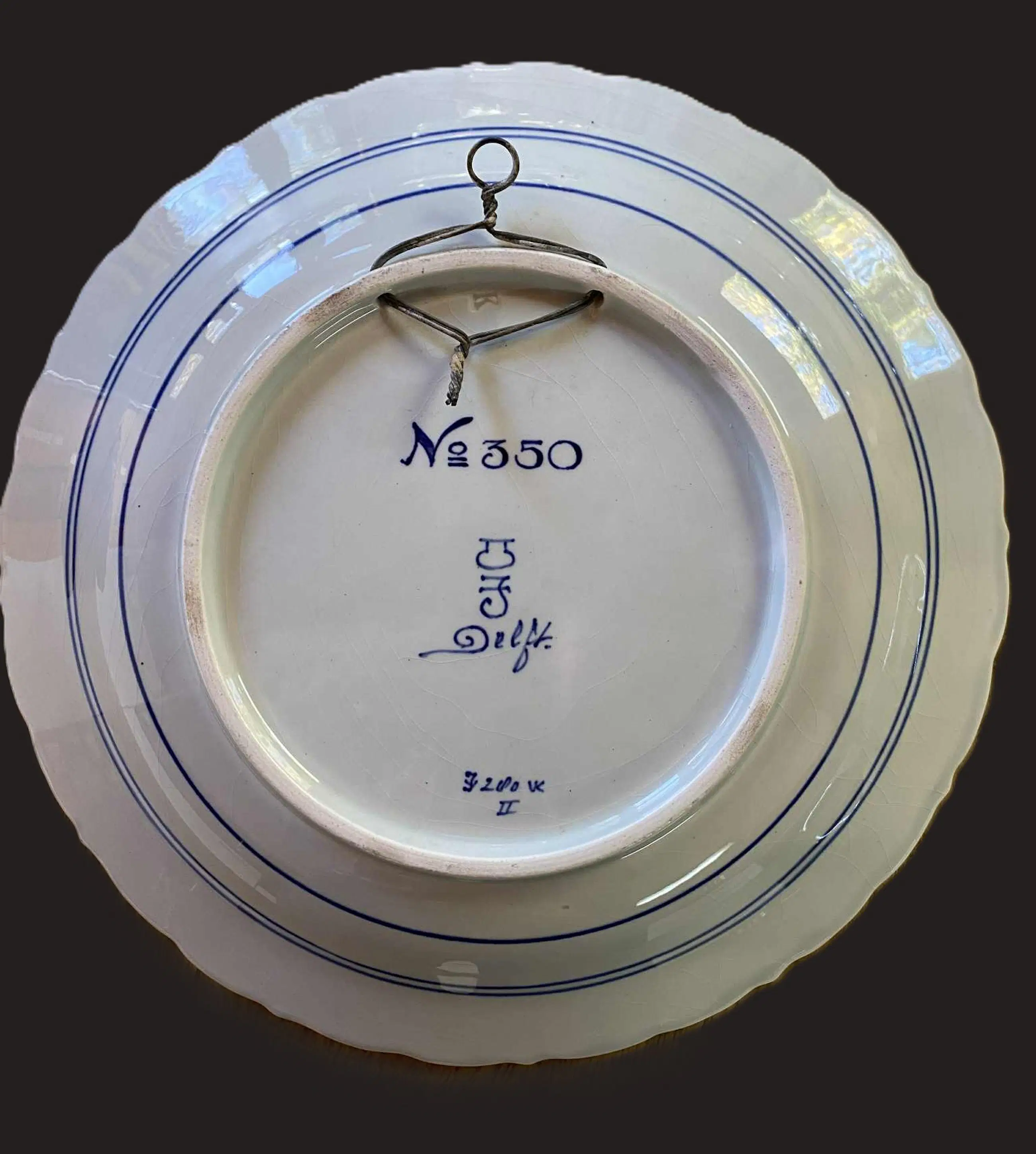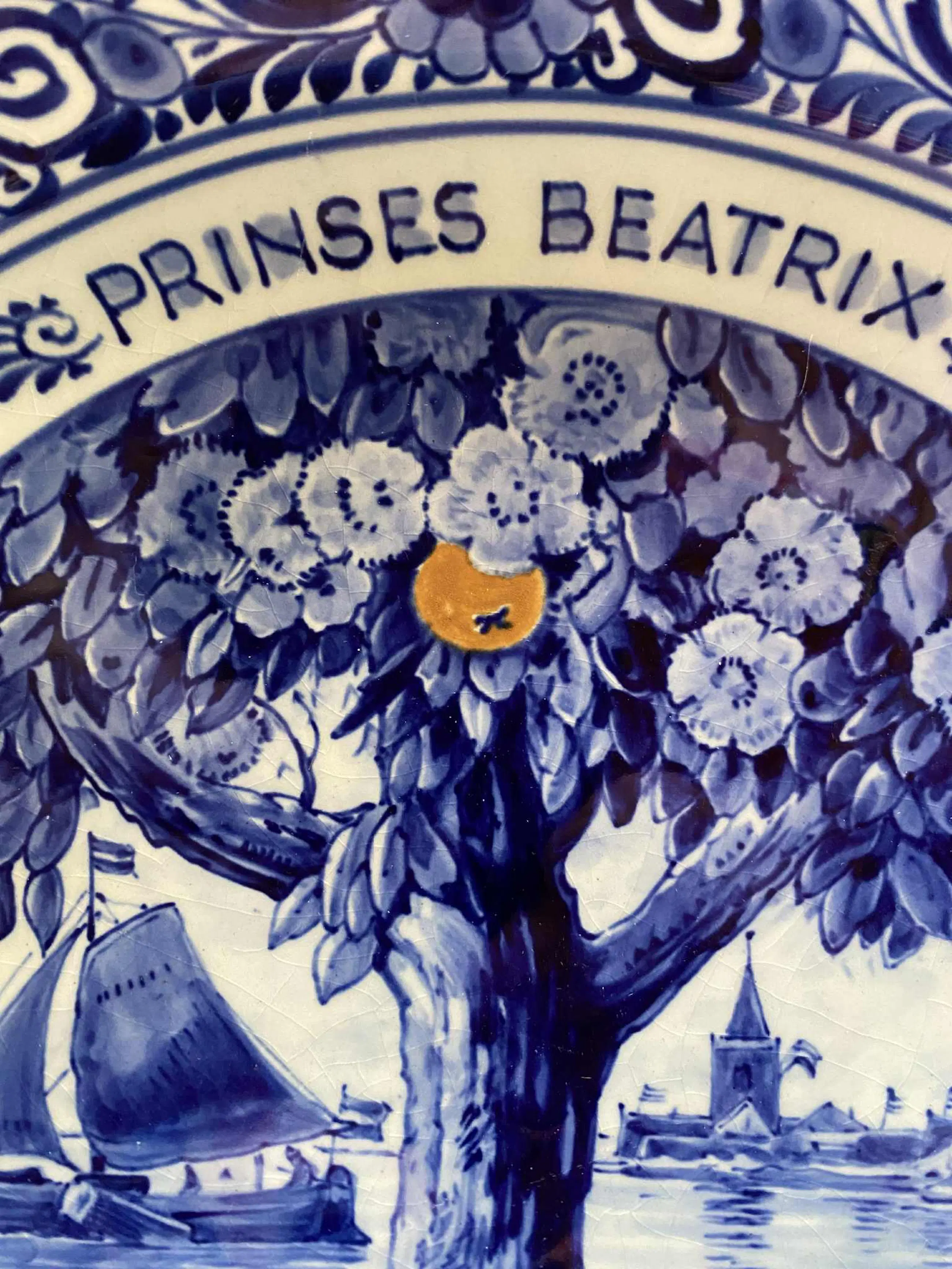 Herdenkingsschotel, De Porceleyne Fles, geboorte Prinses Beatrix, 1938. Aan onderzijde gemerkt. Dit bord is in 1938 uitgegeven bij de geboorte van Prinses Beatrix. Ontwerp P. Senf. Het getal 350 staat voor de oplage maar helaas is niet bijgehouden hoeveel exemplaren er gedurende dat jaar zijn geproduceerd. Het Royal Delft museum heeft no. 565. Er hebben twee schilders aan gewerkt: A.J. van Kampenhout (werkzaam van 1892 t/m 1942) en J.D. van Velzen (1865-1938).