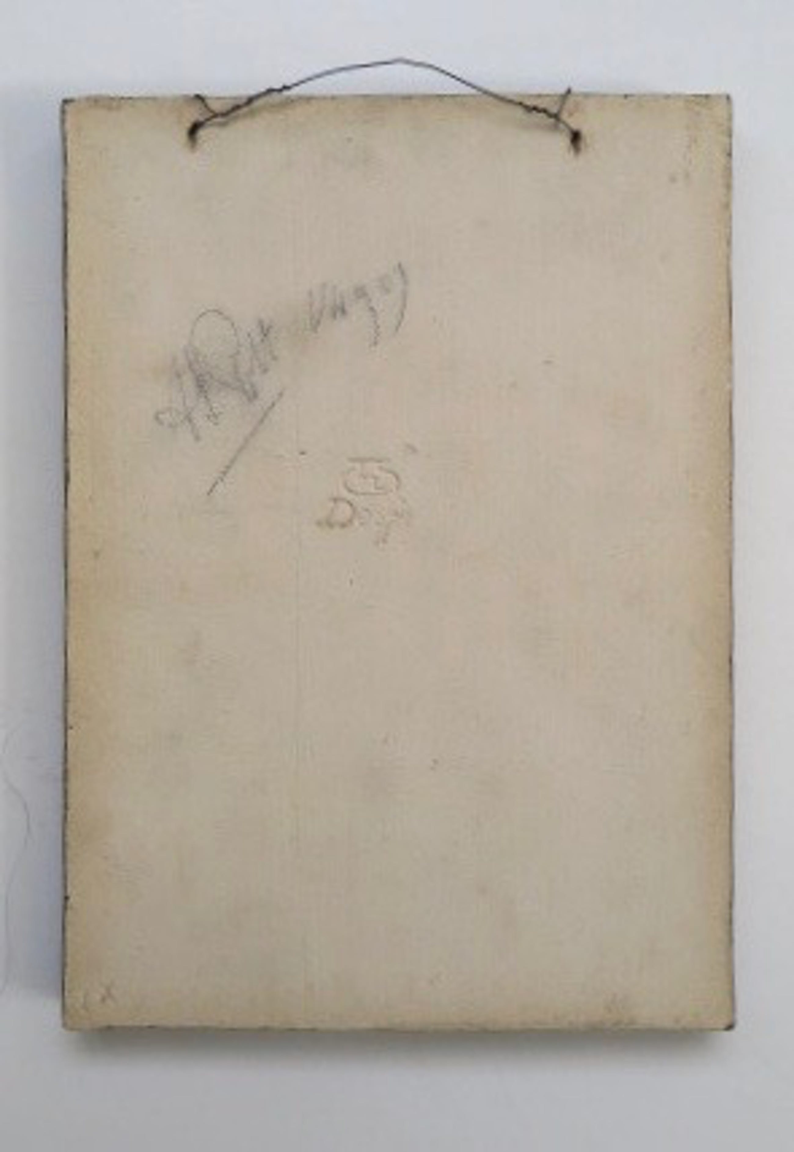 De tegel vormt een geheel met het lijstje dat ook van keramiek is . aande achterkant is het merk van de Porceleyne Fles ingeponst