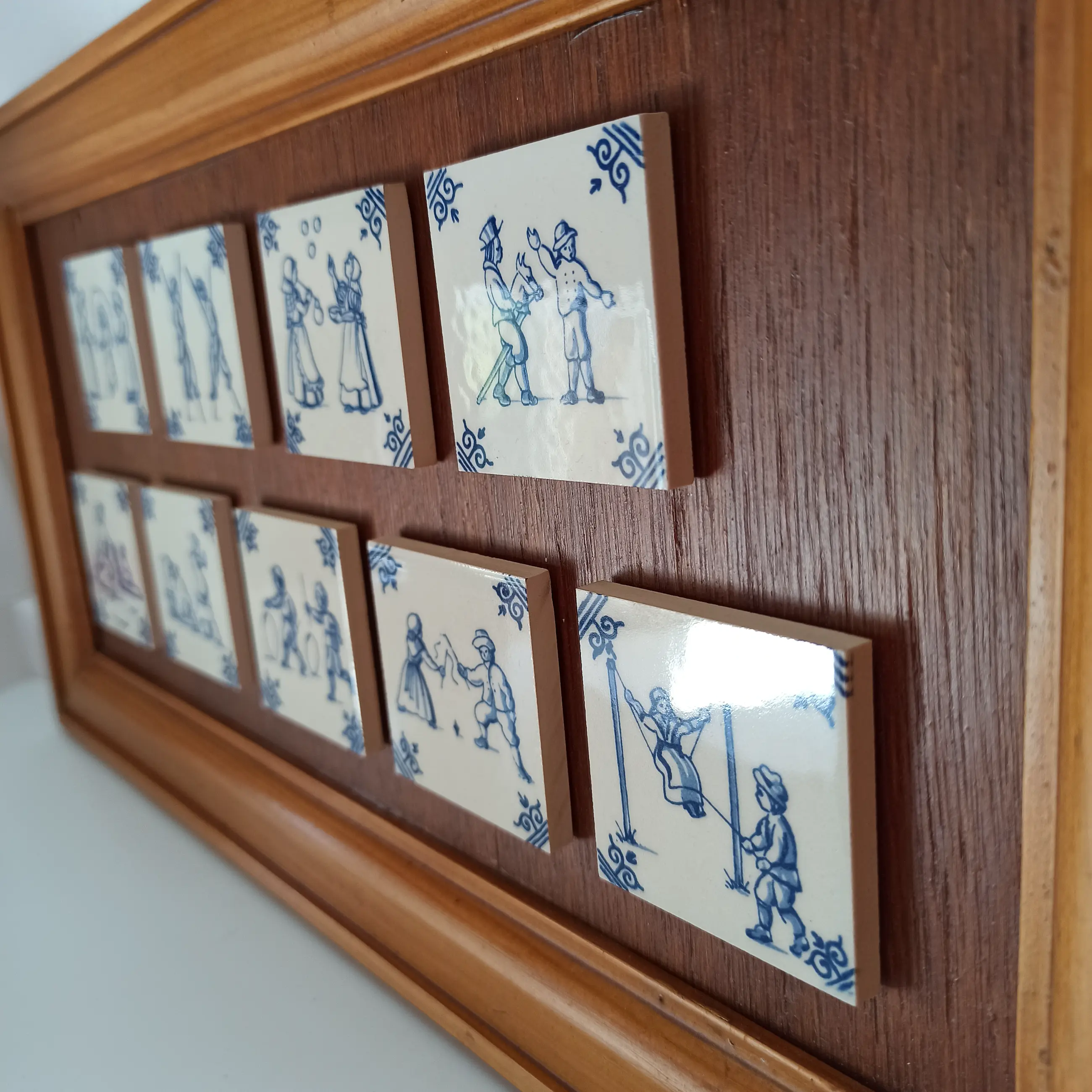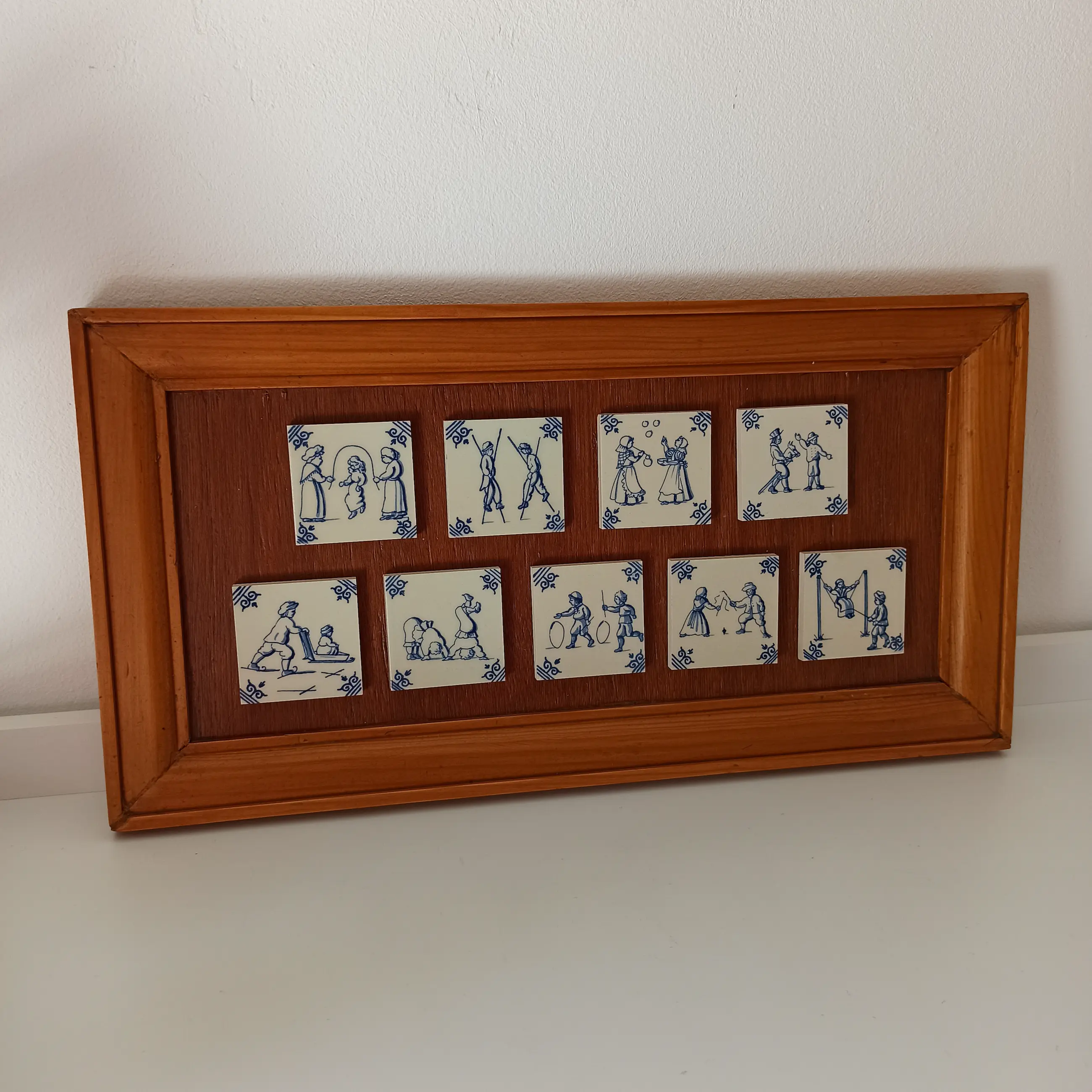 Negen Delfts Blauwe tegeltjes met kinderspelen op een houten plateau.