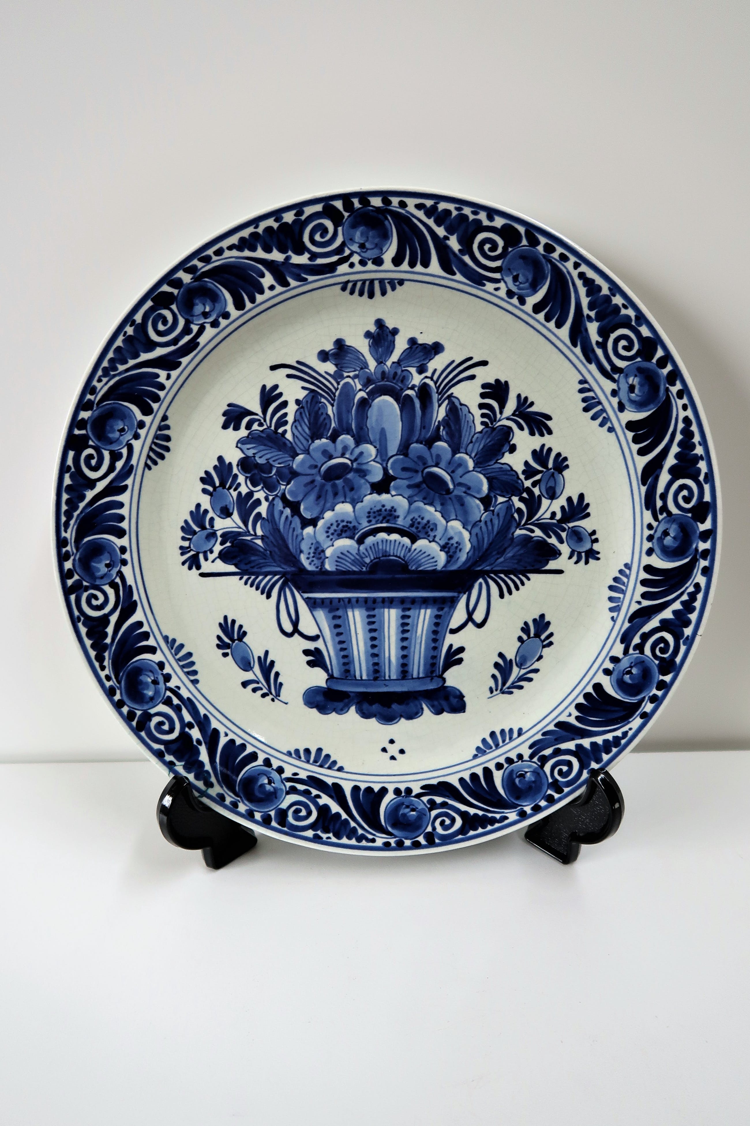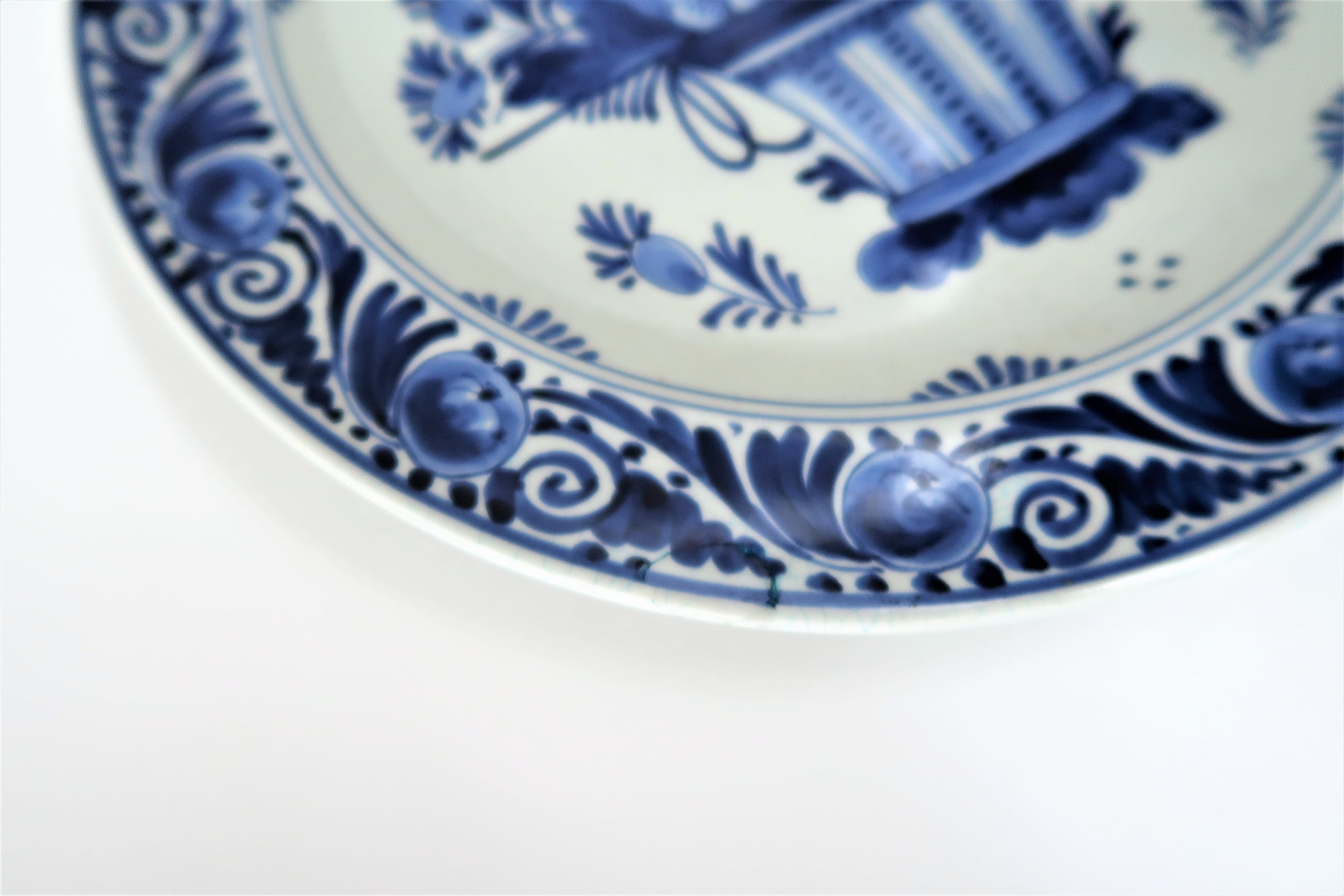 2 Mooi wandbord van de Porceleyne fles, diameter: 25,5 cm op dit met de hand geschilderd Delfts Blauwe bord is de beroemde signatuur van Royal Delft, er is een bloemstuk te zien - het bord is door onze meesterschilder versierd met een grafische decoratie. (het bord heeft een kleine cip)
