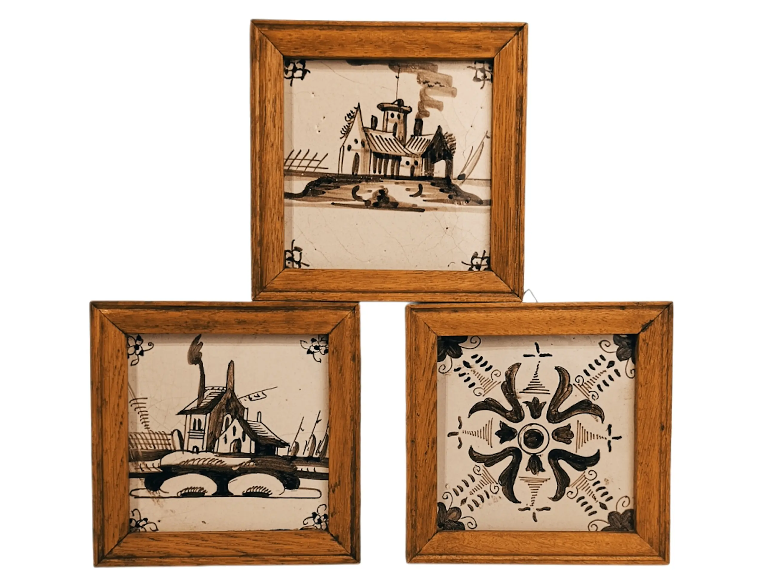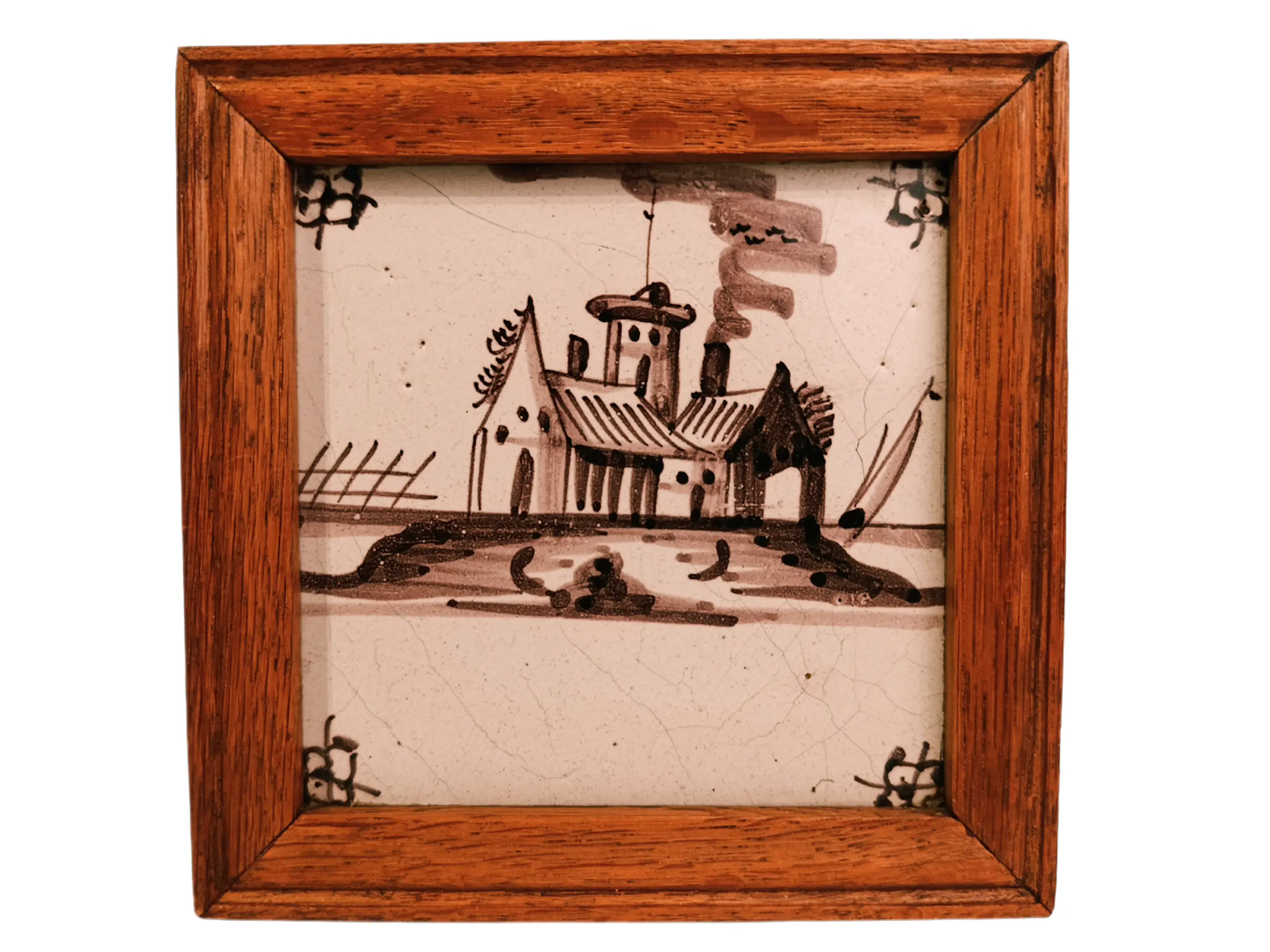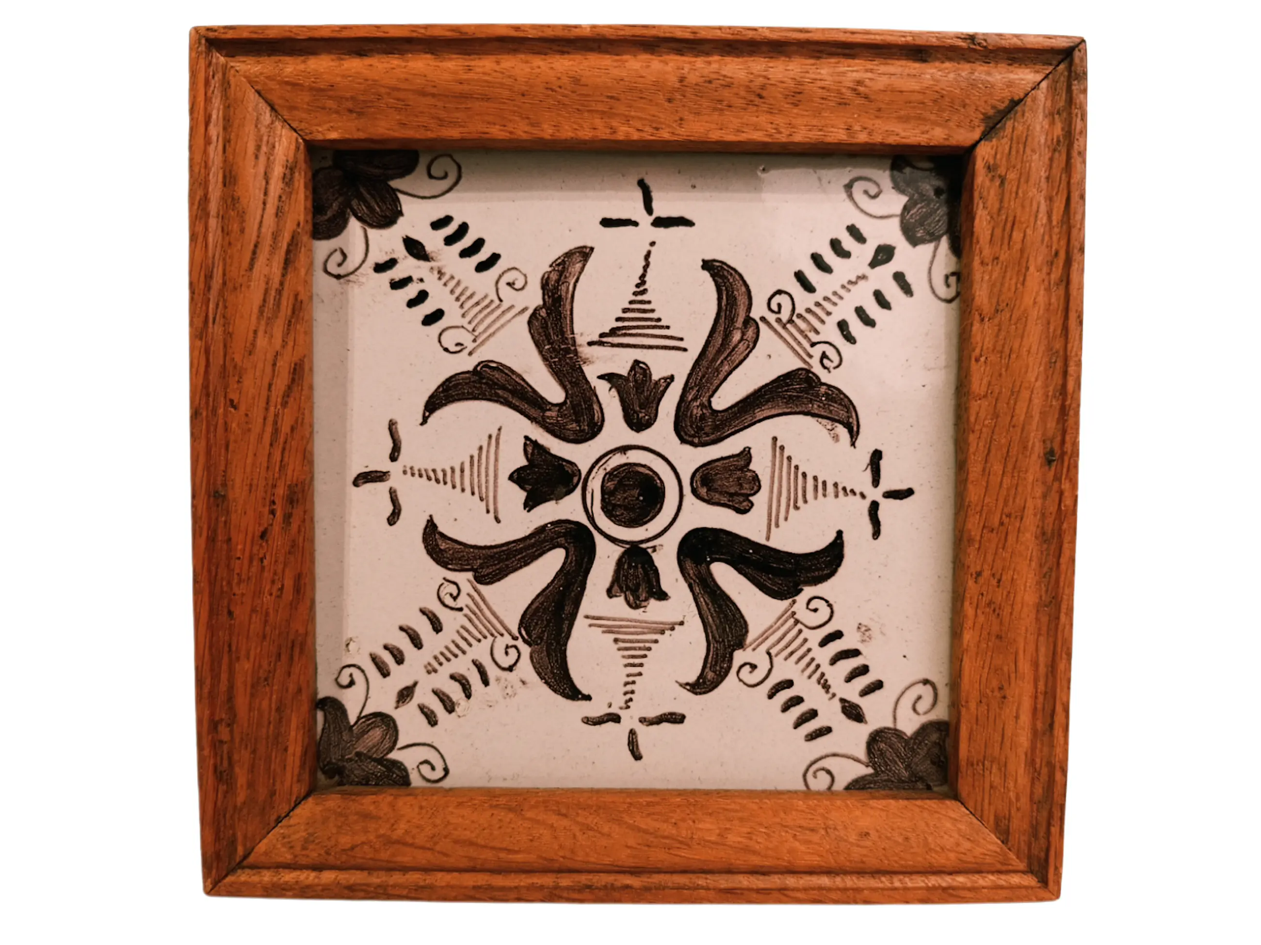 DELFT Antieke geglazuurde aardewerken tegels uit Delft. Mangaanversiering. In zeer goede staat. Natuurlijk hebben de eeuwen hun sporen achtergelaten. Geen restauratie. De glans is behouden gebleven. Prachtig ingelijst en klaar om op te hangen. Afmetingen zonder lijst: 13/13/1 cm