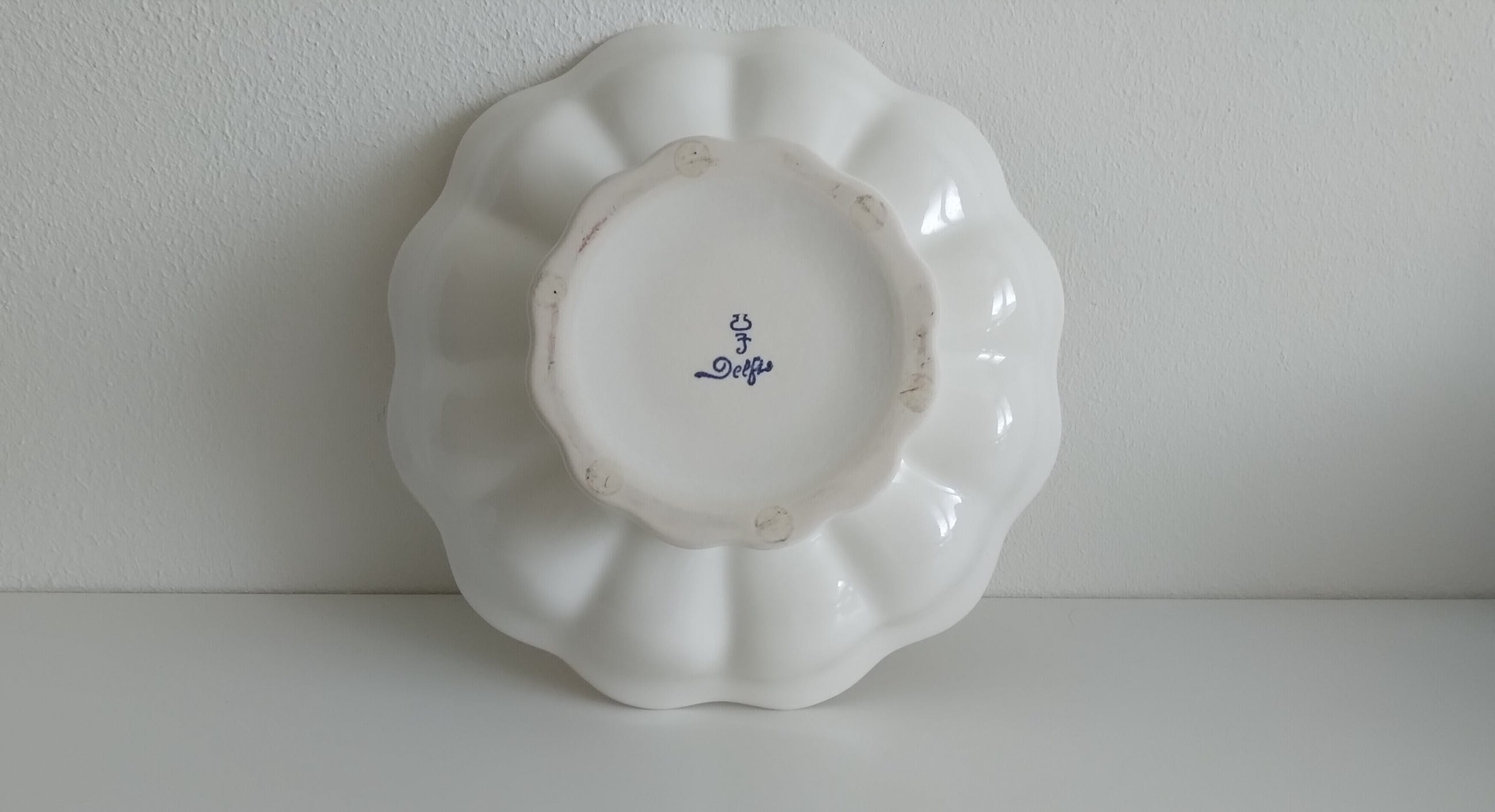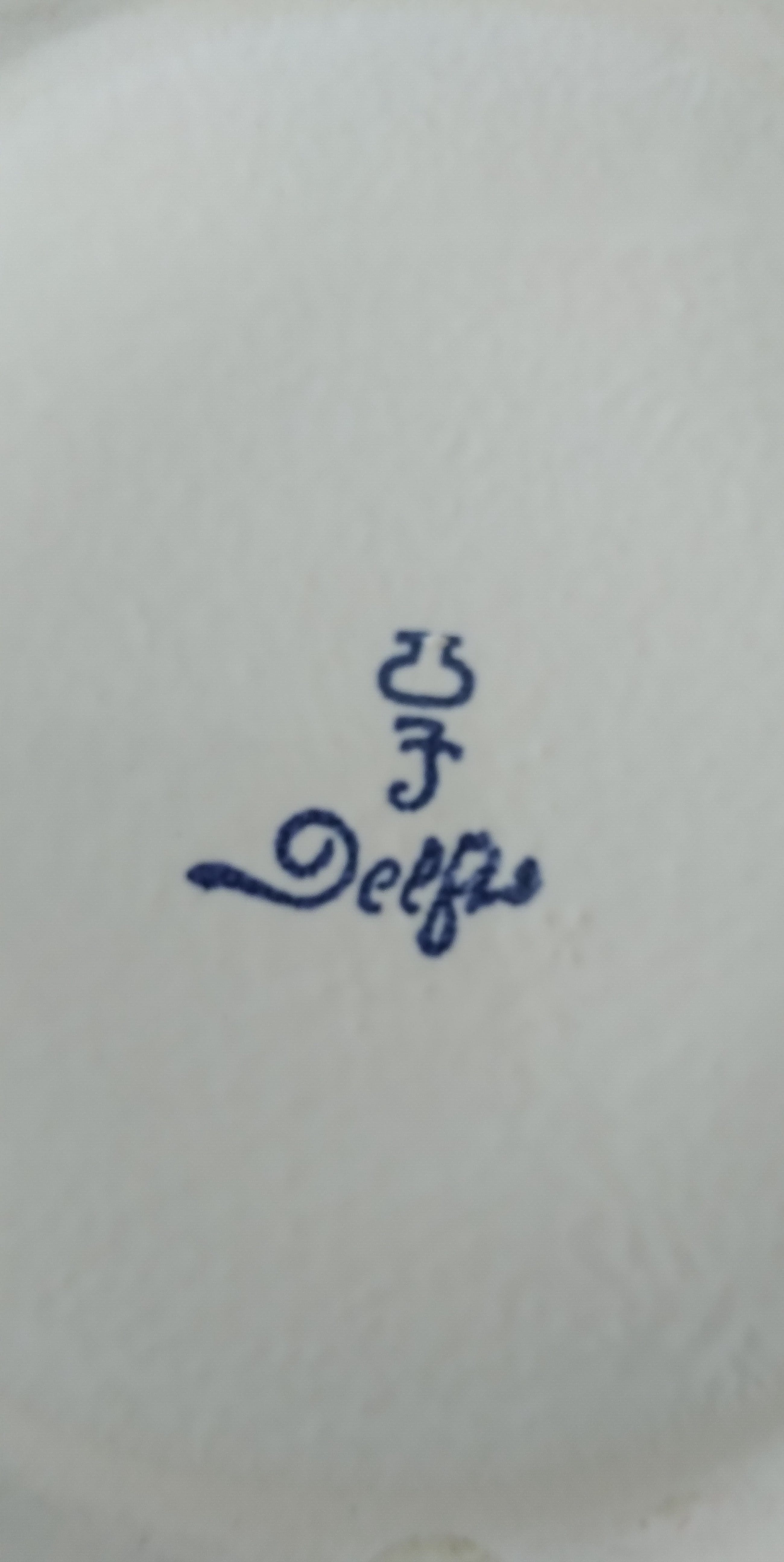 Merkteken: Flesje, JT, Delfts. JT staat voor Joost Thooft (1844-1890), hij werd eigenaar van De Porceleyne Fles te Delft in 1877.