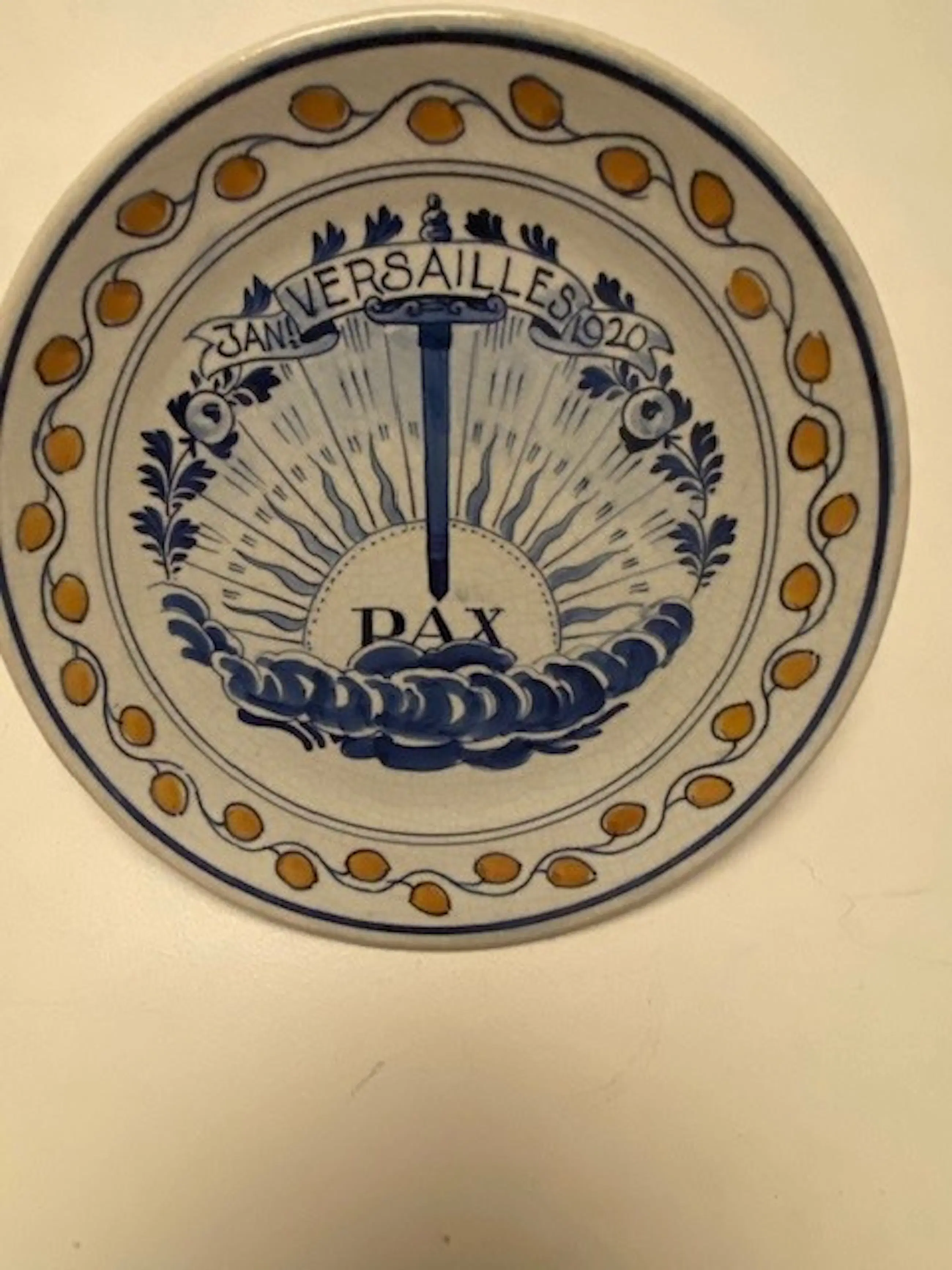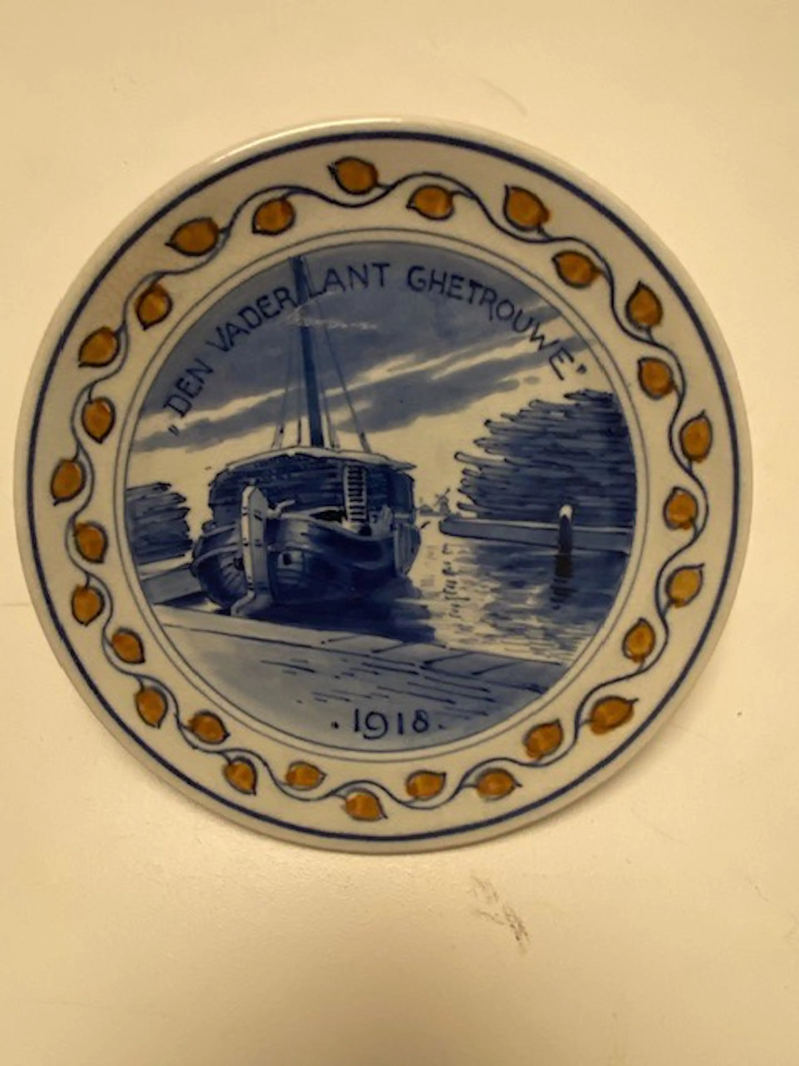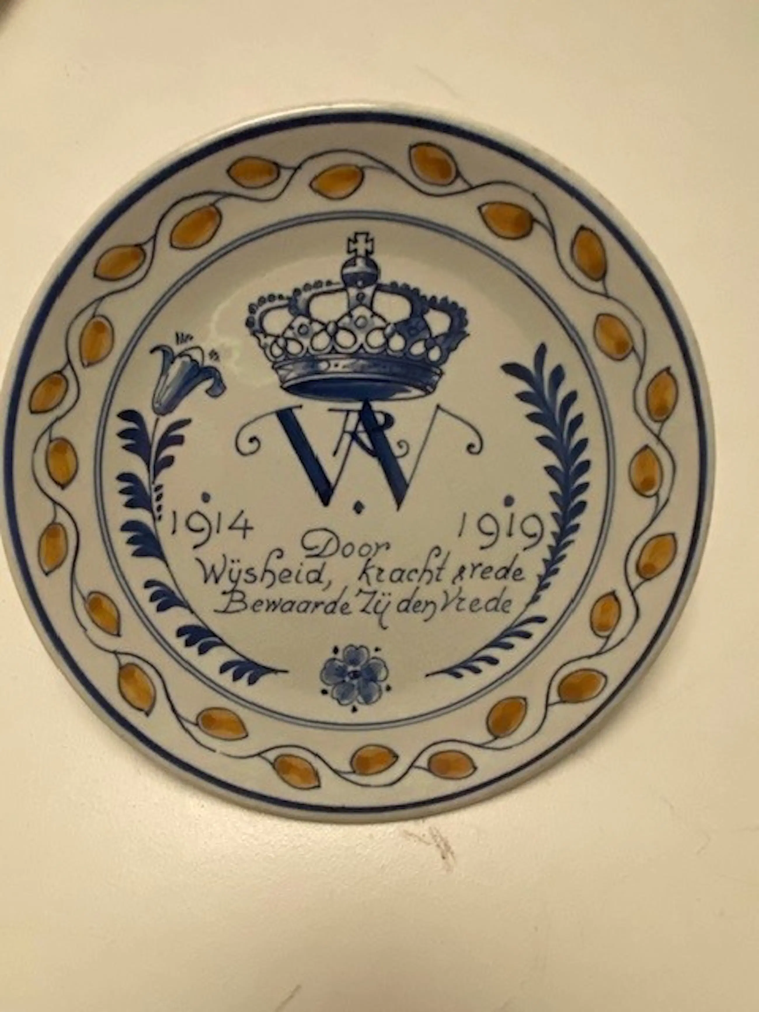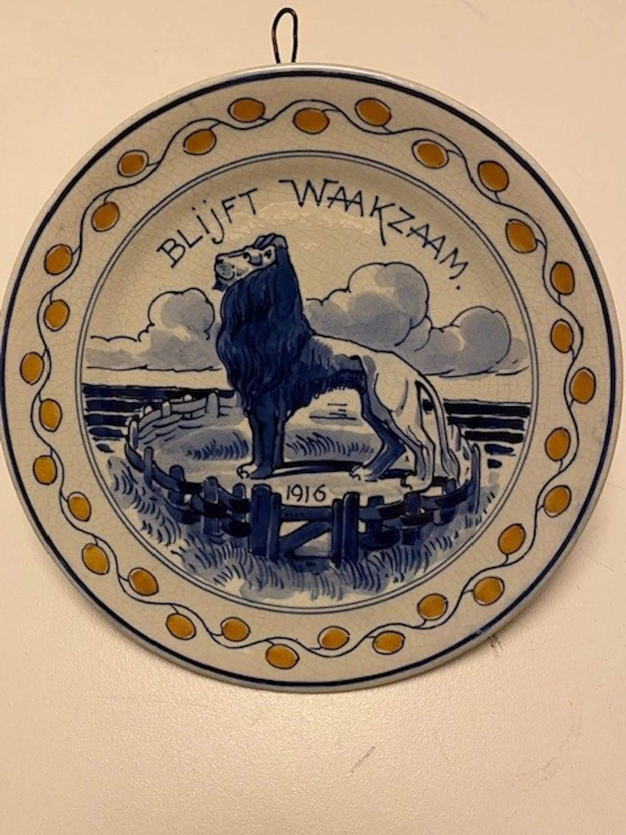 Een zeldzame en complete serie van 10 historische oorlogs-bordjes uit de periode 1914–1919, vervaardigd in de stijl van het klassieke Delftse plateel. Deze bijzondere reeks werd ontworpen als artistieke weerslag van de turbulente jaren van de Eerste Wereldoorlog, met elk bord voorzien van een eigen symbolische voorstelling en Nederlandstalige spreuk.