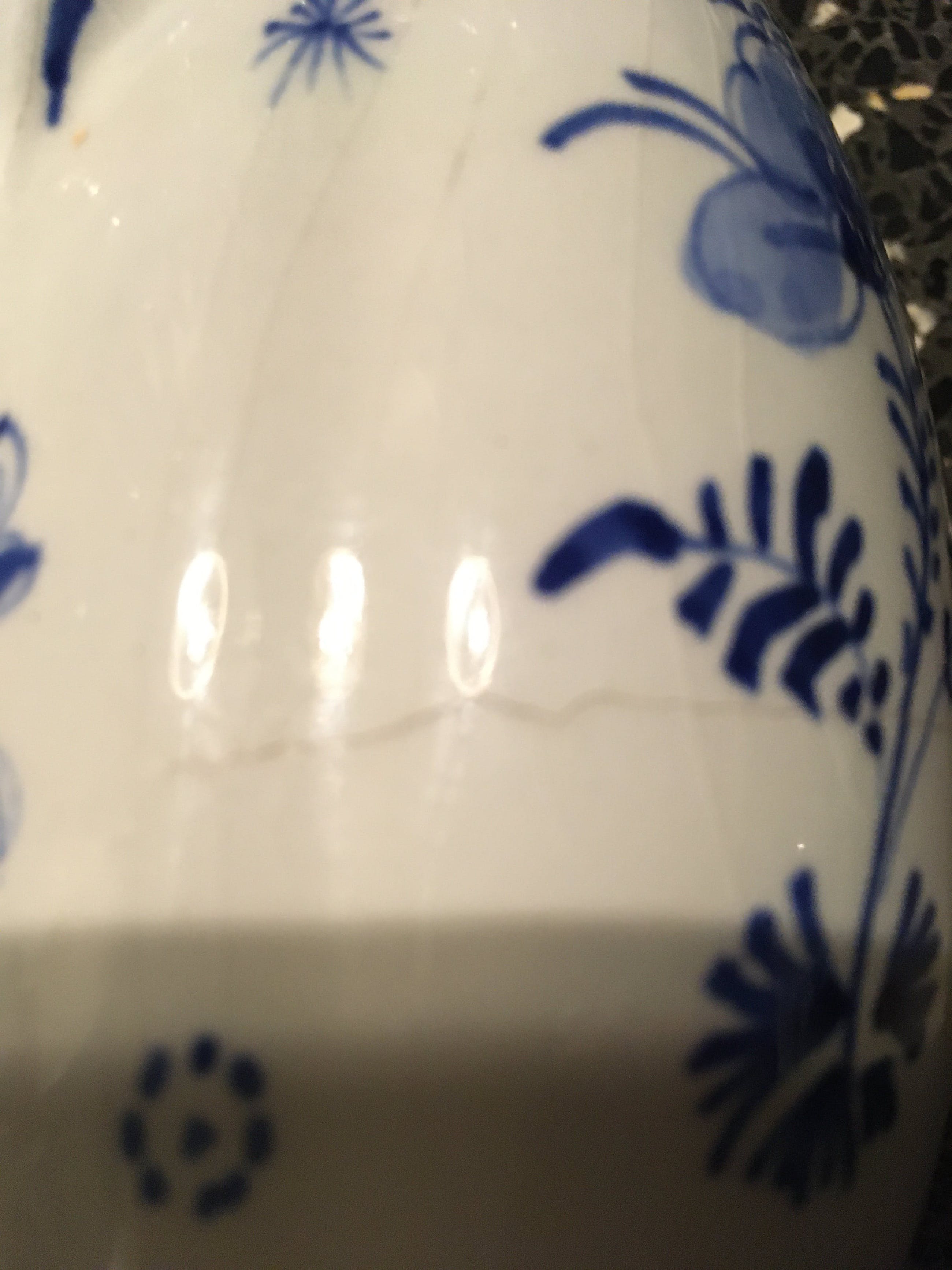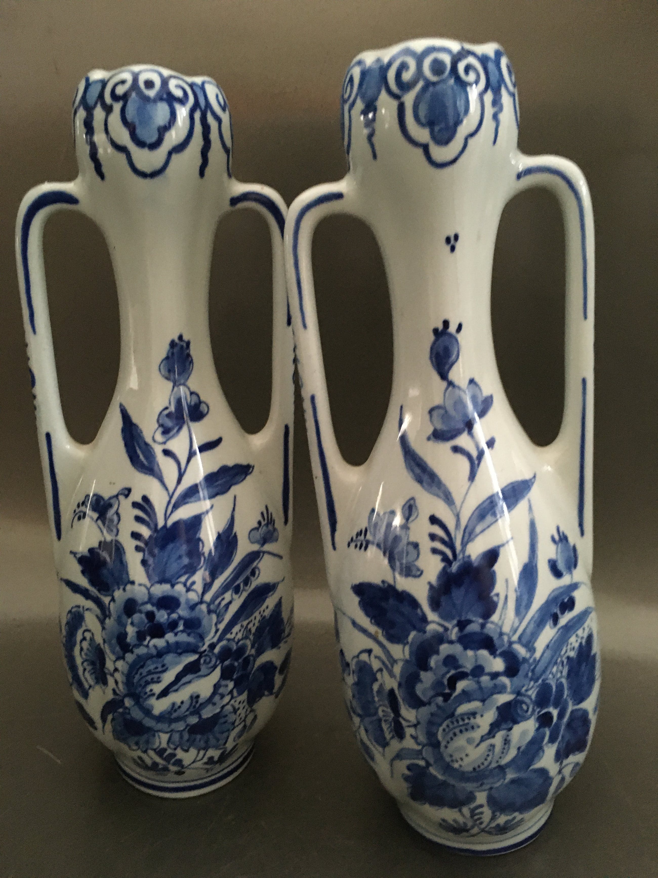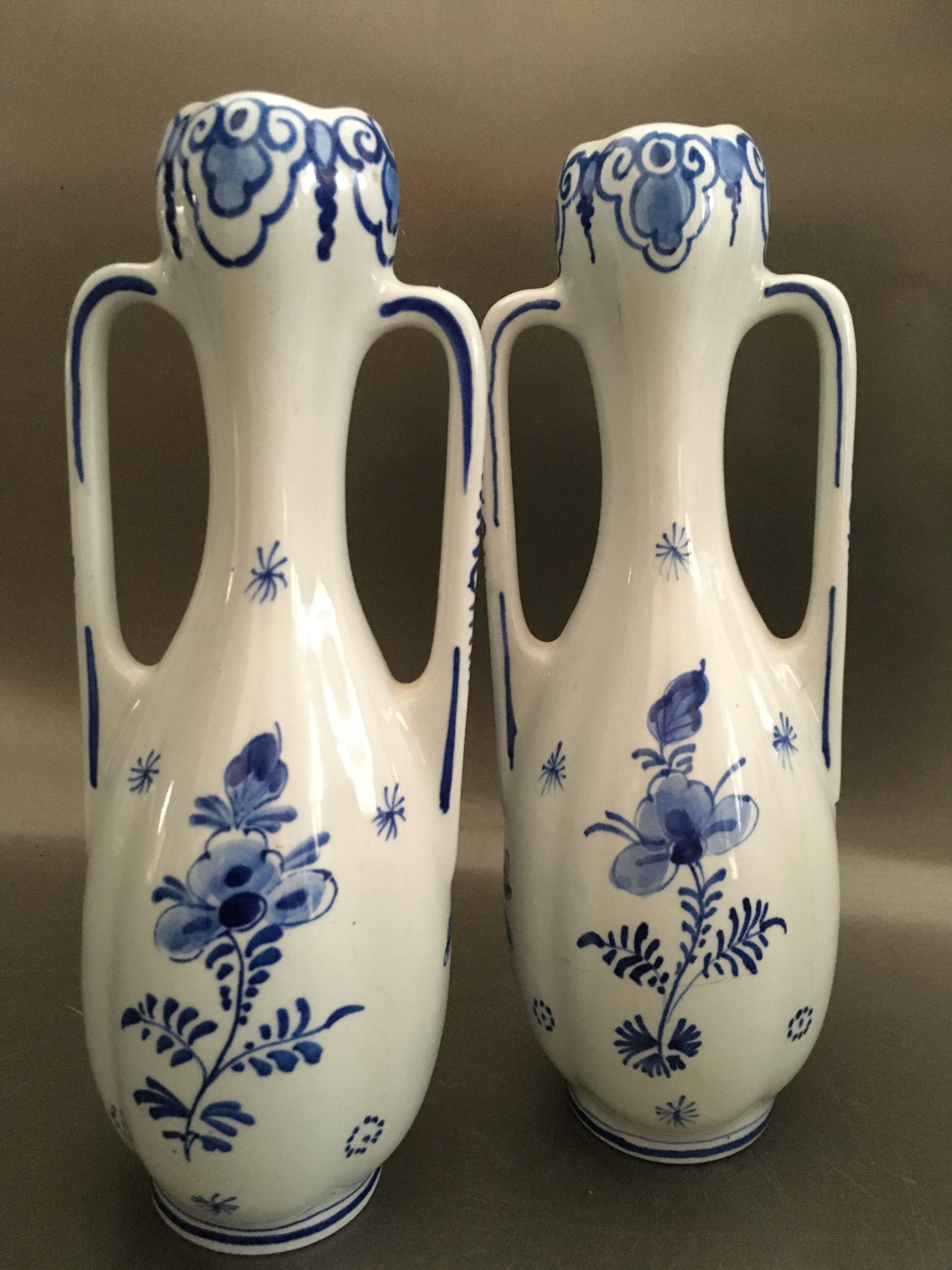 Twee elegante vaasjes met lange oren, gemerkt, gesigneerd en genummerd op de onderzijde. Heel mooi handbeschilderd decor. Eentje heeft een barst overdwars aan de achterzijde.