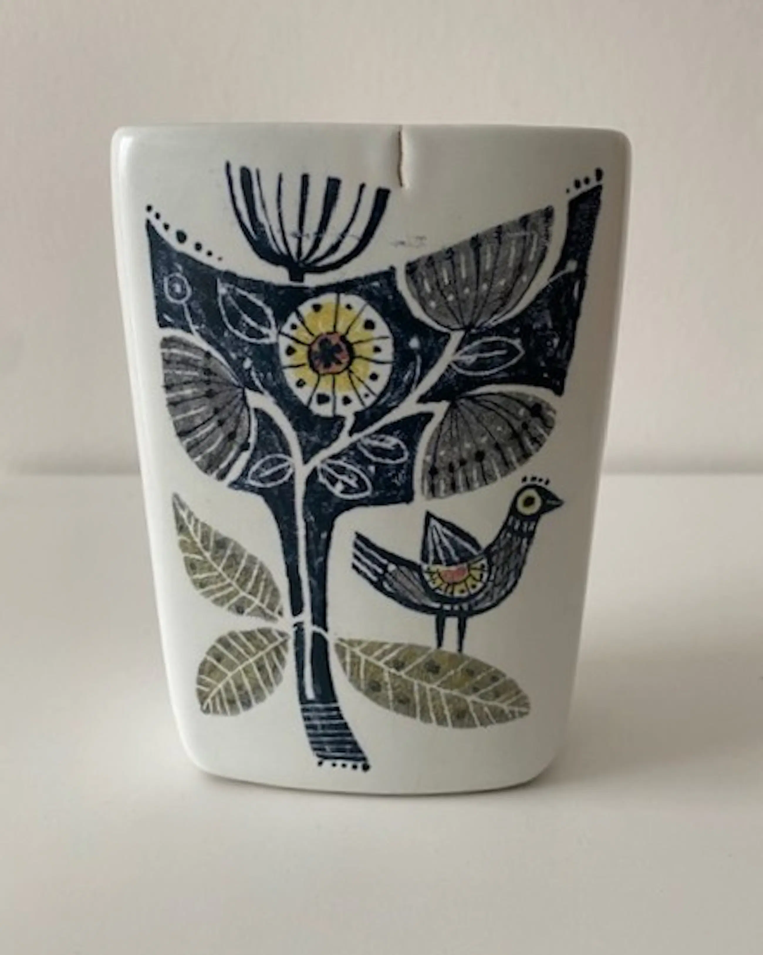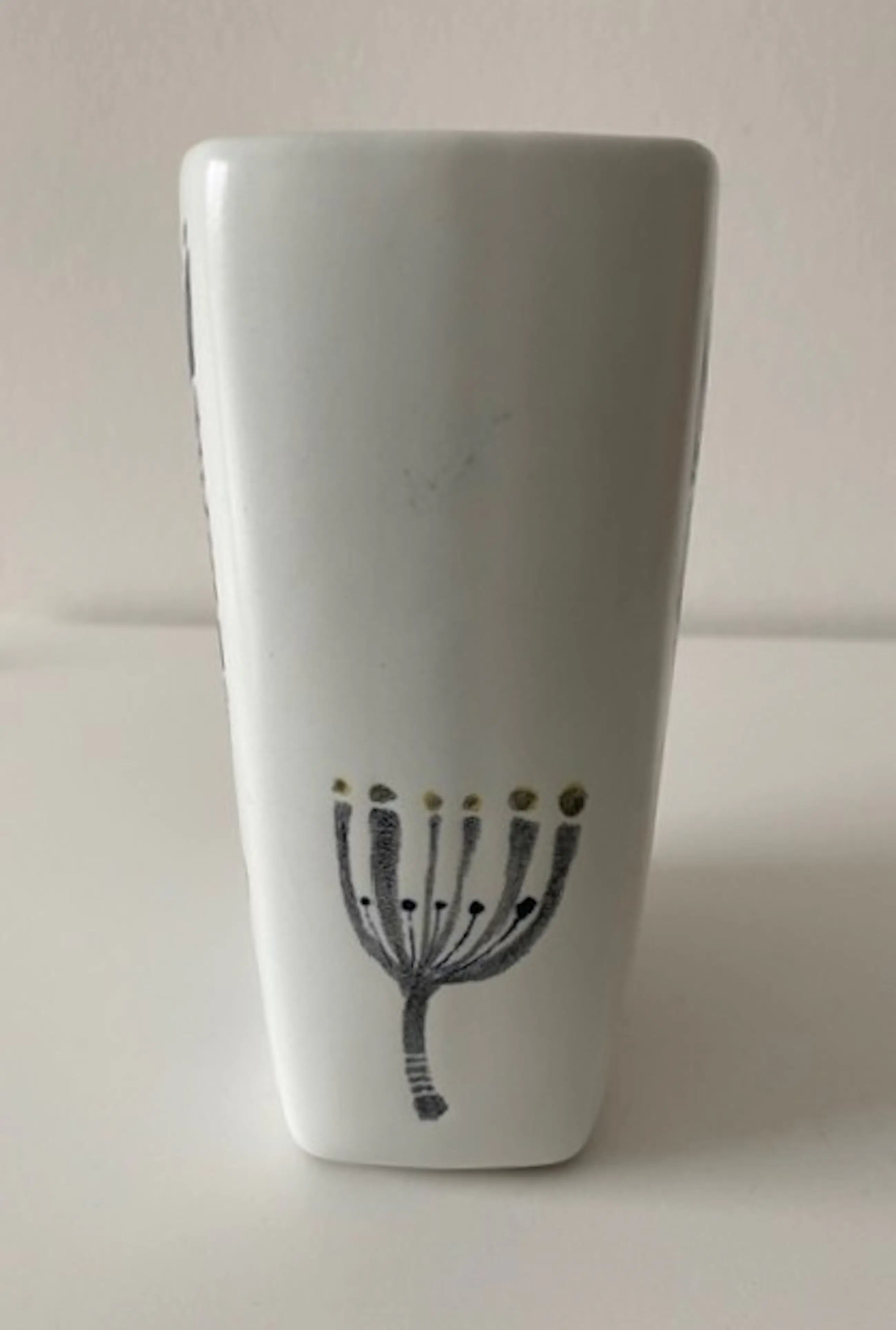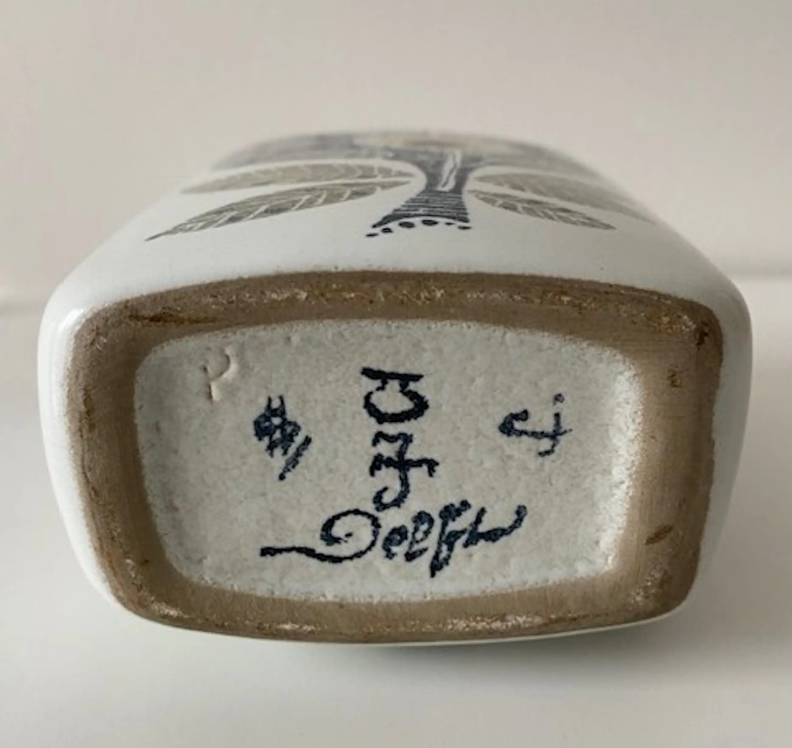 Ontwerp en uitvoering Hans Sanders 1965 Bij de Porceleyne Fles Delft Bijzonder decor handgeschilderd Gesigneerd ( HS) en jaarletter (CJ) Kleine onvolkomenheid glazuur bakproces rand (zie foto) Collecters item