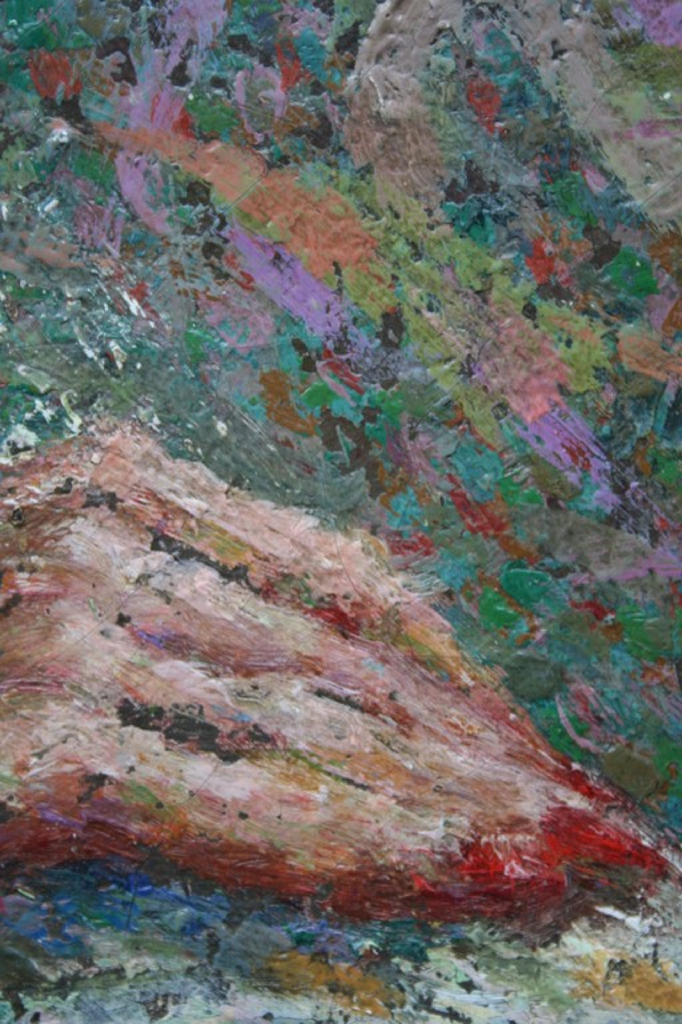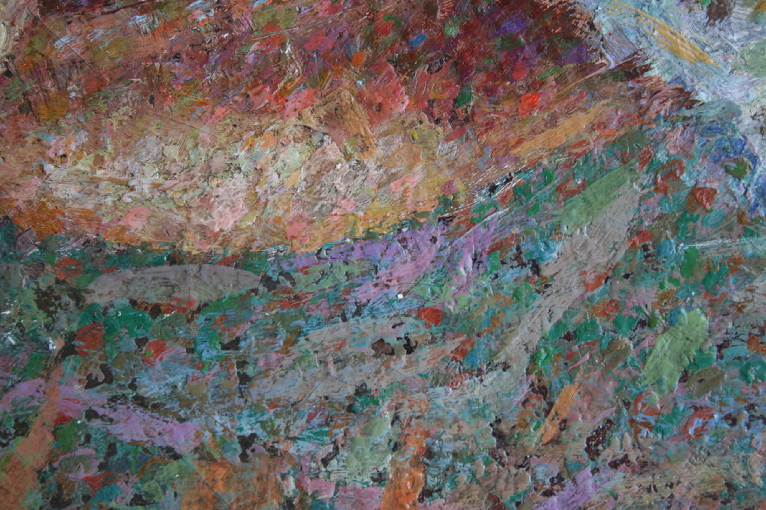 Het is een bijzonder schilderij. Professioneel vervaardigd, waarbij een techniek is gebruikt van korte streepjes, soms iets lange streken en dat meerlaags. Zie detail foto's. Op afstand is het portret een geheel.
