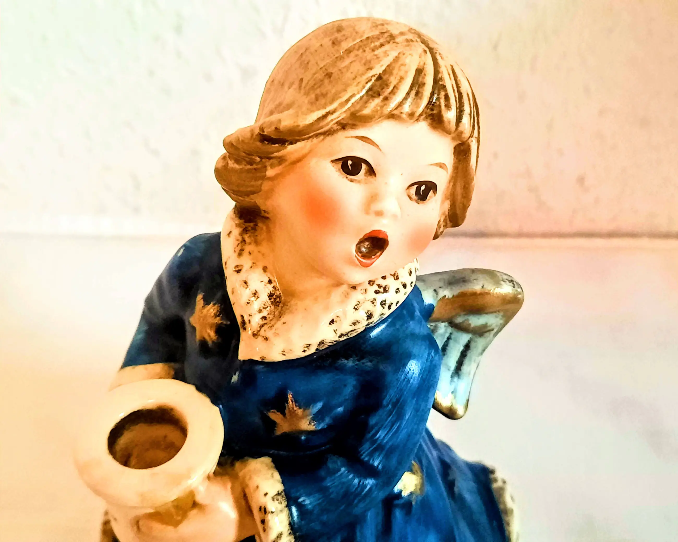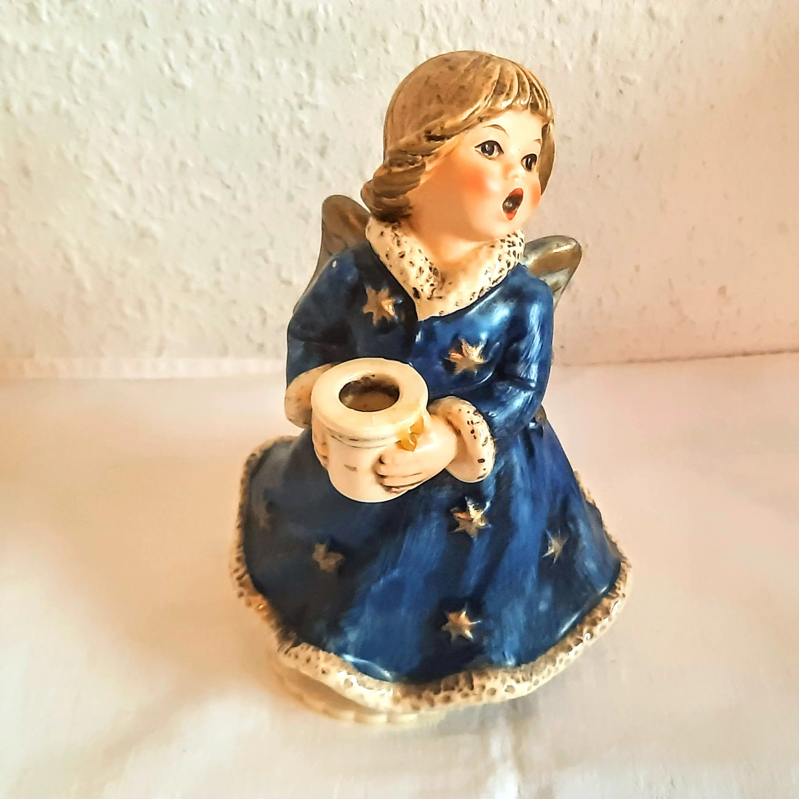 Het porseleinen beeldje toont een zingende kerstengel in een blauwe jurk met gouden sterren, een lichte kraag en een lichte rand aan de onderkant van de jurk. Ze houdt een kleine, bekervormige kaarsenhouder in haar handen.
