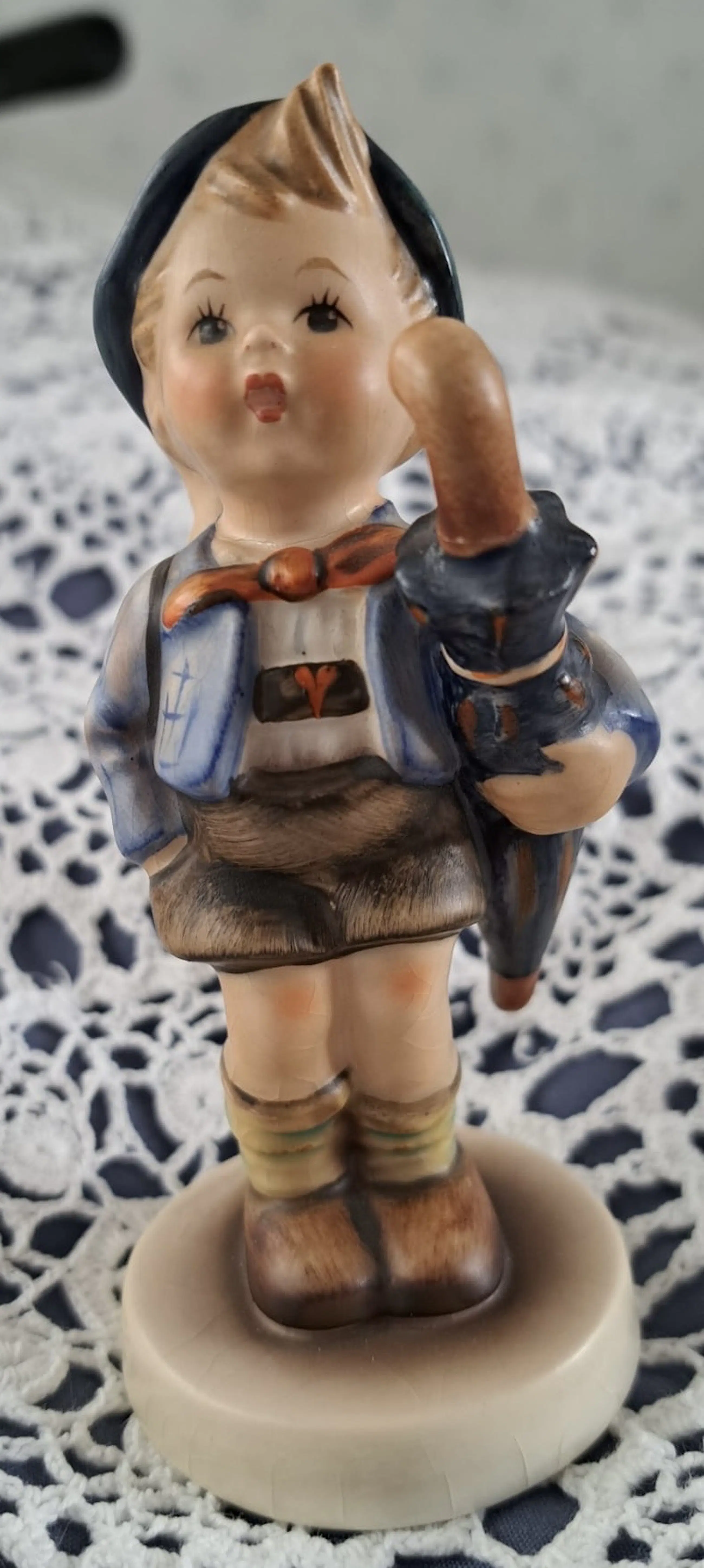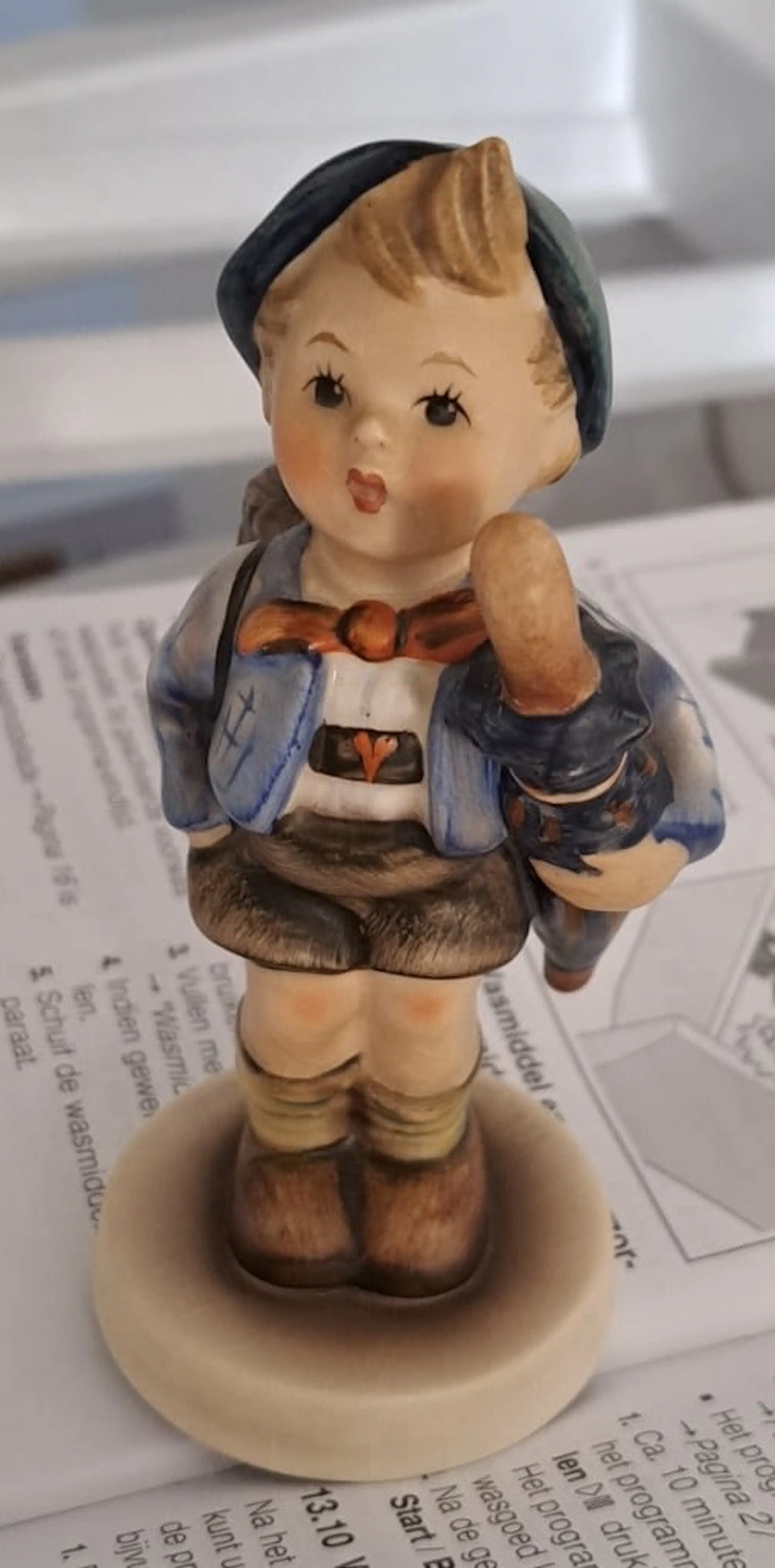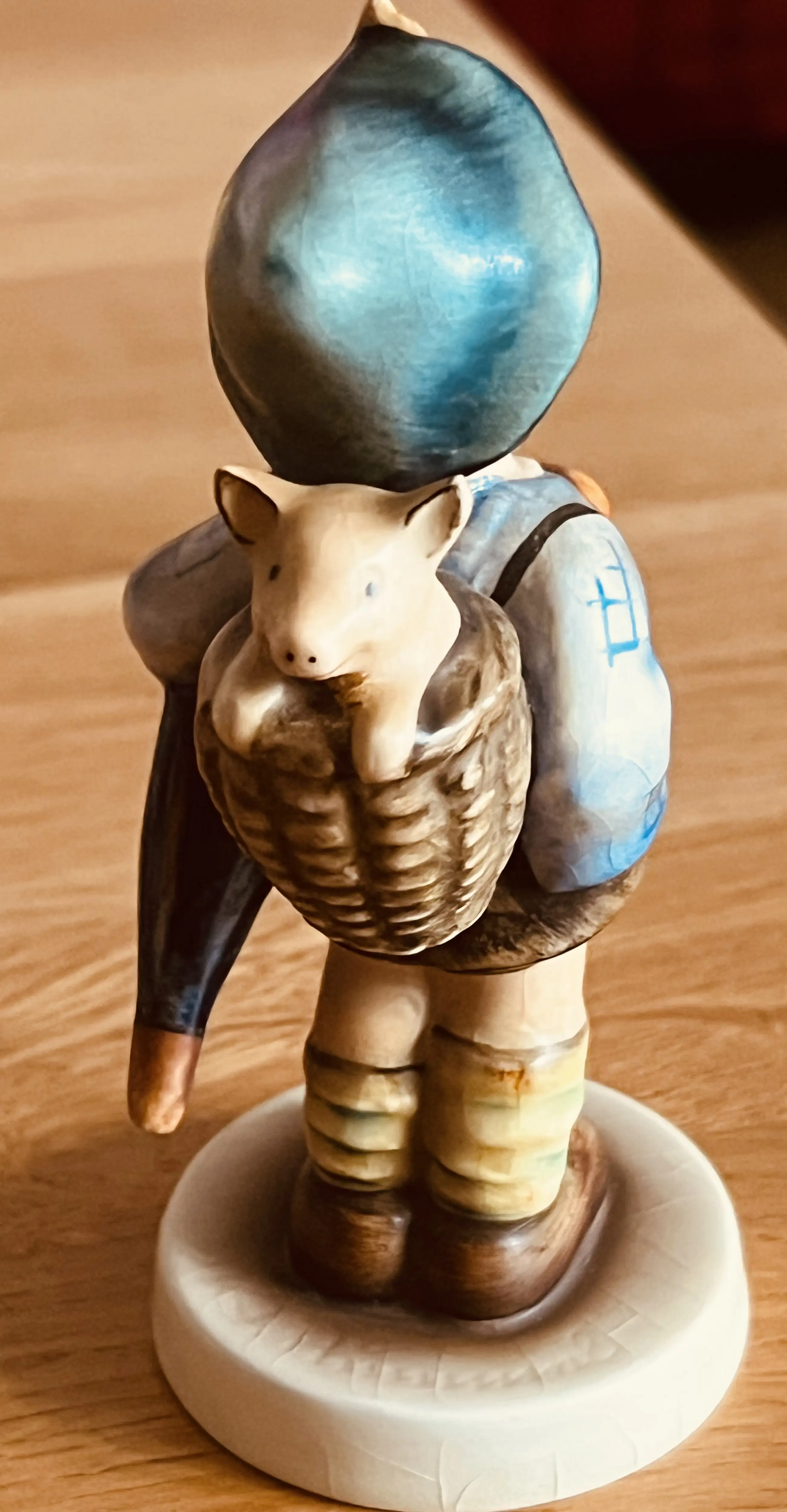 Schattig Hummel beeldje van een jongen met een varkentje in een mand op zijn rug. Het beeldje is in zeer goede staat. Nr 1948 op voet.