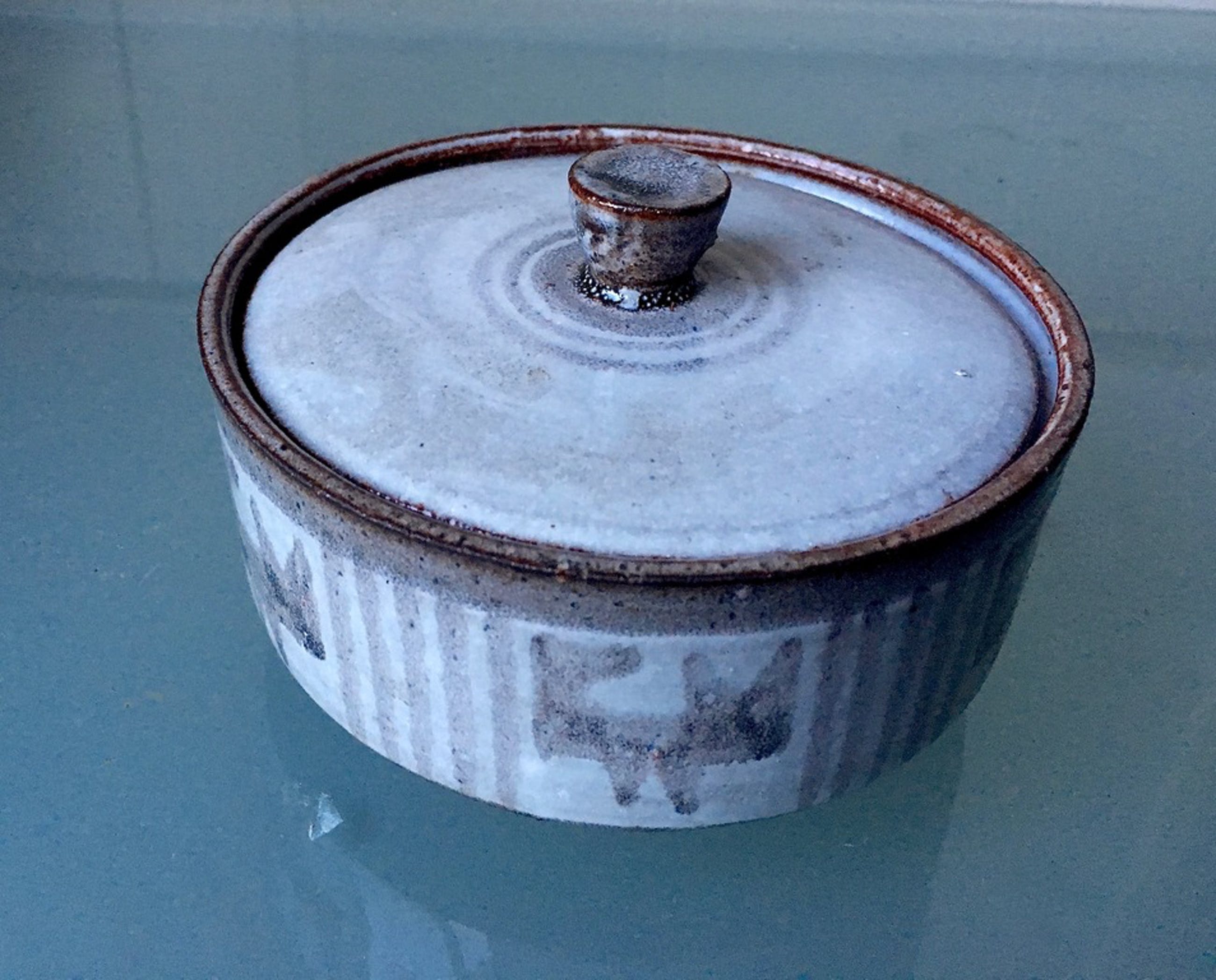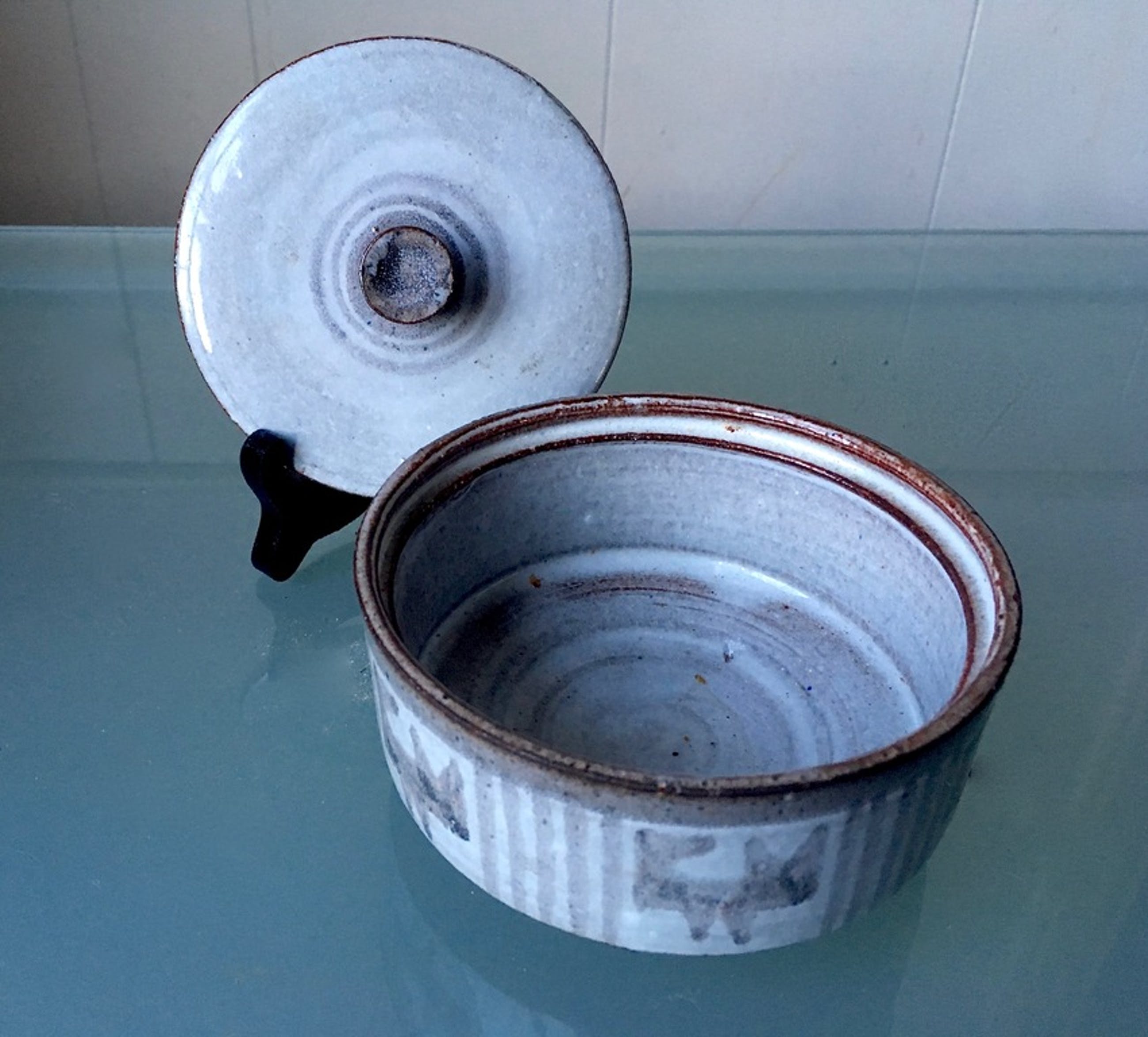 Mooi ontworpen dekselschaal met stilistisch decor van dieren. De dekselschaal is uitstekend gemerkt.