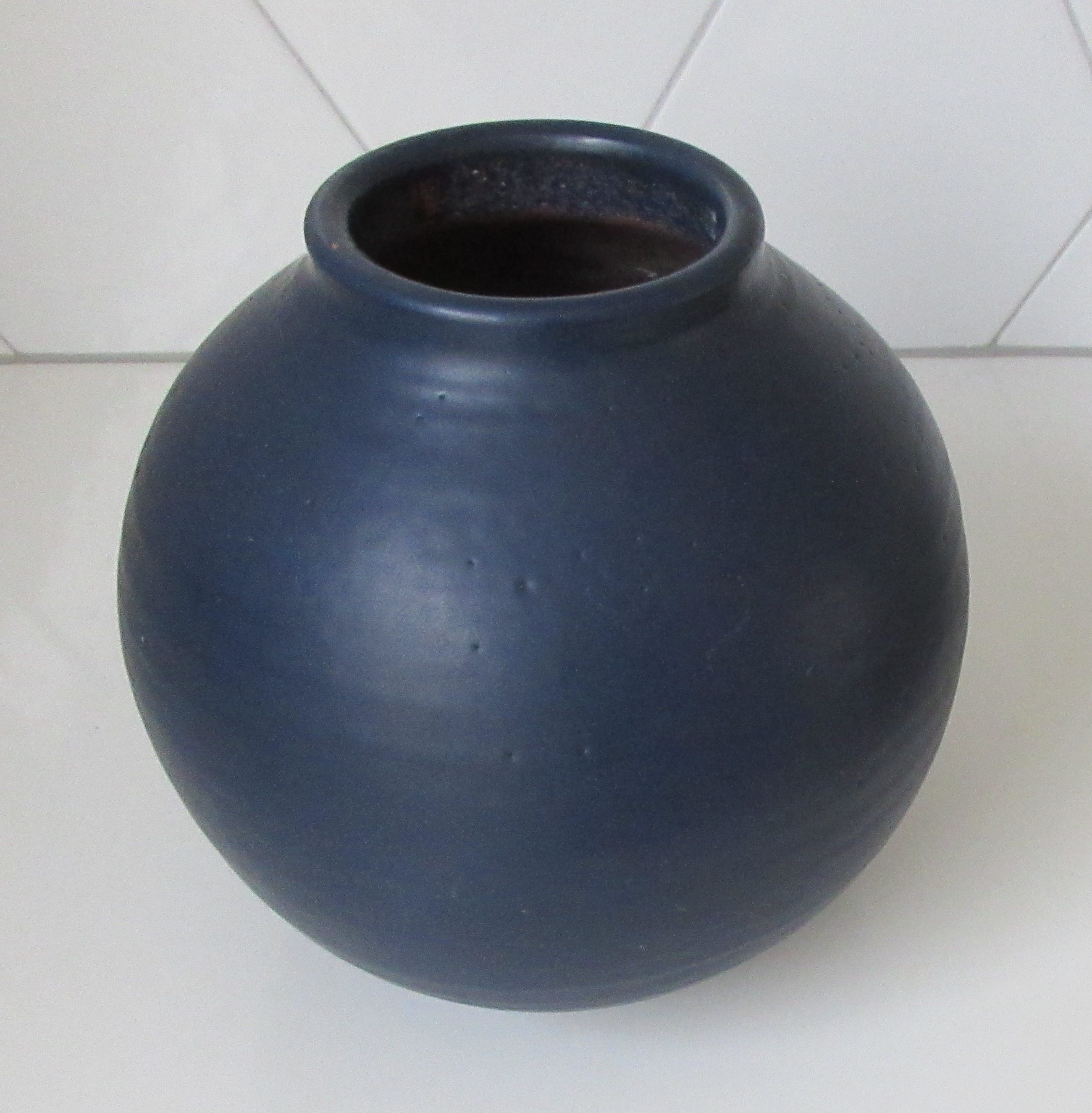Blauwe Bolvaas ontwerp Henno Kurstjens voor Potterie De Olde Kruyk uit Millingen a/d Rijn. Volledig gemerkt DOK en gesigneerd HK op de onderzijde. Heeft alleen op de bodem een aantal (glazuur) flinters.
