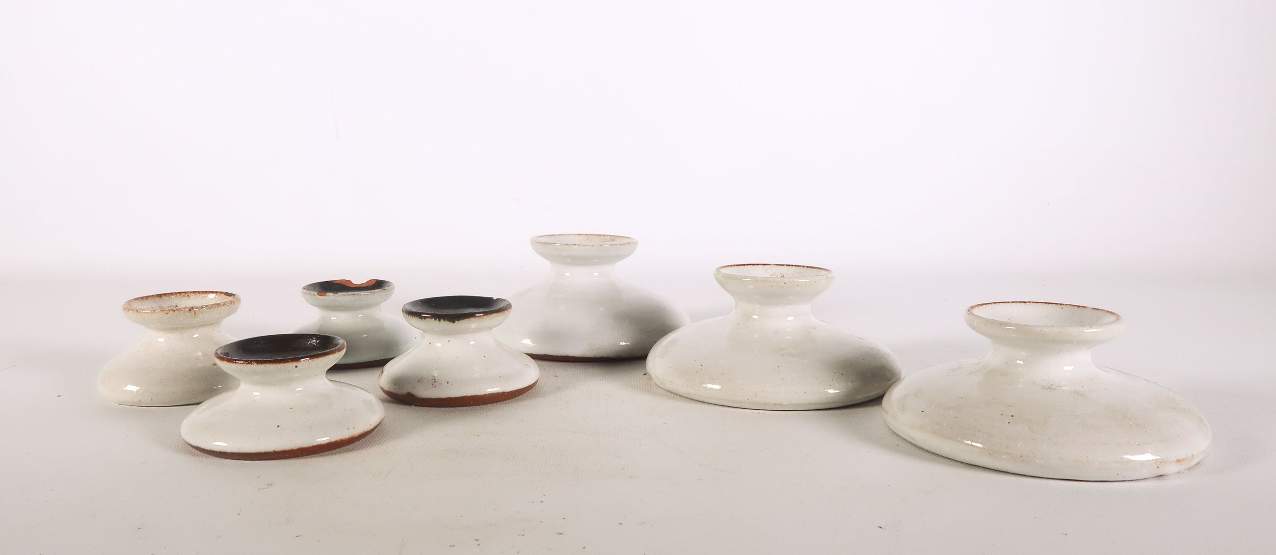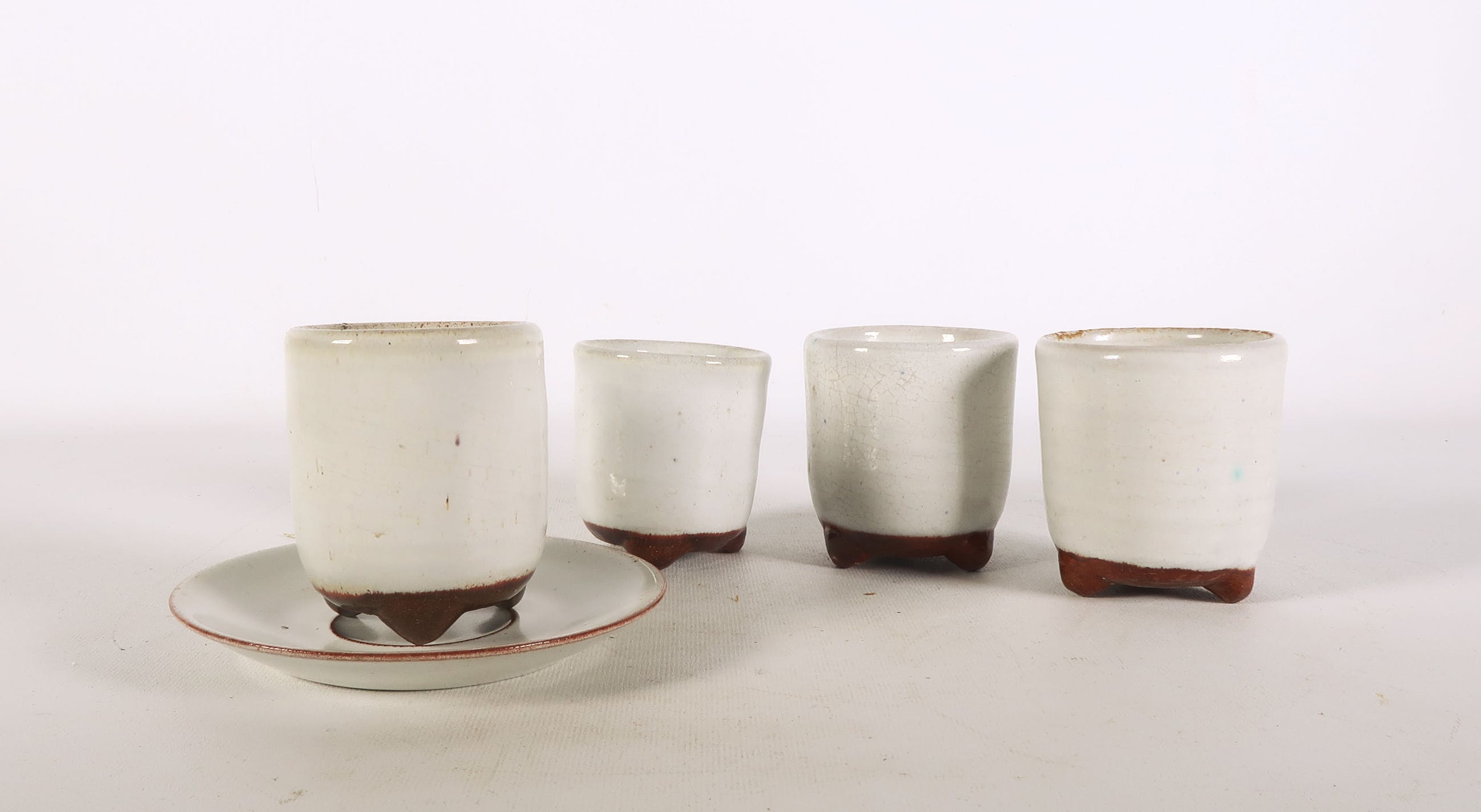 De bekers zijn ruw langs de randen. Één beker mist een scherf uit het glazuur langs de rand, een andere beker is beschadigd aan de drie-poot.