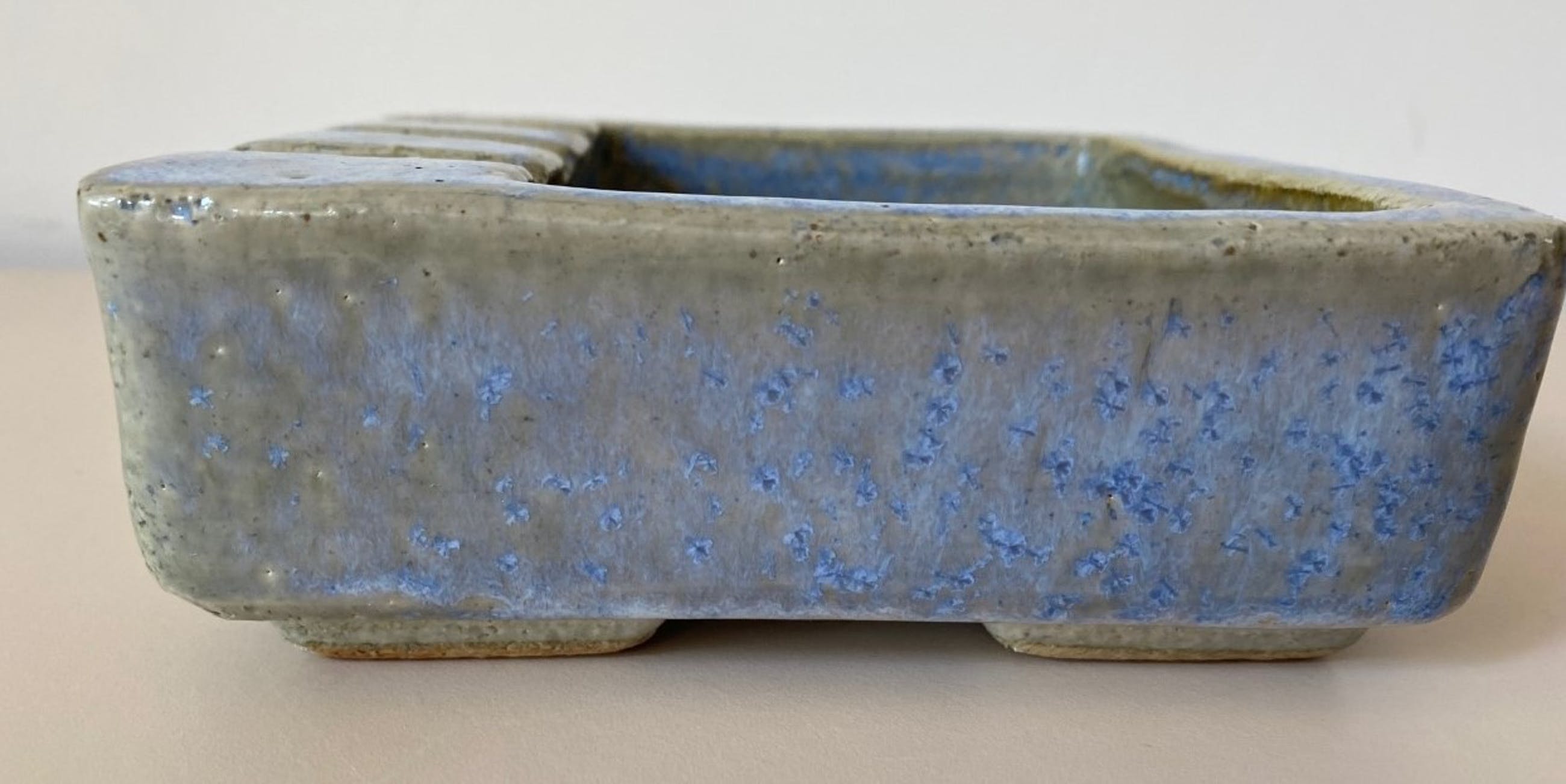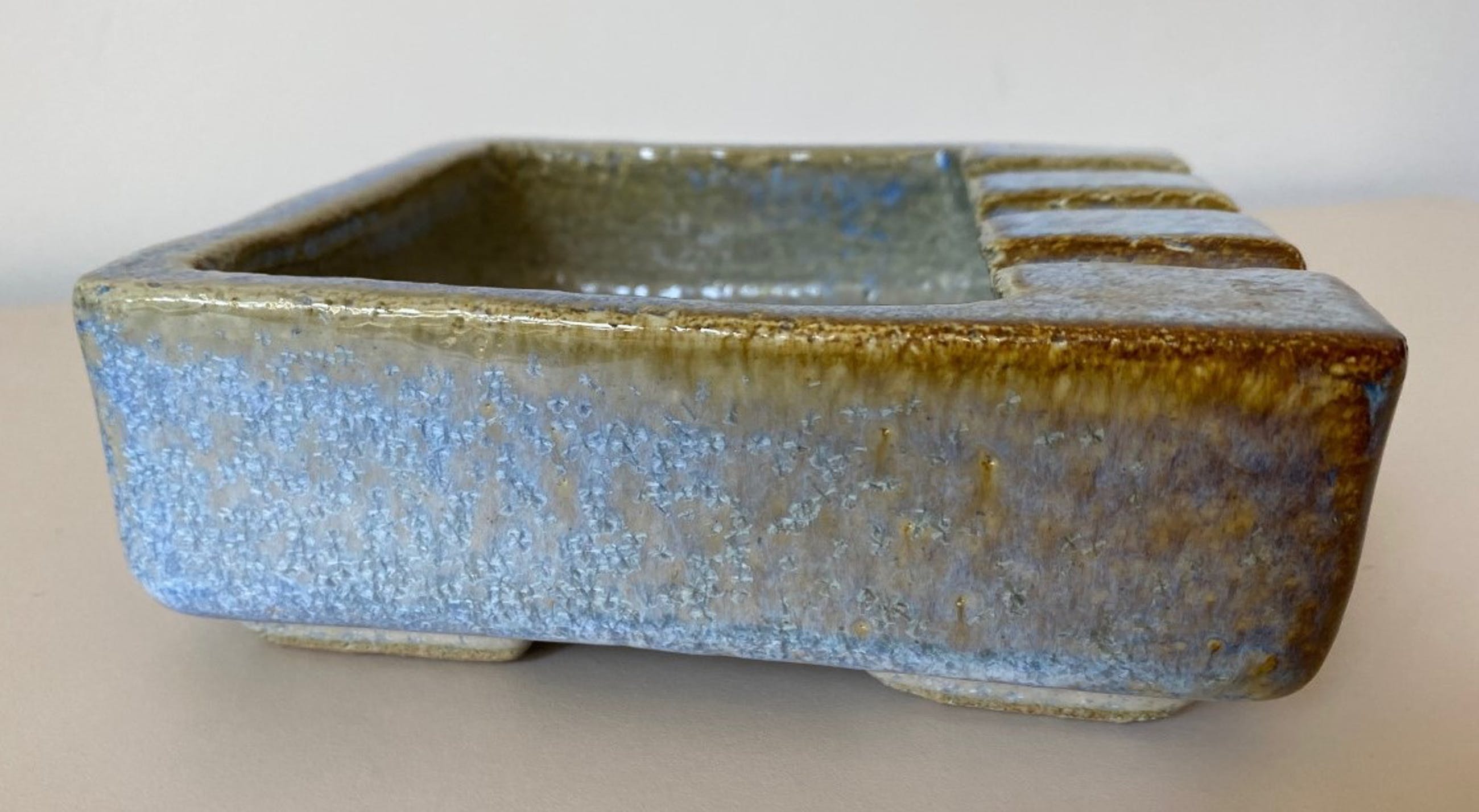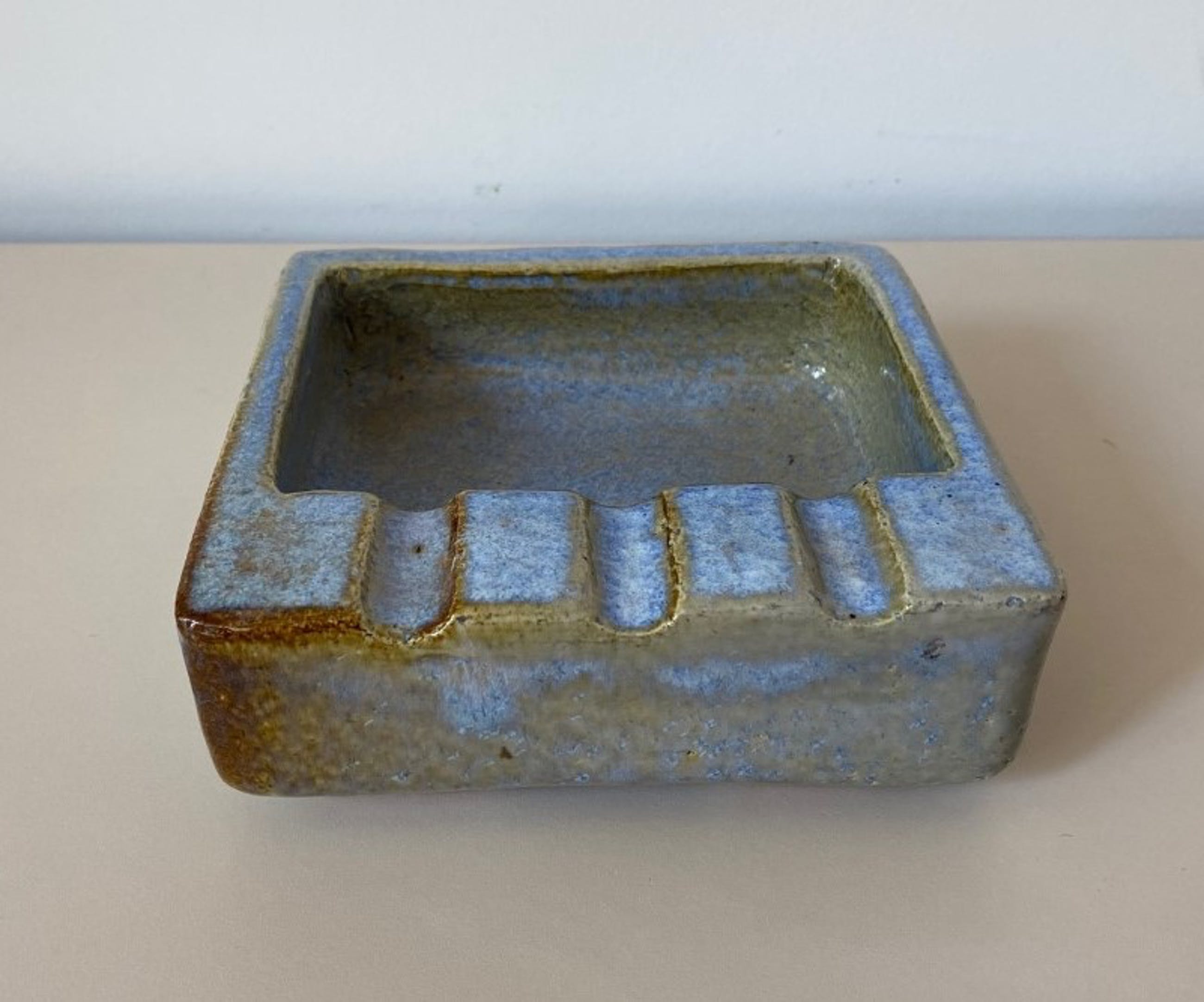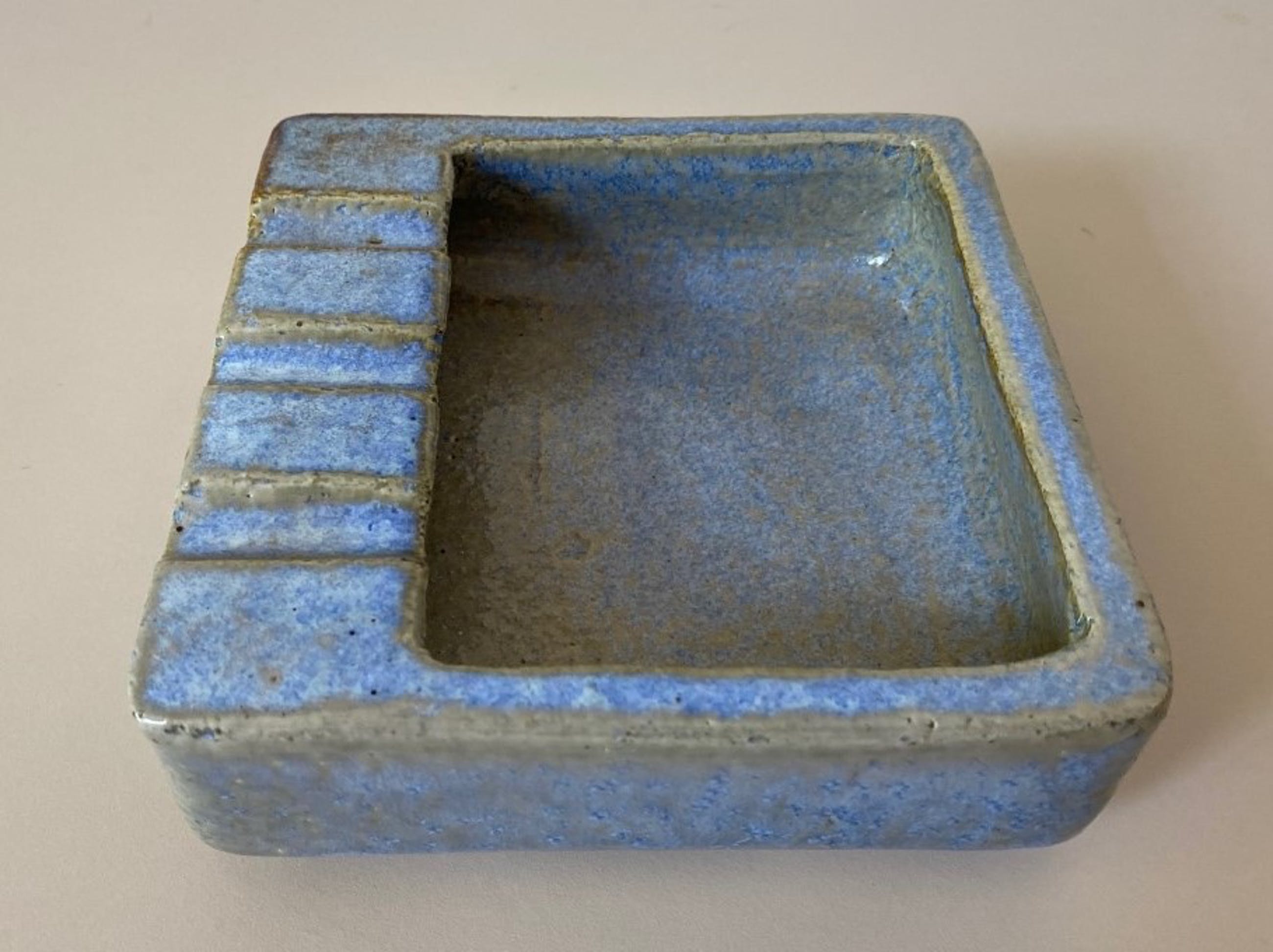 Asbak met lichtblauw kristalline glazuur uitgevoerd bij Potterij Zaalberg uit Leiderdorp. In prima onbeschadigde conditie en voorzien van ingedrukt merk aan de onderzijde.