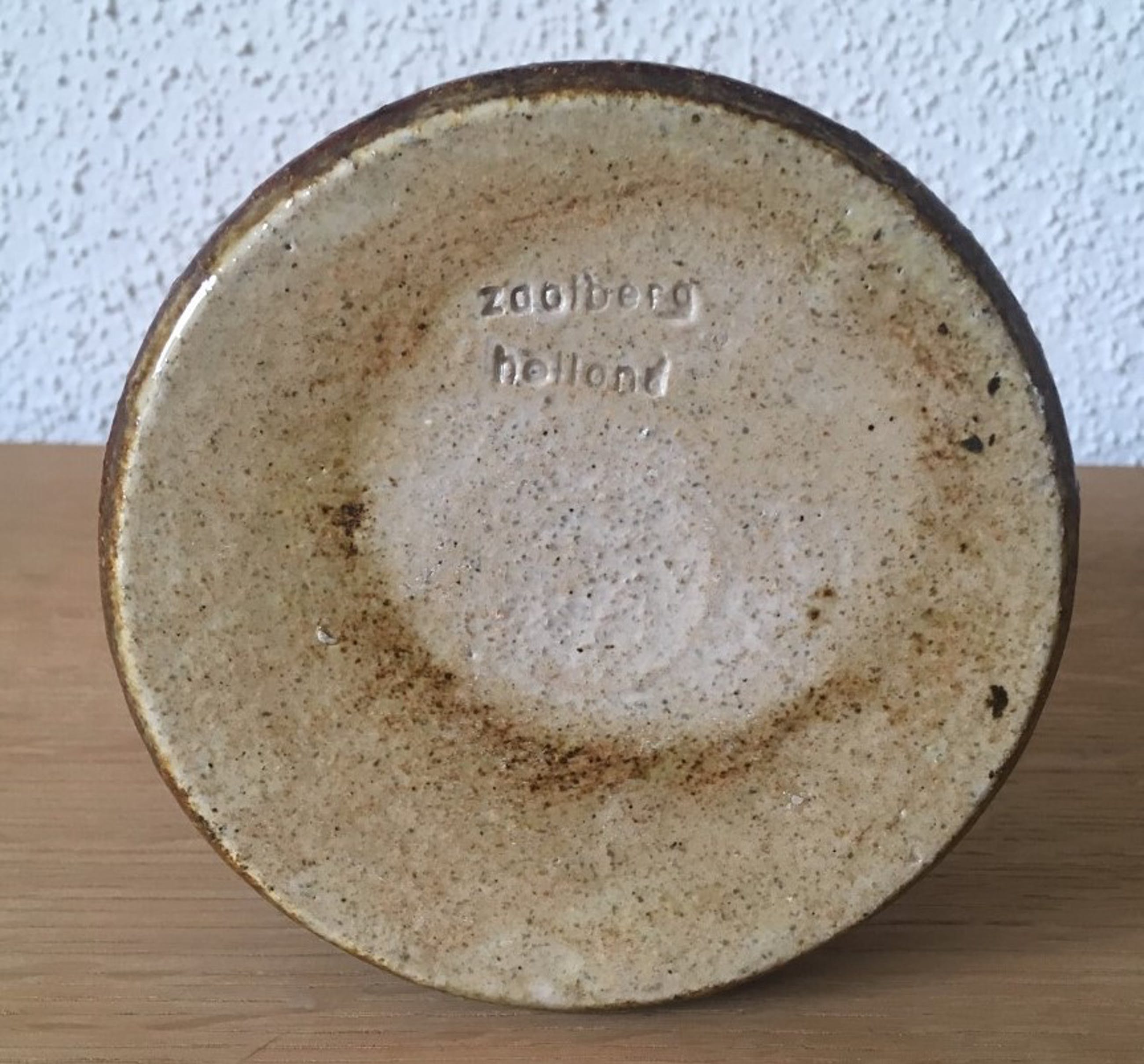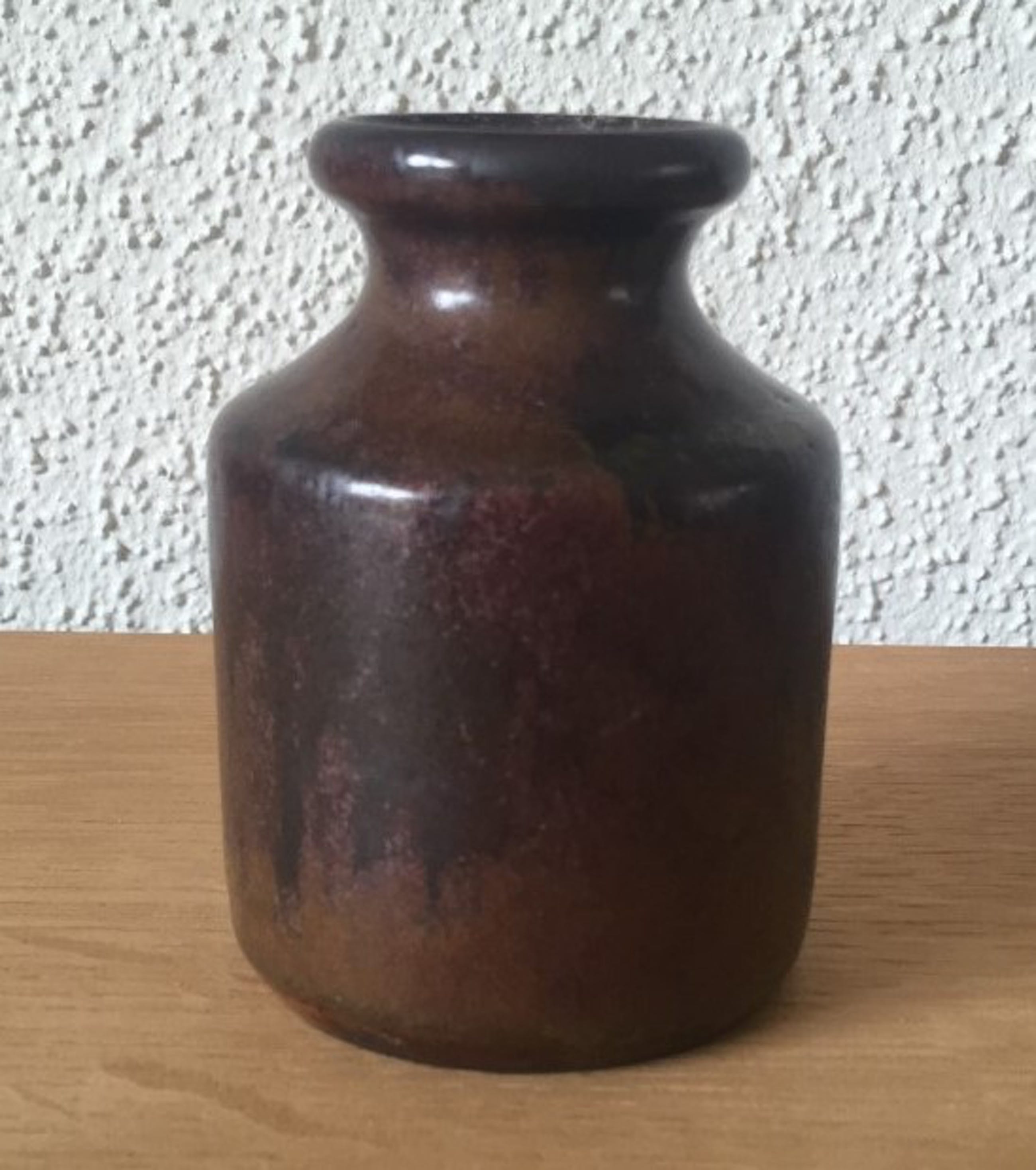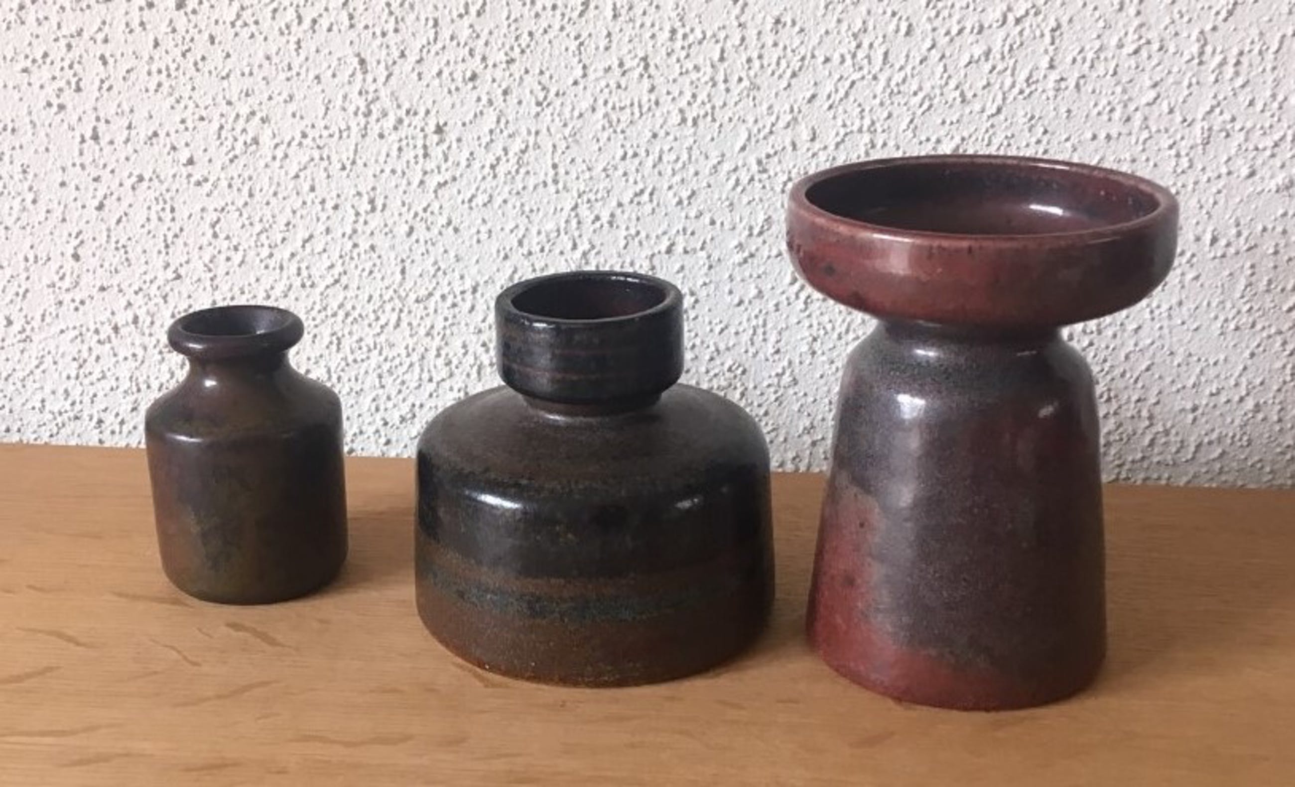 Drie vaasjes in bruin- rood en aarde tinten van Potterij Zaalberg uit Leiderdorp dan wel Zoeterwoude. Alle drie onbeschadigde conditie een voorzien van een ingedrukt blindmerk. Afmetingen twee kleinere vaasjes; 11 cm hoog, 11 cm diameter9 cm hoog en 6 cm diameter