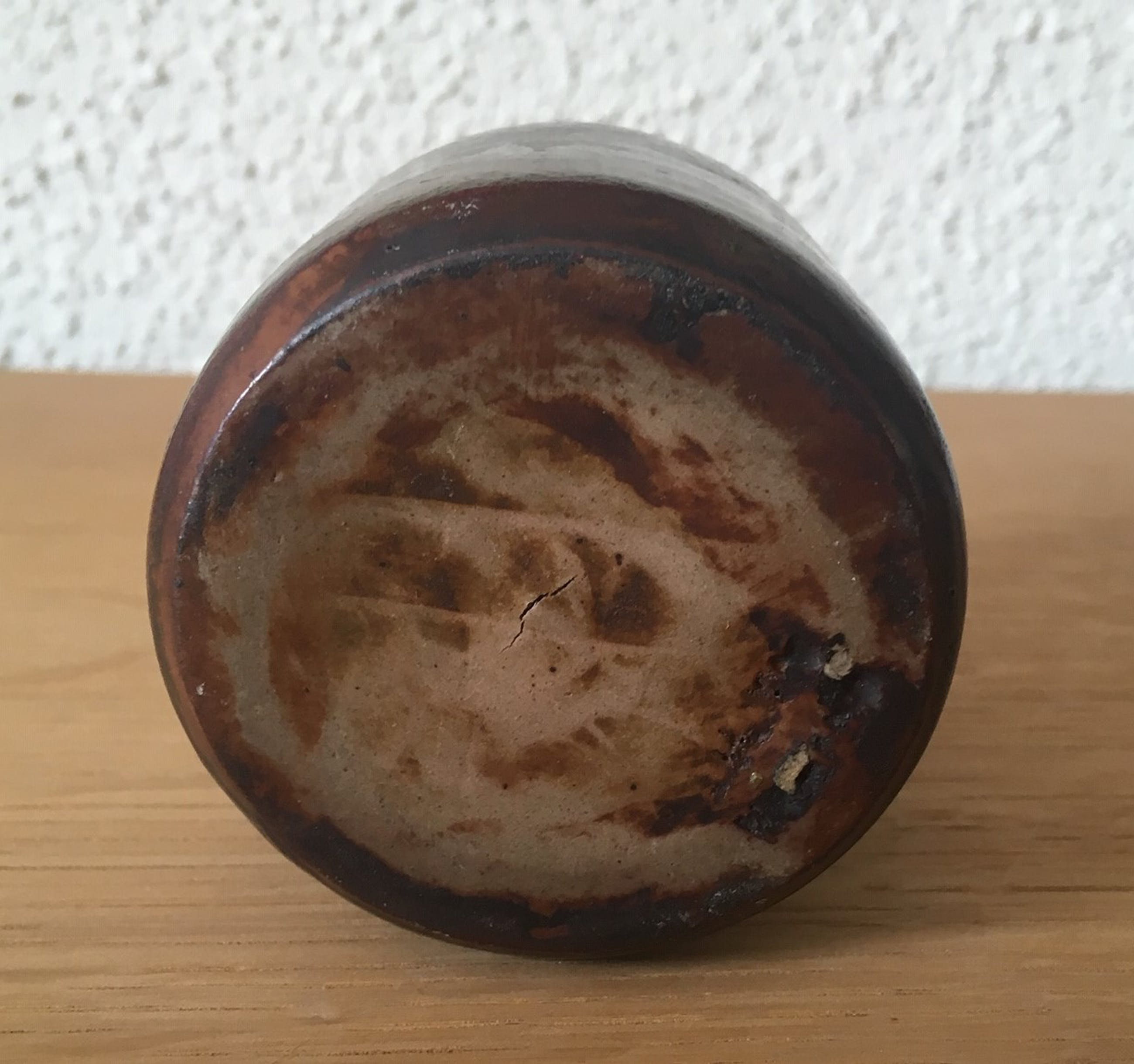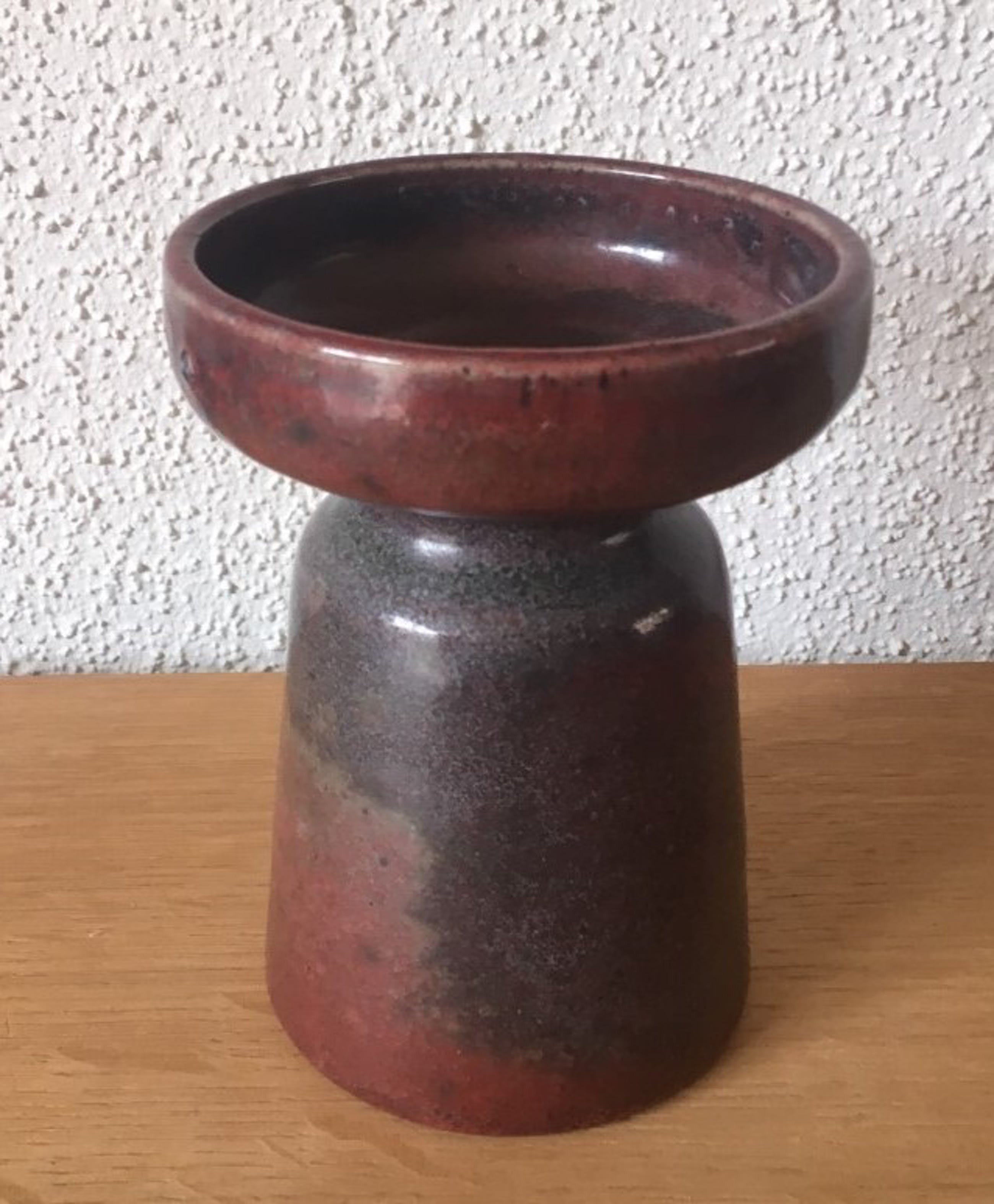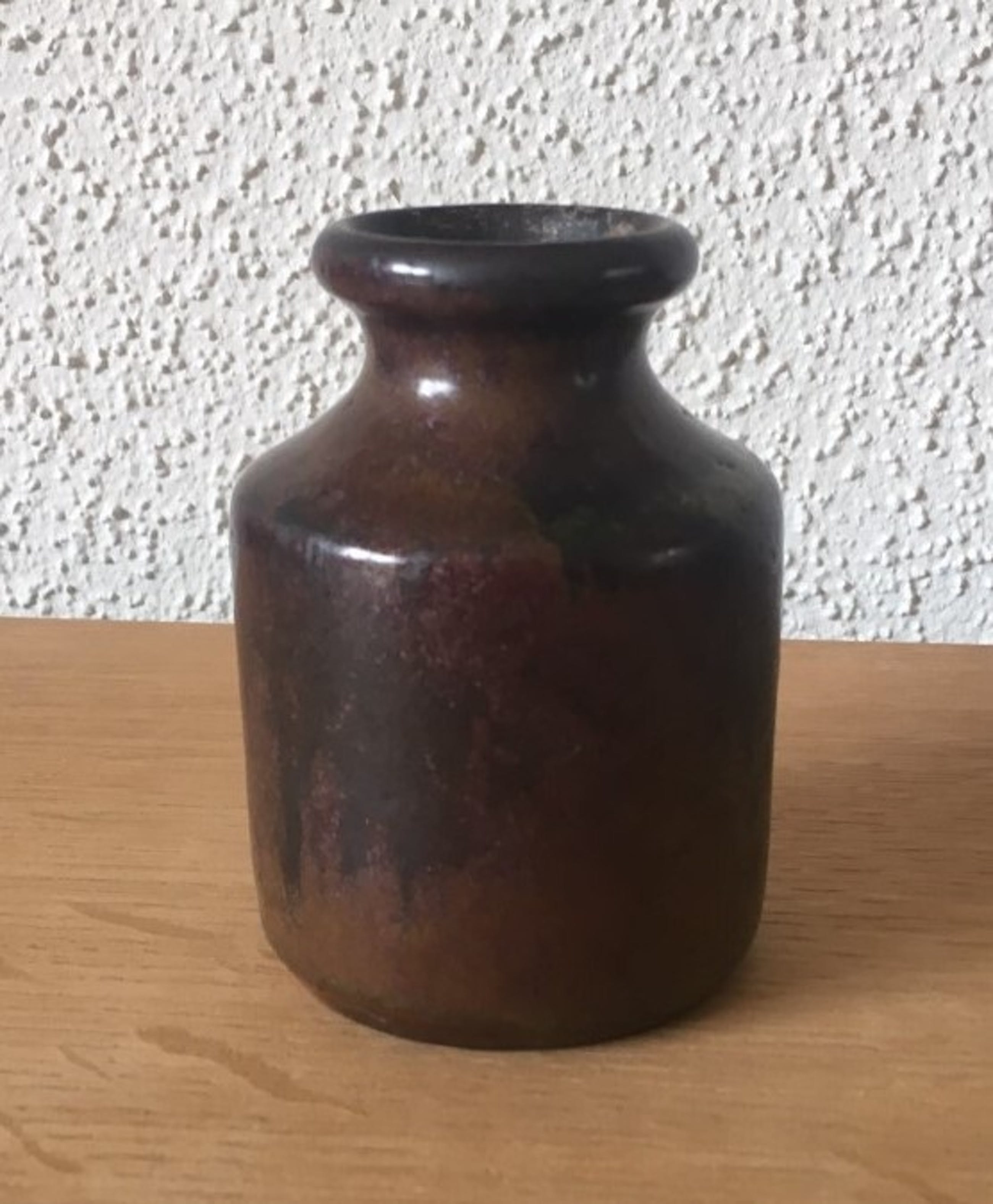 Drie vaasjes in bruin- rood en aarde tinten van Potterij Zaalberg uit Leiderdorp dan wel Zoeterwoude. Alle drie onbeschadigde conditie een voorzien van een ingedrukt blindmerk. Afmetingen twee kleinere vaasjes; 11 cm hoog, 11 cm diameter9 cm hoog en 6 cm diameter