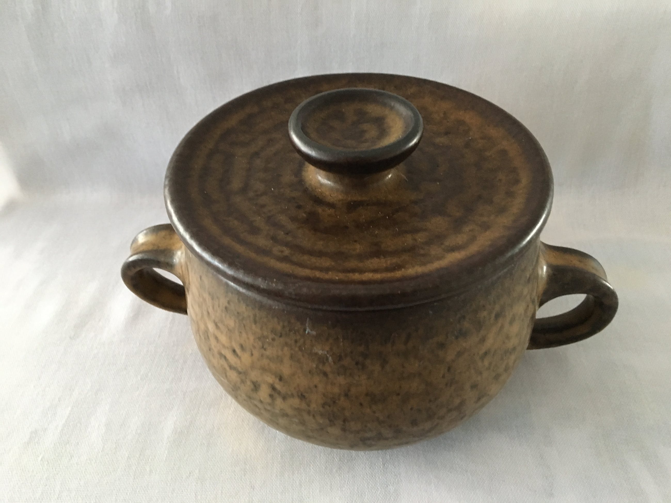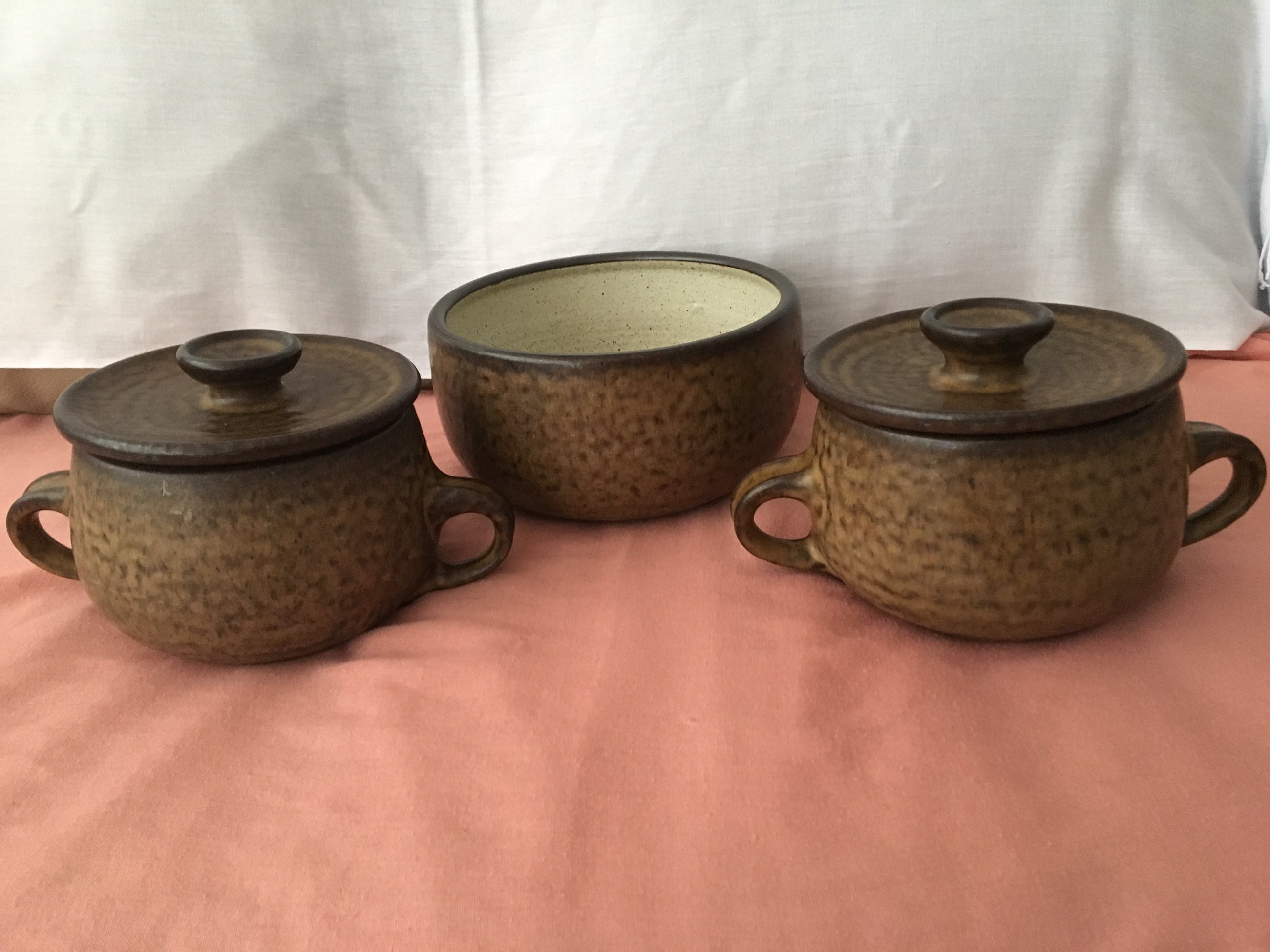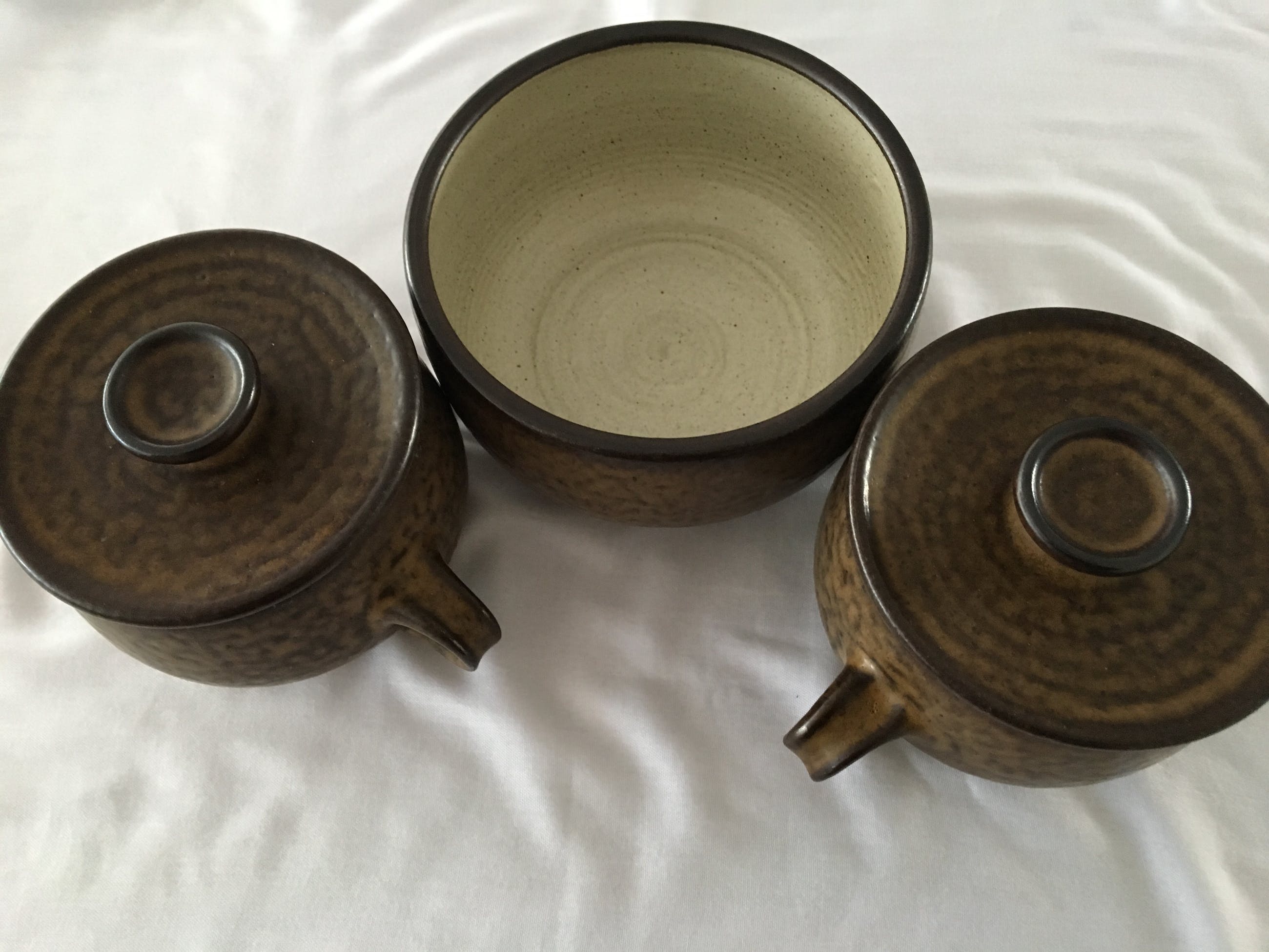 Een 3 selige set van Potterij Zaalberg Holland in bruine aardetinten. Set bestaat uit 2 schalen / serveerpannen met deksel en een grotere open schaal. Helemaal gaaf en onbeschadigd. Alle drie voorzien van een ingedrukt blindmerk. De schalen met deksel hebben een diameter van 15cm en 11cm hoog. Wegen rond de 1100 Gr. De schaal zonder deksel heeft een diameter van 21,5 en is 11cm hoog. Weegt 1300gr. Ontwerper: Meindert Huibert Zaalberg Dezelfde uit die serie staan in het Boijmans museum: https://www.boijmans.nl/collectie/kunstwerken/171244/model-e