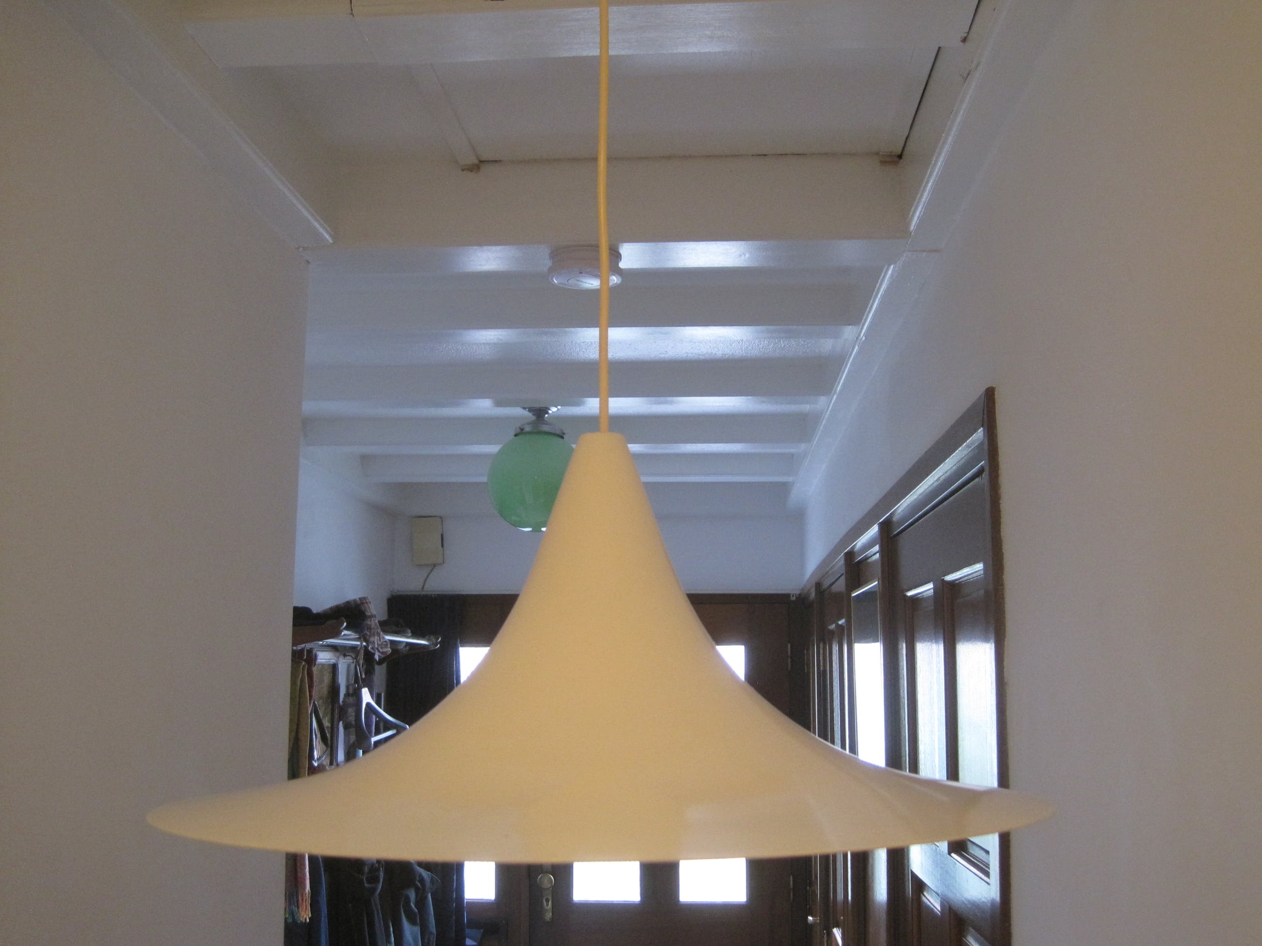 Grote 50 cm doorsnee aluminium heksenhoedlamp naar ontwerp van Poul Hennigsen. Poul Hennigsen is vooral bekend om zijn ontwerpen van space age lampen. Deze lamp verkeert in een hele gave staat en is een sieraad boven uw tafel.