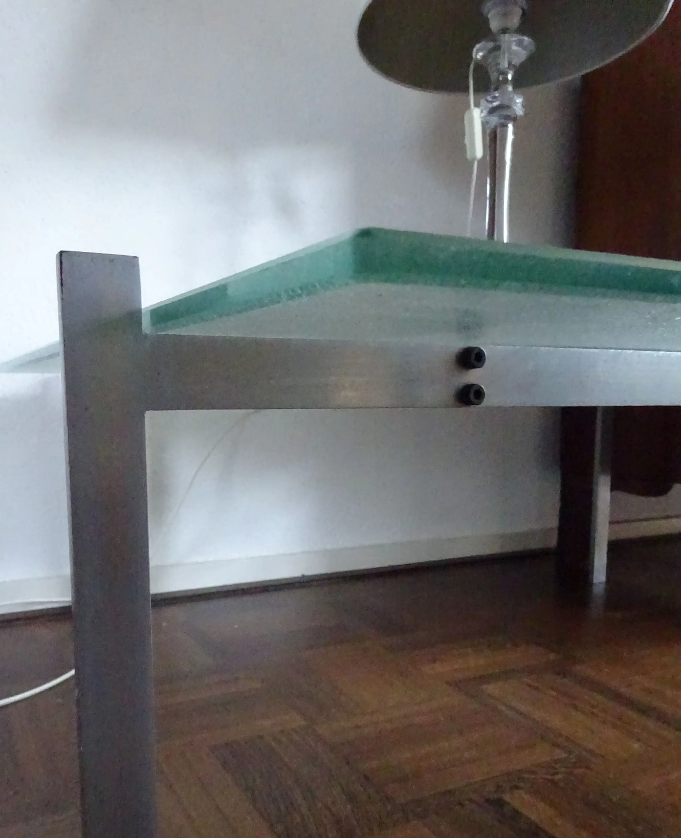 Scandinavische design salontafel van gehard glas en staal Ontwerp : Poul Kjaerholm 1929 - 1980 Uitvoering : Kold Christensen Afmeting. : 80 x 80 x 32 cm Gemerkt in het frame : Denemarken + TNO Serienummer : PK 61 Conditie : goede staat