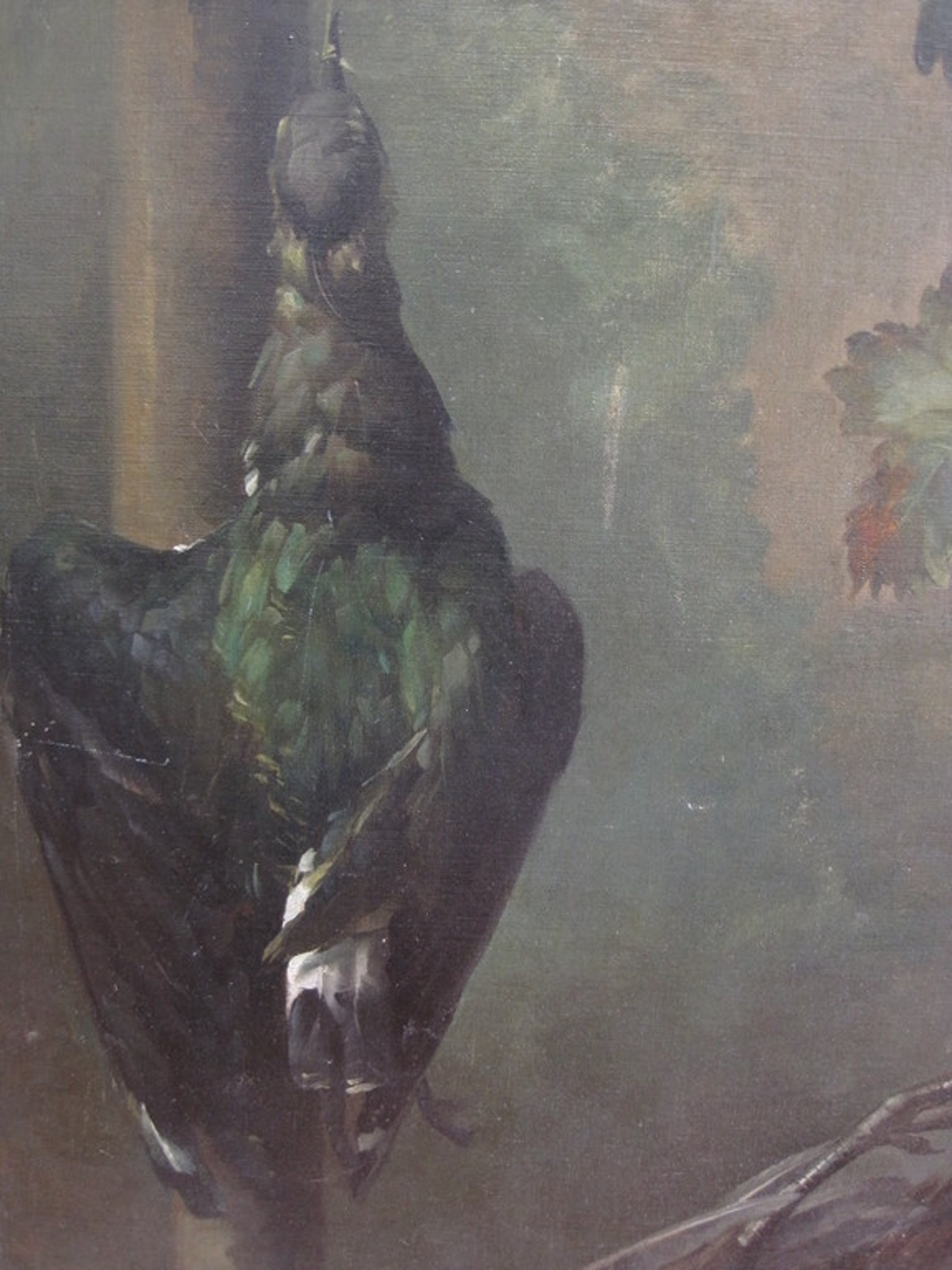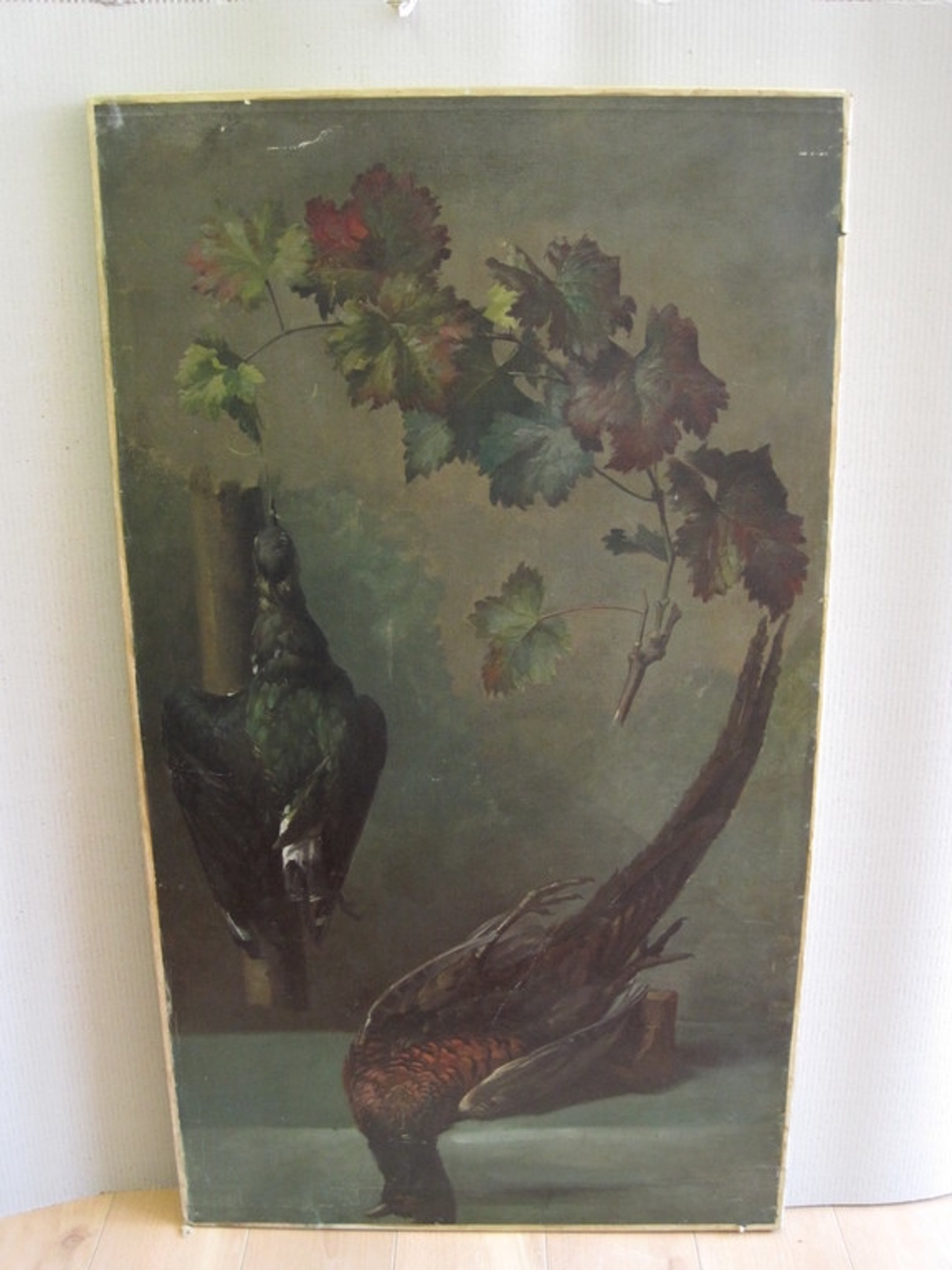 Groot olieverf op doek schilderij ( op board / gemaroufleerd ) met voorstelling van fazanten en bloesemtak. Indrukwekkende figuratieve kwaliteit waar geen signatuur op te vinden is.