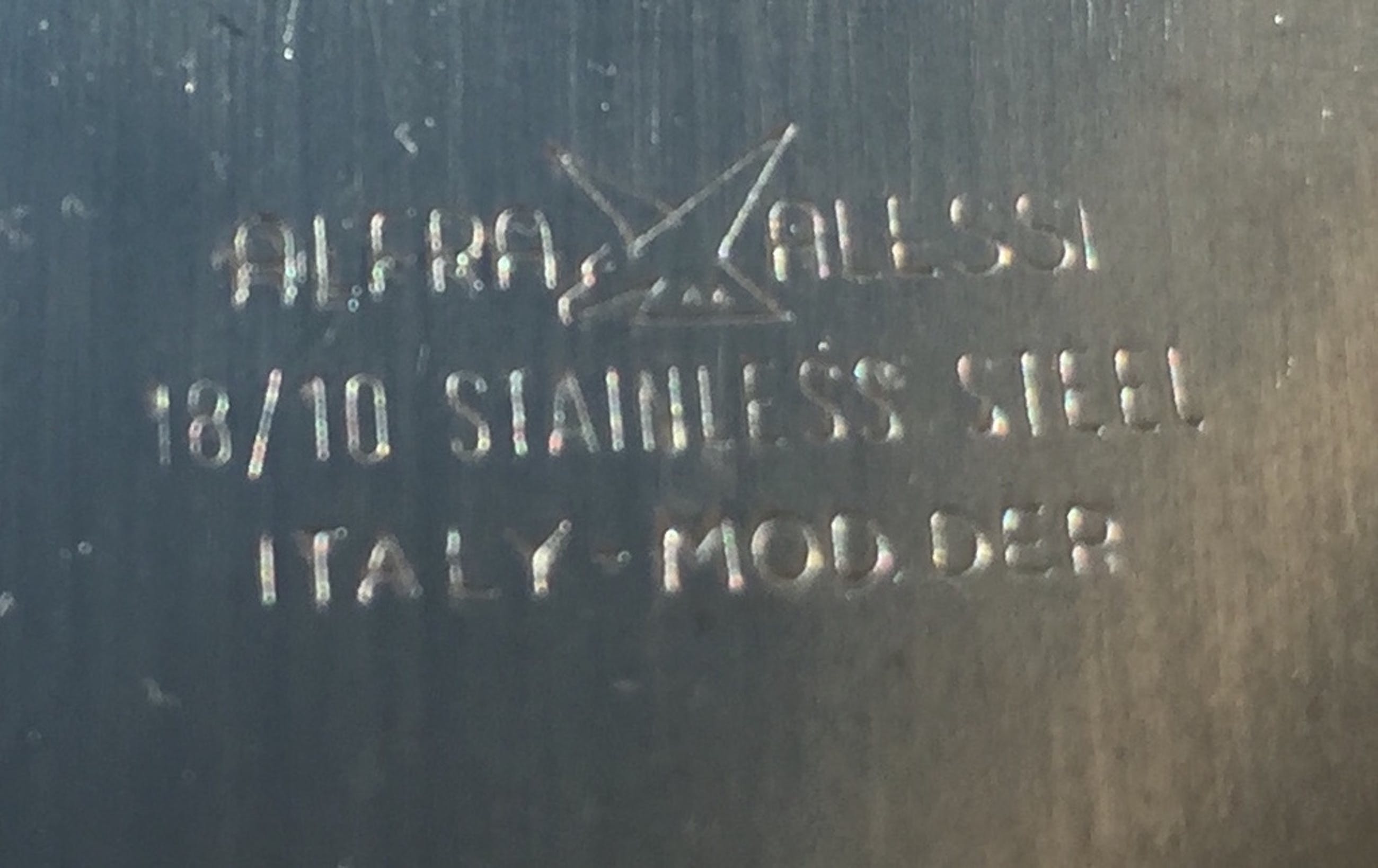 Alle drie zijn afzonderlijk gemerkt met de stempel die na 1947 gebruikt werd: Alfra Alessi met de adelaar daartussenin. Dit stempel is tot 1967 gebruikt. Buitenzijde gepolijst RVS, binnenzijde mat.