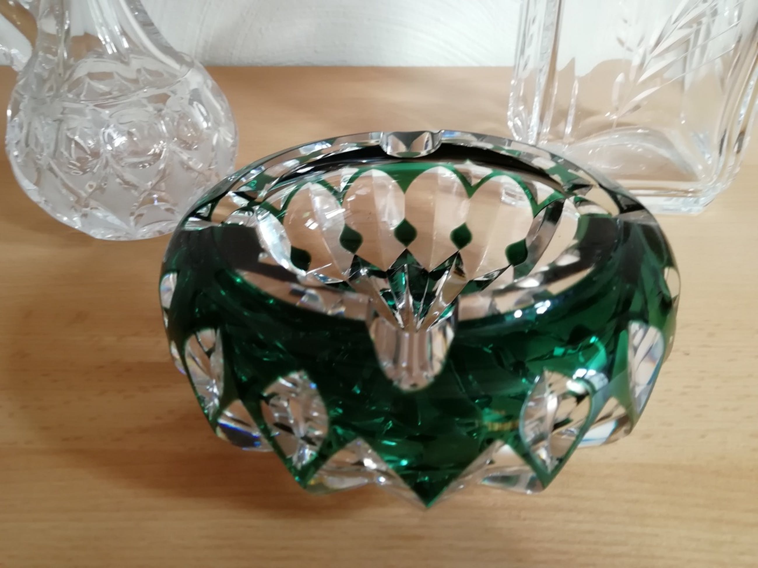 het lotje omvat : 2 kristallen karaffen afkomstig uit Frankrijk - 1 kristallen bloemen vaas afkomstig uit Frankrijk - 1 asbak van Val Saint Lambert,