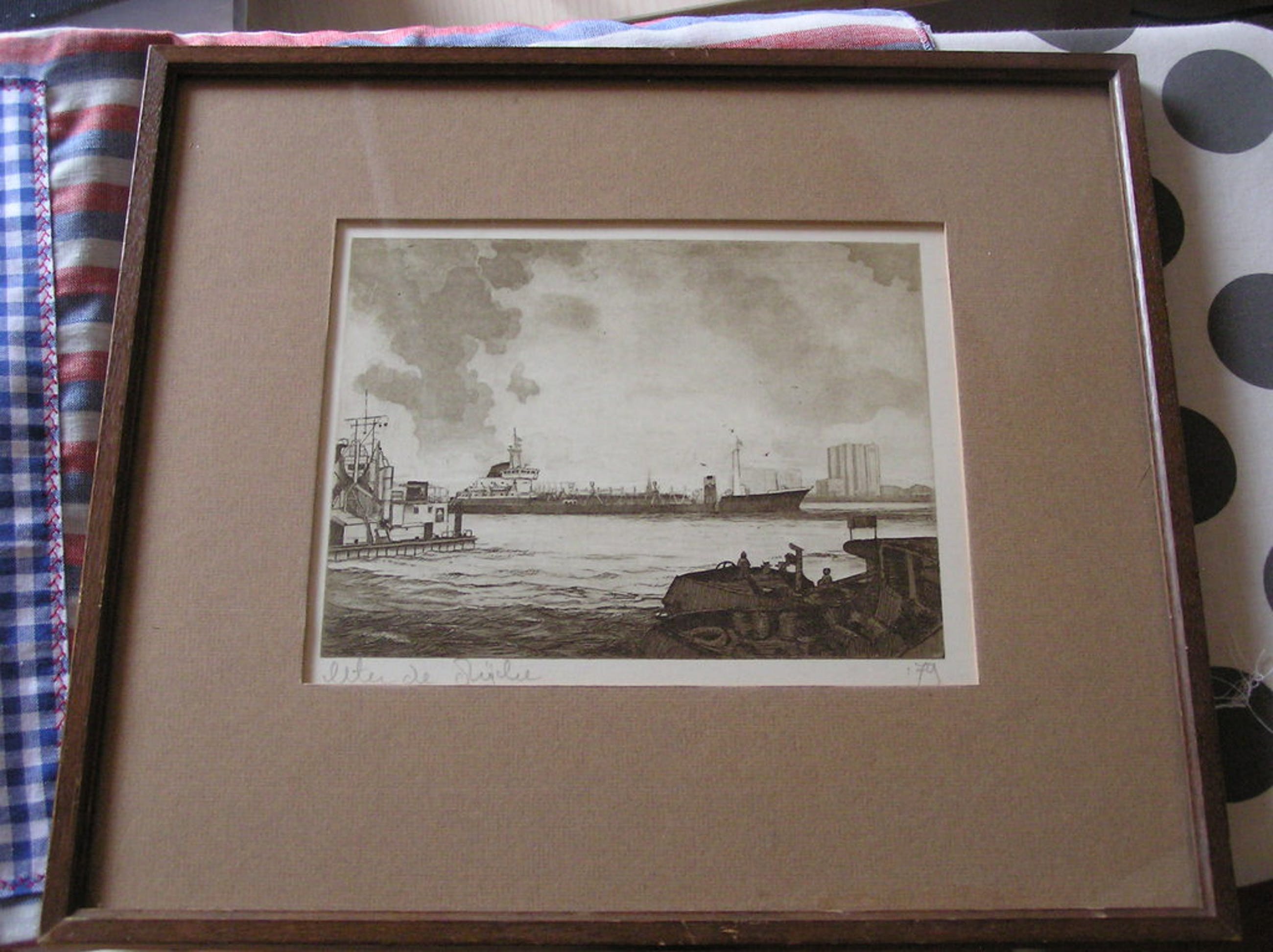 Ingelijste prent met afbeelding van de Geopotes XII varend op de Maas bij Rotterdam. Op de achtergrond het Volker Stevinhuis. De prent is in 1979 vervaardigd ter gelegenheid van \'125 jaar Volker Stevin Baggeren\'.