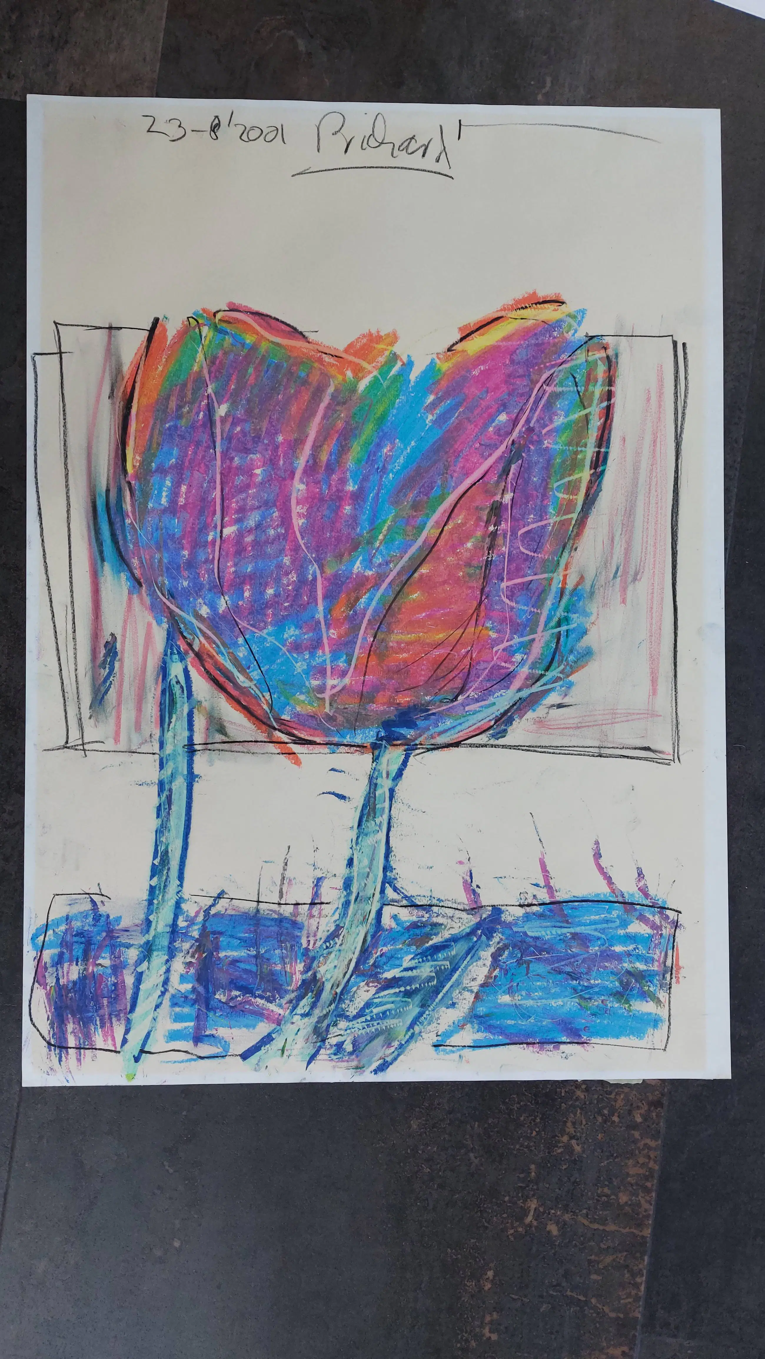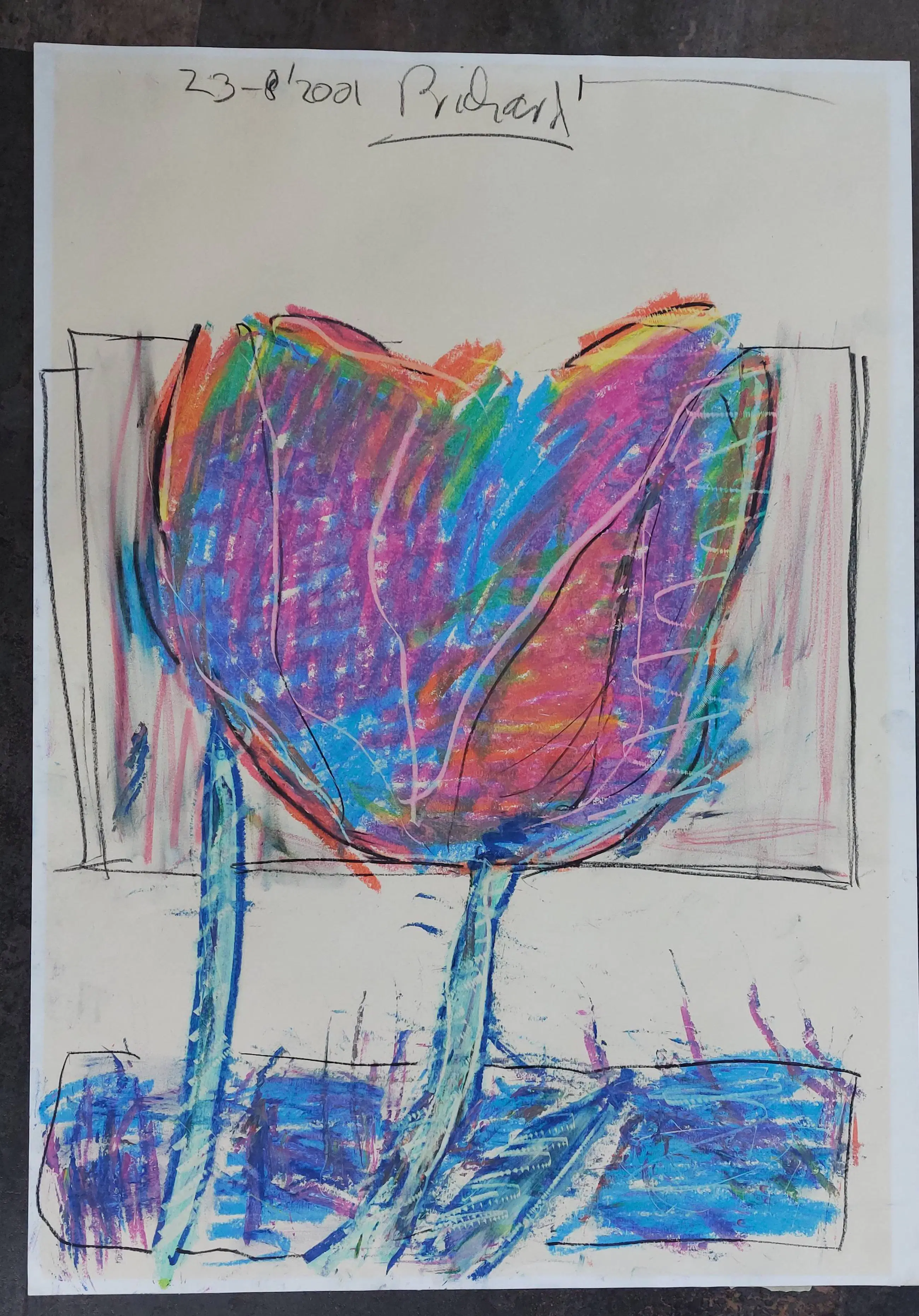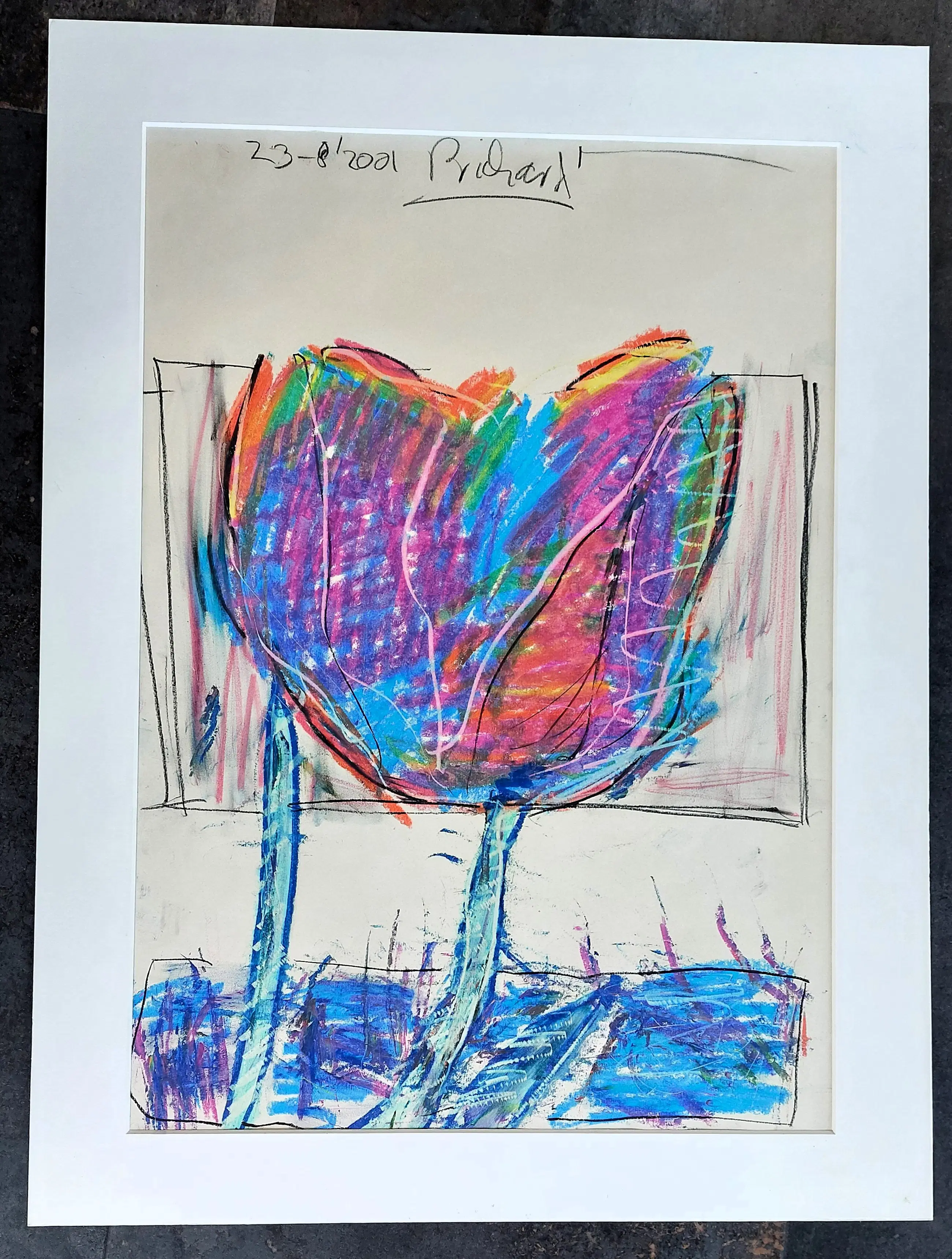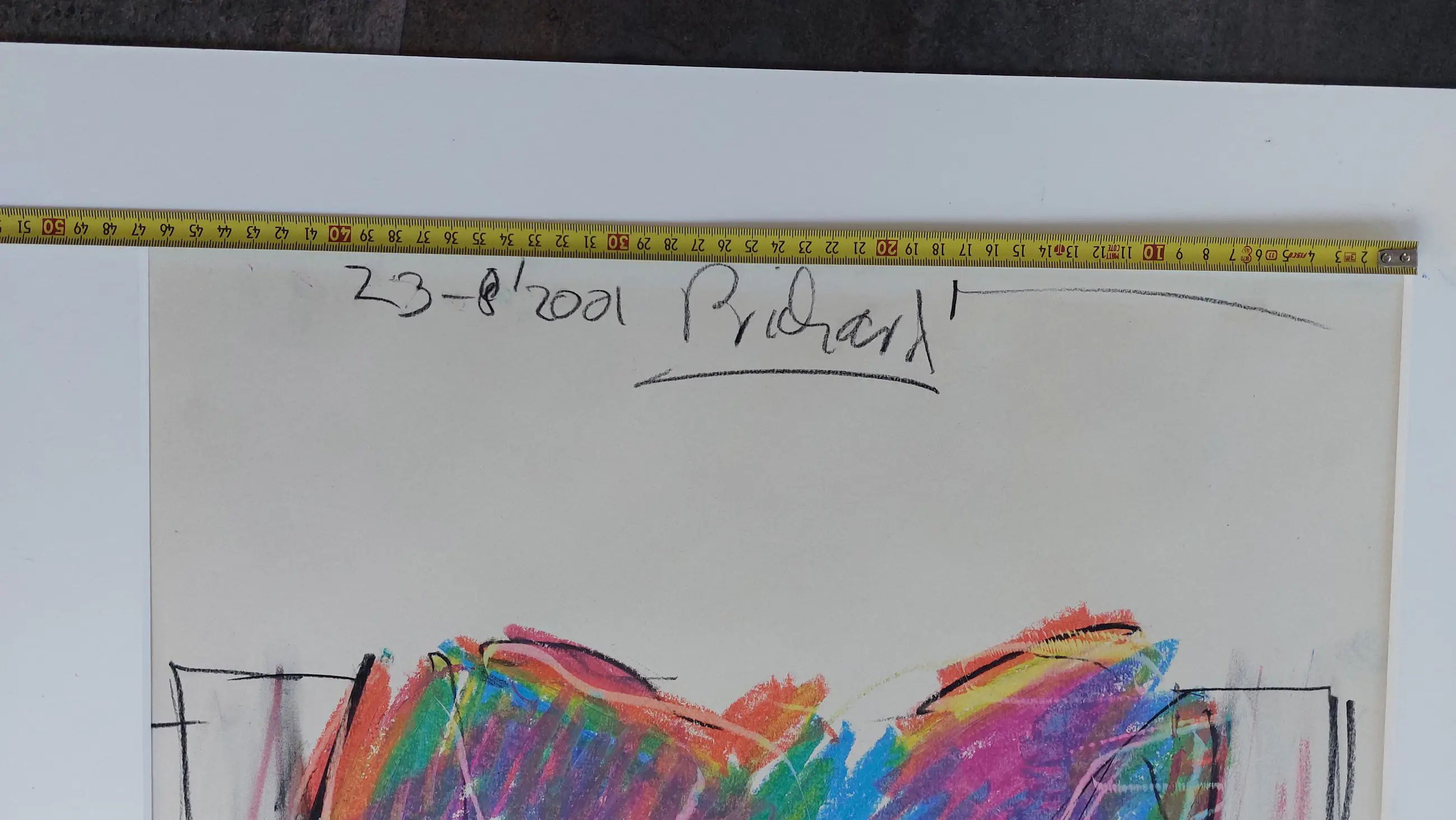 Kunstwerk is gekocht in een galerie in Vught. Daar hingen op dat moment meerdere vergelijkbare werken van Prichard Deze 'riep' ons met zijn mooie kleuren..