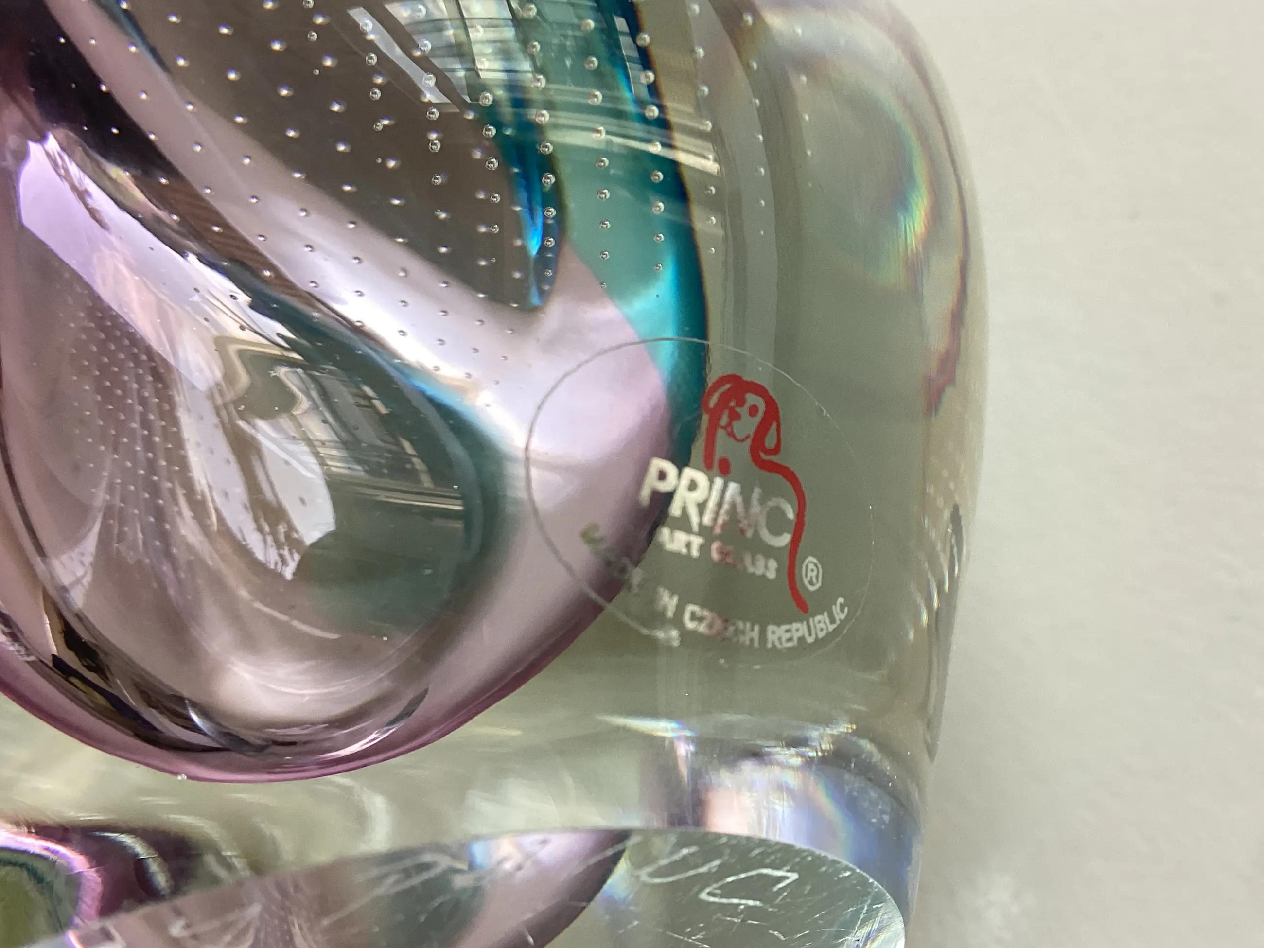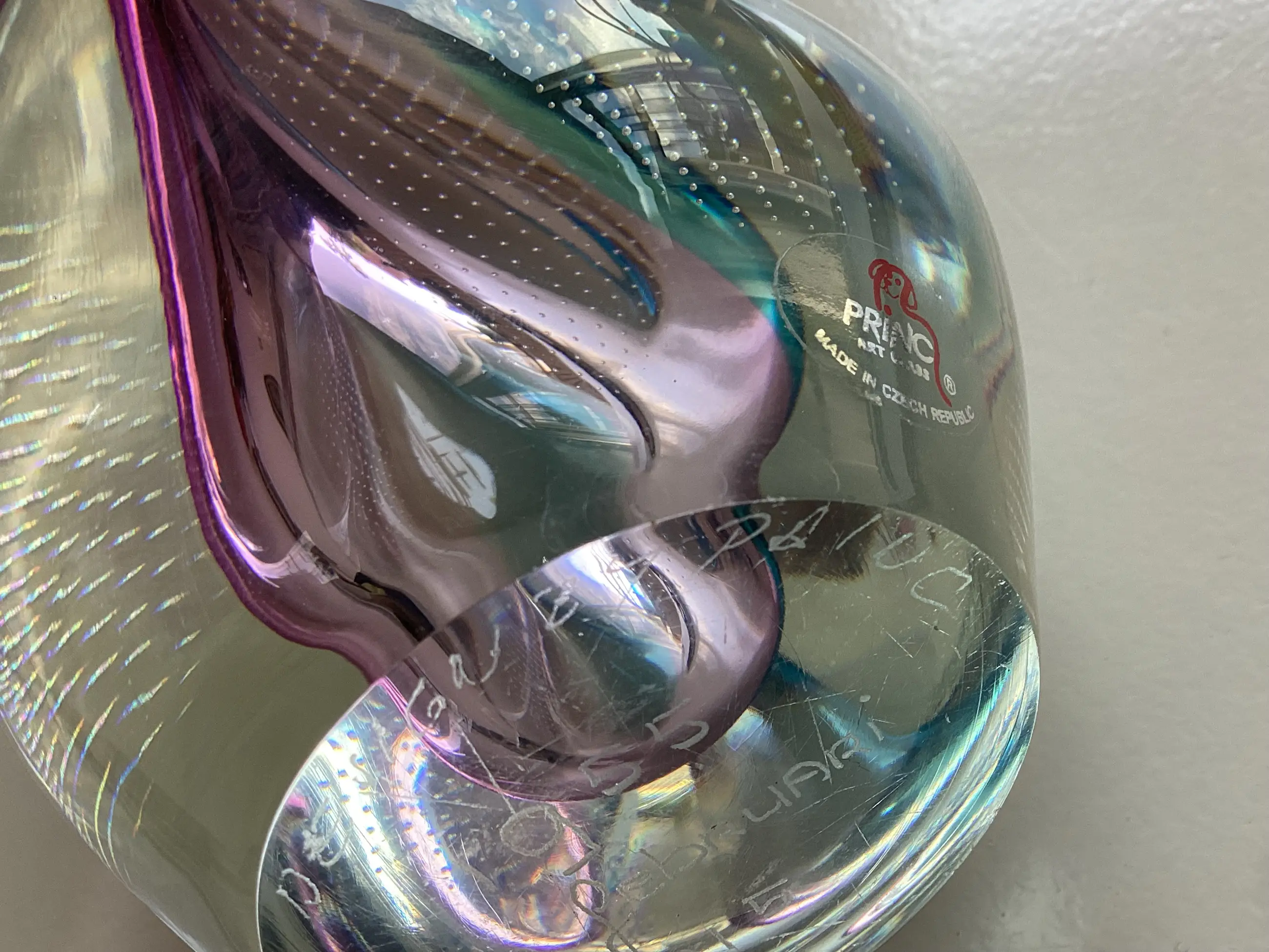 Robuuste kristallen druppel. Transparant met blauw en paars binnenwerk, plus rooster van gecontroleerde luchtbellen. Onderaan met label ‘Princ Art Glass, Made in Czech Republic’ Onderop hand gesigneerd met naam designer en 1955 - 16 februari - 2015. Hoogte 23 cm, Max breedte 11 cm, gewicht 2400 gram. Helder glas met enkele nauwelijks waarneembare zeer minimale gebruikssporen.