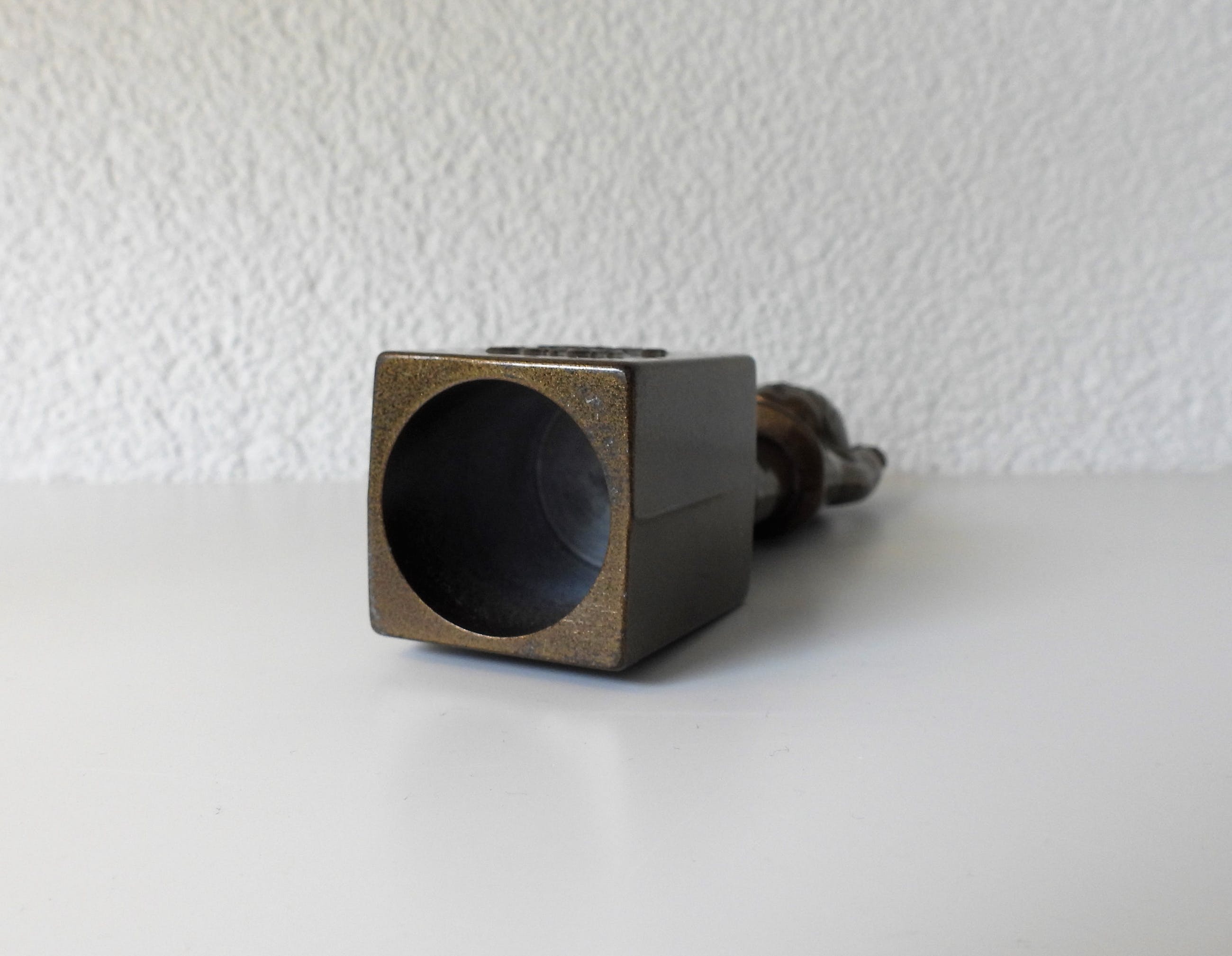 Metaal met een glanzende brons laag. Voetje is van binnen hol.